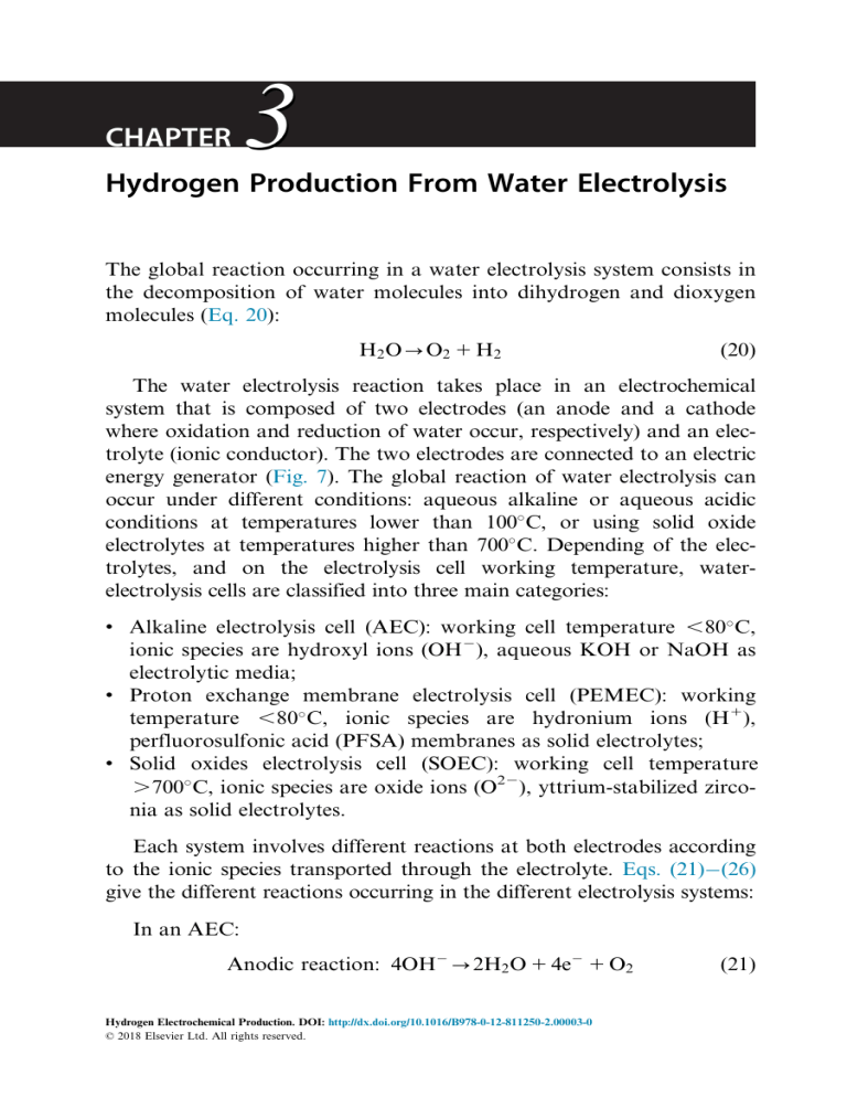 electrolytes at temperatures higher than 700 C. Depending of the electrolytes, and on the electrolysis cell working temperature, waterelectrolysis cells are classified into three main categories: