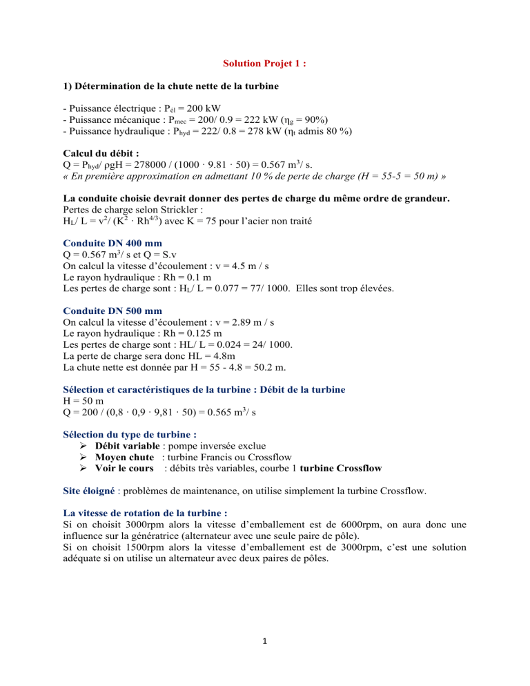 Solution Projet 1 : 1) Détermination de la chute nette de la turbine - Puissance électrique : Pél = 200 kW - Puissance mécanique : Pmec = 200/ 0.9 = 222 kW (ηg = 90%) - Puissance hydraulique : Phyd = 222/ 0.8 = 278 kW (ηt admis 80 %) Calcul du débit : Q = Phyd/ ρgH = 278000 / (1000 · 9.81 · 50) = 0.567 m3/ s. « En première approximation en admettant 10 % de perte de charge (H = 55-5 = 50 m) » La conduite choisie devrait donner des pertes de charge du même ordre de grandeur. Pertes de charge selon Strickler : HL/ L = v2/ (K2 · Rh4/3) avec K = 75 pour l’acier non traité Conduite DN 400 mm Q = 0.567 m3/ s et Q = S.v On calcul la vitesse d’écoulement : v = 4.5 m / s Le rayon hydraulique : Rh = 0.1 m Les pertes de charge sont : HL/ L = 0.077 = 77/ 1000. Elles sont trop élevées. Conduite DN 500 mm On calcul la vitesse d’écoulement : v = 2.89 m / s Le rayon hydraulique : Rh = 0.125 m Les pertes de charge sont : HL/ L = 0.024 = 24/ 1000. La perte de charge sera donc HL = 4.8m La chute nette est donnée par H = 55 - 4.8 = 50.2 m. Sélection et caractéristiques de la turbine : Débit de la turbine H = 50 m Q = 200 / (0,8 · 0,9 · 9,81 · 50) = 0.565 m3/ s Sélection du type de turbine : ➢ Débit variable : pompe inversée exclue ➢ Moyen chute : turbine Francis ou Crossflow ➢ Voir le cours : débits très variables, courbe 1 turbine Crossflow Site éloigné : problèmes de maintenance, on utilise simplement la turbine Crossflow. La vitesse de rotation de la turbine : Si on choisit 3000rpm alors la vitesse d’emballement est de 6000rpm, on aura donc une influence sur la génératrice (alternateur avec une seule paire de pôle). Si on choisit 1500rpm alors la vitesse d’emballement est de 3000rpm, c’est une solution adéquate si on utilise un alternateur avec deux paires de pôles. 1 La vitesse spécifique est donnée par : nq = n Q1 / 2 H 3/ 4 D’où nq = 1500. (0,55)0,5/500,75 =1500.0,74.18,8 = 59,04 La hauteur d’aspiration : Hs = hatm – hpvs -σ.Hn = 9 – 0,1 – 0,13.50 = 2,4m D’après l’énoncé, le maitre d’ouvrage aurait installé la turbine avec une hauteur d’aspiration maximum : Hsmax = 3.0m. Dans de cas, il n’y pas de problème de cavitation. Turbine Crossflow admise. Note : La turbine Francis peut être considérée, mais elle sera arrêtée 200 jours / année (débits d’étiage) : (80 - 120 l / s = 15 - 22% de Qmax). Estimation de la puissance électrique de la turbine Crossflow : La puissance hydraulique est exprimée par : Phyd = ρgQH = 9,81QH (KW) La puissance électrique est exprimée par : Pél = Phy . η (rendement global = η = ηt . ηg) Jours 100 60 200 Hb (m) 55 55 55 HL (m) 4.8 1 0.1 Hn(m) 50.2 54 54.9 Q (m3/s) 0.55 0.25 0.1 Q/Qmax η/ηmax ηt ηg η Pél (KW) 100 45 18 100 98 88 0.8 0.78 0.7 0.9 0.9 0.85 0.72 0.7 0.62 201 92.5 32 Estimation de la production électrique : Jours 100 60 200 heures Puissance (kW) 2400 201 1440 92.5 4800 32 TOTAL 2 Production (kWh) 48200 133000 154000 769000 KWh Solution du Projet 2 : Sélection et caractéristiques de la turbine : Pression à l’amont de la turbine = constante = 75 m donc : Hn = 75 m Perte de charge de la conduite : HL = Hb - Hn = 100 -75 = 25 m Longueur de la conduite : L = 5000 m Perte par 1000 m de la conduite : 5 m Diamètre : DN 300 Formule de Strickler : HL/L = v2/ (K2 · Rh4/3) HL/L = 5/ 1000 K = 90 et Rh = D/ 4 = 0.075 m K2 · Rh4/3 = 256 v = (0.005 · 256)1/2 = 1.13m/s Q = v . Π . D2 / 4 = 1.13 .Π. (0.3)2/ 4 = 0.080 m3/ s = 80 l / s = 288 m3/h = 0,08 m3/s Type de turbine : Pelton, Francis Pompe inversée mono- ou multiétages Types possibles de fonctionnement : a) Turbine Pelton ou Francis réglées pour maintenir la pression amont constante en variant le débit par un régulateur (solution la plus coûteuse). b) Pompe inversée travaillant à débit fixe par intermittence en utilisant le volume tampon des réservoirs, étant donné que ces derniers sont très grands (solution la plus économique). Production énergétique de la pompe inversée : Eté Hiver Total Volume utile(m3) 5000 4000 Débit(m3/h) 288 288 Temps de fonctionnement (heures) 180j×17.4h/j=3125 180j ×13.9h/j = 2500 5625 heures Rendement de la pompe inversée (page 93) : ηt = 0.80 = 80% Pmec = 9.81 x 75 x 0.080 x 0.8 = 47 kW Pel = ηg · Pmec = 0.9 x 47 = 42.4 kW Production annuelle d’énergie : 42.4 x 5625 = 239 000 kWh/année 3 Solution du Projet 3 : Sélection et caractéristiques de la turbine : - Calcul de la chute nette H : Débit Q = 2.0 m3/ s Vitesse d’écoulement : v = Q. 4 /ΠD2 = 2.55 m / s Pertes de charge calculées : HL = 1.47 m Charge dans la centrale versus niveau de l’eau aval min 18 1.47 16.53 La hauteur de chute brute (m) Perte de charge (m) Hauteur de Chute nette (m) moyen 20 1.47 18.53 max 21 1.47 19.53 Puissance hydraulique : Phyd = ρgQHn = 9.81 · 2 · 18.53 = 364 kW Type de turbine : Francis ou Crossflow ou le débit étant constant, Pompe inversée Rendement probable (page 93) : Francis : η = 90% Crossflow : η = 84% Pompe inversée : η = 90% Turbine recommandée : Francis à aubes directrices fixes ou pompe inversée à double flux Vitesse de rotation de la turbine Francis : Hauteur d’aspiration Pour Hbmin : Hs = 0.5 m (données) Pour Hs = 0.5 m + Hb - Hbmin min La hauteur de chute brute (m) Hauteur d’aspiration Hs (m) 18 0.5 moyen 20 2.5 Coefficient de cavitation = (Ha - Hv - Hs) /H Ha = 9.50 m (altitudes 500 m) Hv = 0.24 m (températures 20°) Pour Hmax et Hsmax : σ = (9.5 - 0.24 - 3.5) / 19.53 = 0.30 D’après le diagramme, on a pour σ = 0.3 la vitesse spécifique est de nq = 100 Pour H = 18.53 m et Q = 2.0 m3/s on obtient : Vitesse de rotation : n = nq · H3/4/Q1/2 = 631 t /min 4 max 21 3.5 Une vitesse plus basse peut être adoptée (nq devient plus petit, donc Hs admissible plus grand). La vitesse synchrone la plus proche qui permette l’entraînement direct du générateur par la turbine est : n = 600 t / min. Production d’énergie : Puissance 
