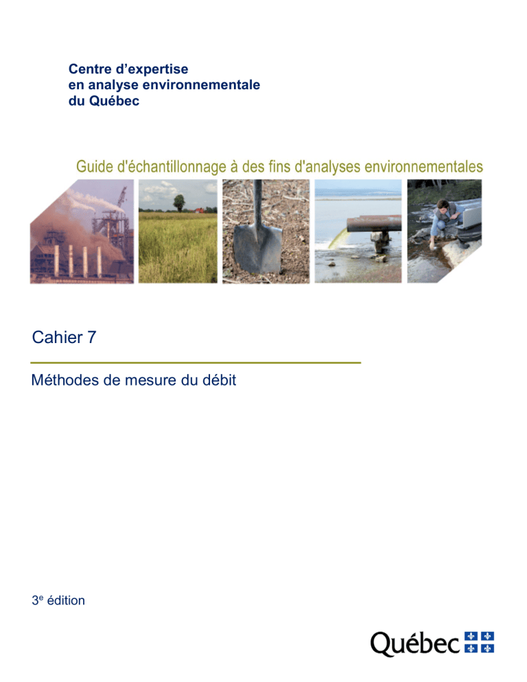 Centre d’expertise en analyse environnementale du Québec Cahier 7 Méthodes de mesure du débit 3e édition 1 Coordination et rédaction : Manon Bernard Direction des eaux usées Direction générale des politiques de l’eau Note au lecteur : les renseignements relatifs aux marques déposées ou aux produits commerciaux ne sont donnés qu’à titre indicatif; des produits équivalents peuvent leur être substitués. Pour toute information complémentaire sur les activités du Centre d’expertise en analyse environnementale du Québec ou pour vous procurer nos documents, veuillez consulter notre site Web à l’adresse suivante : www.ceaeq.gouv.qc.ca ou communiquer avec nous : Centre d’expertise en analyse environnementale du Québec 2700, rue Einstein, bureau E.2.220 Québec (Québec) G1P 3W8 Téléphone : Télécopieur : Courriel : 418 643-1301 418 528-1091 [email protected] La série Guide d’échantillonnage à des fins d’analyses environnementales comprend actuellement les cahiers suivants : Cahier 1 Généralités Cahier 2 Échantillonnage des rejets liquides Cahier 3 Échantillonnage des eaux souterraines Cahier 4 Échantillonnage des émissions atmosphériques en provenance de sources fixes Cahier 5 Échantillonnage des sols Cahier 6 Échantillonnage du fourrage pour l’analyse des fluorures Cahier 7 Méthodes de mesure du débit Cahier 8 Échantillonnage des matières dangereuses Référence à citer MINISTÈRE DE L’ENVIRONNEMENT ET DE LA LUTTE CONTRE LES CHANGEMENTS CLIMATIQUES, 2019. Guide d’échantillonnage à des fins d’analyses environnementales – Cahier 7 – Méthodes de mesure du débit, Québec, Centre d’expertise en analyse environnementale du Québec, 249 pages et 6 annexes. [En ligne] http://www.ceaeq.gouv.qc.ca/documents/publications/echantillonnage/debit_conduit_ouvC7.pdf Dépôt légal – Bibliothèque et Archives nationales du Québec, 2019 ISBN 978-2-550-84321-4 (PDF) (3e édition, 2019) ISBN 978-2-550-55291-8 Guide d’échantillonnage à des fins d’analyses environnementales ISBN 978-2-550-55292-5 Guide d’échantillonnage à des fins d’analyses environnementales (version anglaise) ISBN 978-2-550-55509-4 (PDF) (Édition : Août 2008) ISBN 978-2-550-55309-0 (publié précédemment par Les éditions le Griffon d’argile, ISBN 2-89443-075-2, 1re édition, 1998) © Gouvernement du Québec, 2019 AVANT-PROPOS Le cahier 7 du Guide d’échantillonnage à des fins d’analyses environnementales traite des techniques reconnues d’évaluation des débits et des volumes d’eau prélevés ou rejetés par les entreprises, industries, municipalités ou autres organismes détenteurs d’autorisations délivrées par le ministère de l’Environnement et de la Lutte contre les changements climatiques (MELCC) et qui doivent faire état de leurs prélèvements ou rejets d’eau au Ministère. Ce cahier traite des aspects théoriques et des bonnes pratiques à propos de la mesure du débit. Son contenu réunit des informations issues d’ouvrages techniques reconnus ou de l’expérience pratique de techniciens et professionnels collaborant au suivi environnemental au Québec. Il s’adresse aux personnes qui travaillent dans le domaine de la mesure du débit ou qui ont recours à ce type de services. Ce cahier a été écrit en vue de favoriser la compréhension des bases théoriques de la mesure du débit, ainsi que pour encadrer et uniformiser les méthodes de travail dans le but de faciliter les activités sur le terrain. La présente édition du cahier 7 constitue une mise à jour en profondeur de ce dernier. Cette édition tient compte des nouvelles technologies disponibles ainsi que des mises à jour des ouvrages de référence dans le domaine de l’hydrométrie, dont les normes publiées par l’Organisation internationale de normalisation (ISO). Plus complète que la version précédente, cette nouvelle édition couvre tous les types d’écoulement d’eau, qu’ils soient en conduite découverte ou sous pression. Depuis la première édition du cahier 7, différents commentaires ont été transmis par les utilisateurs. Ceux-ci ont été considérés pour la présente mise à jour du cahier en vue d’en améliorer le contenu et de l’adapter aux développements récents et aux réalités du travail sur le terrain. C’est pourquoi des professionnels du domaine de la mesure du débit ont été consultés. Nous tenons à les remercier très sincèrement pour leur contribution. Tout commentaire ou toute question concernant ce cahier peut être transmis à l’adresse suivante : [email protected]. Cahier 7 – Méthodes de mesure du débit i À PROPOS DU GUIDE D’ÉCHANTILLONNAGE À DES FINS D’ANALYSES ENVIRONNEMENTALES Le Guide d’échantillonnage à des fins d’analyses environnementales regroupe une série de cahiers traitant précisément de l’échantillonnage de divers milieux environnementaux. Il décrit un ensemble de bonnes pratiques qui régissent la planification et la réalisation des travaux d’échantillonnage et vise ainsi à assurer la qualité des prélèvements ainsi que la validité des données scientifiques qui en découlent. Il est donc un ouvrage de référence qui rassemble l’information générale sur les pratiques d’échantillonnage reconnues. Des règlements, directives, politiques ou autres documents relevant du ministère de l’Environnement et de la Lutte contre les changements climatiques (MELCC) font référence à un ou à plusieurs cahiers du guide. Le Centre d’expertise en analyse environnementale du Québec (CEAEQ), à titre de responsable ministériel du Guide d’échantillonnage à des fins d’analyses environnementales, publie les cahiers du guide et coordonne leur mise à jour. Lorsqu’une approbation du Ministère est requise en vertu d’un des cahiers du guide d’échantillonnage, la demande est adressée à la direction régionale concernée. ii Cahier 7 – Méthodes de mesure d