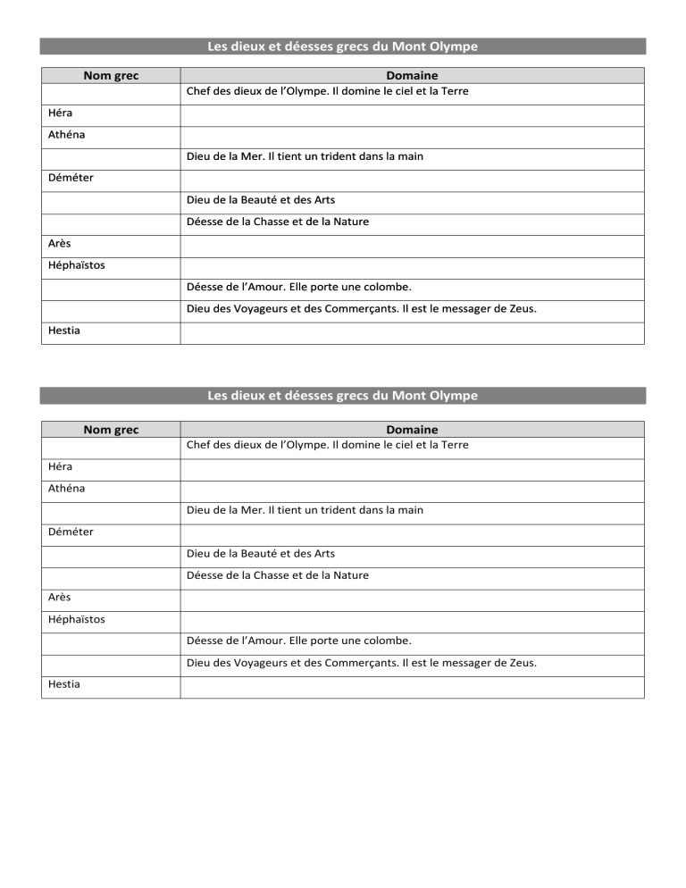Les dieux et déesses grecs du Mont Olympe Nom grec Domaine Chef des dieux de l’Olympe. Il domine le ciel et la Terre Héra Athéna Dieu de la Mer. Il tient un trident dans la main Déméter Dieu de la Beauté et des Arts Déesse de la Chasse et de la Nature Arès Héphaïstos Déesse de l’Amour. Elle porte une colombe. Dieu des Voyageurs et des Commerçants. Il est le messager de Zeus. Hestia Les dieux et déesses grecs du Mont Olympe Nom grec Domaine Chef des dieux de l’Olympe. Il domine le ciel et la Terre Héra Athéna Dieu de la Mer. Il tient un trident dans la main Déméter Dieu de la Beauté et des Arts Déesse de la Chasse et de la Nature Arès Héphaïstos Déesse de l’Amour. Elle porte une colombe. Dieu des Voyageurs et des Commerçants. Il est le messager de Zeus. Hestia