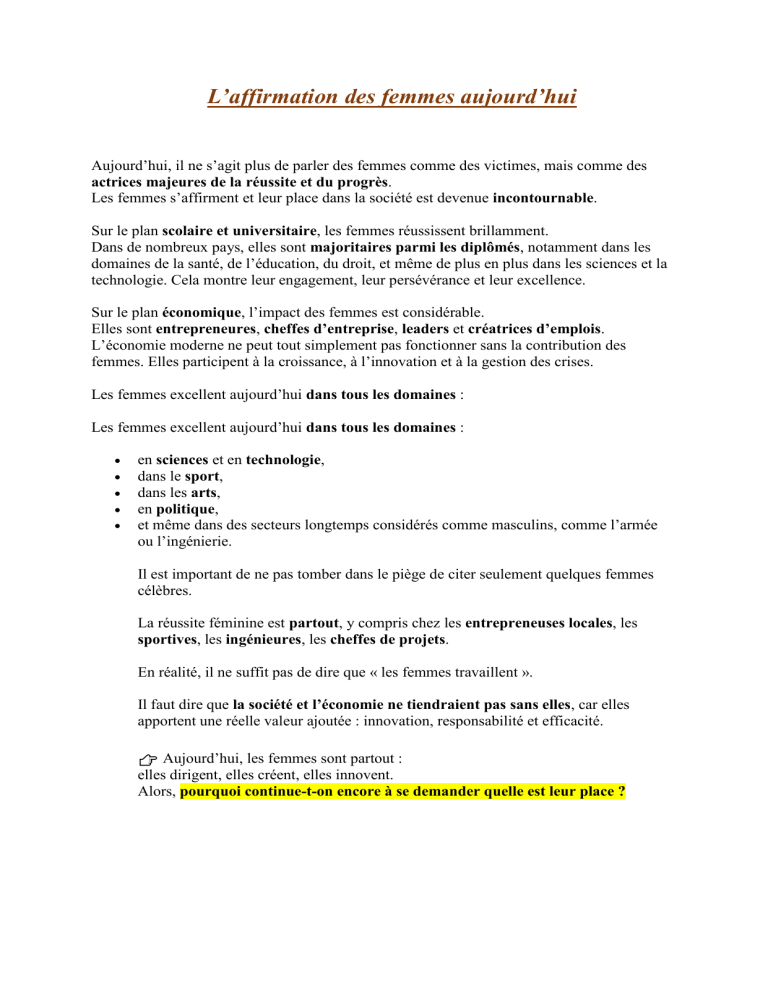 L’affirmation des femmes aujourd’hui Aujourd’hui, il ne s’agit plus de parler des femmes comme des victimes, mais comme des actrices majeures de la réussite et du progrès. Les femmes s’affirment et leur place dans la société est devenue incontournable. Sur le plan scolaire et universitaire, les femmes réussissent brillamment. Dans de nombreux pays, elles sont majoritaires parmi les diplômés, notamment dans les domaines de la santé, de l’éducation, du droit, et même de plus en plus dans les sciences et la technologie. Cela montre leur engagement, leur persévérance et leur excellence. Sur le plan économique, l’impact des femmes est considérable. Elles sont entrepreneures, cheffes d’entreprise, leaders et créatrices d’emplois. L’économie moderne ne peut tout simplement pas fonctionner sans la contribution des femmes. Elles participent à la croissance, à l’innovation et à la gestion des crises. Les femmes excellent aujourd’hui dans tous les domaines : Les femmes excellent aujourd’hui dans tous les domaines : en sciences et en technologie, dans le sport, dans les arts, en politique, et même dans des secteurs longtemps considérés comme masculins, comme l’armée ou l’ingénierie. Il est important de ne pas tomber dans le piège de citer seulement quelques femmes célèbres. La réussite féminine est partout, y compris chez les entrepreneuses locales, les sportives, les ingénieures, les cheffes de projets. En réalité, il ne suffit pas de dire que « les femmes travaillent ». Il faut dire que la société et l’économie ne tiendraient pas sans elles, car elles apportent une réelle valeur ajoutée : innovation, responsabilité et efficacité. 👉 Aujourd’hui, les femmes sont partout : elles dirigent, elles créent, elles innovent. Alors, pourquoi continue-t-on encore à se demander quelle est leur place ?