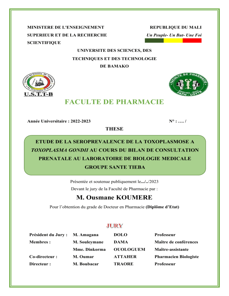 MINISTERE DE L'ENSEIGNEMENT REPUBLIQUE DU MALI SUPERIEUR ET DE LA RECHERCHE Un Peuple- Un But- Une Foi SCIENTIFIQUE UNIVERSITE DES SCIENCES, DES TECHNIQUES ET DES TECHNOLOGIE DE BAMAKO FACULTE DE PHARMACIE N° : …. / Année Universitaire : 2022-2023 THESE ETUDE DE LA SEROPREVALENCE DE LA TOXOPLASMOSE A TOXOPLASMA GONDII AU COURS DU BILAN DE CONSULTATION PRENATALE AU LABORATOIRE DE BIOLOGIE MEDICALE GROUPE SANTE TIEBA Présentée et soutenue publiquement le.../../2023 Devant le jury de la Faculté de Pharmacie par : M. Ousmane KOUMERE Pour l’obtention du grade de Docteur en Pharmacie (Diplôme d’Etat) Président du Jury : M. Amagana DOLO Professeur Membres : M. Souleymane DAMA Maître de conférences Mme. Dinkorma OUOLOGUEM Maître-assistante Co-directeur : M. Oumar ATTAHER Pharmacien Biologiste Directeur : M. Boubacar TRAORE Professeur LISTE DES ENSEIGNANTS DE LA FACULTE DE PHARMACIE ANNEE UNIVERSITAIRE 2022-2023 ADMINISTRATION Doyen : Boubacar TRAORE, Professeur Vice-doyen : Sékou BAH, Professeur Secrétaire principal : Seydou COULIBALY, Administrateur Civil Agent comptable : Ismaël CISSE, Contrôleur des Finances. PROFESSEURS HONORAIRES N° PRENOMS NOM SPECIALITE 1 Flabou BOUGOUDOGO Bactériologie-Virologie 2 Boubacar Sidiki CISSE Toxicologie 3 Bakary Mamadou CISSE Biochimie 4 Abdoulaye DABO Malacologie -Biologie animale 5 Yaya Coulibaly Législation 6 Daouda DIALLO Chimie Générale et Minérale 7 Mouctar DIALLO Parasitologie-Mycologie 8 Souleymane DIALLO Bactériologie - Virologie 9 Kaourou DOUCOURE Physiologie humaine 10 Ousmane DOUMBIA Chimie thérapeutique 11 Boulkassoum HAIDARA Législation 12 Gaoussou KANOUTE Chimie analytique 13 Alou A. KEITA Galénique 14 Mamadou KONE Physiologie 15 Brehima KOUMARE Bactériologie/Virologie 16 Abdourahamane S. MAIGA Parasitologie 17 Saibou MAICA Législation 18 Elimane MARIKO Pharmacologie 19 Mahamadou TRAORE Génétique 20 Sékou Fantamady TRAORE Zoologie i PROFESSFURS DECEDES N° 1 2 3 4 5 PRENOMS Mahamadou Drissa Moussa Mamadou Moussa NOM CISSE DIALLO HARAMA KOUMARE SANOGO SPECIALITE Biologie Pharmacognosie Chimie analytique Pharmacognosie Gestion pharmaceutique DER: SCIENCES BIOLOGIQUES ET MEDICALES 1. PROFESSEUR/DIRECTEUR DE RECHERCHE N° 1 PRENOMS Mounirou NOM BABY GRADE Professeur SPECIALITE Hématologie 2 Mahamadou DIAKITE Professeur Immunologie-Génétique 3 Alassane DICKO Professeur Santé Publique 4 Abdoulaye DJIMDE Professeur Parasitologie-Mycologie 5 Amagana DOLO Professeur Parasitologie-Mycologie 6 Aldjouma GUINDO Professeur 7 8 Akory Ag Kassoum IKNANE KAYENTAO Professeur Directeur de recherche 9 10 11 Ousmane Issaka Boubacar KOITA SAGARA TRAORE Professeur Directeur de recherche Professeur Hématologie. Chef de DER Santé Publique/Nutrition Santé Pub/ Biostatistique Biologie-Moléculaire Bio-statistique Parasitologie-Mycologie 2. MAITRE DE CONFERENCES/MAITRE DE RECHERCHE N° 1 PRENOMS Bourèma NOM KOURIBA 2 Almoustapha Issiaka Mahamadou S. Ousmane Djibril Mamadou Djénéba Coumba MAIGA 3 4 5 6 7 SISSOKO TOURE COULIBALY DABITAO DARA Antoine GRADE Maître de conférences Maître de recherche Maître de recherche Maître de recherche Maître de conférences Maître de conférences Maître de conférences SPECIALITE Immunologie Bactériologie-Virologie Bio-statistique Santé Publ/Santé environ. Biochimie clinique Biologie-moléculaire Biologie-moléculaire ii 8 Souleymane DAMA 9 Laurent DEMBELE 10 Seydina S. A. DIAKITE 11 Fatou DIAWARA 12 Ibrahima GUINDO 13 NIANGALY 14 Amadou Birama Fanta 15 Yéya dit Dadio SARRO SANGO Maître de conférences Maître de conférences Maître de conférences Maître de conférences Maître de conférences Maître de conférences Maître de conférences Maître de conférences Parasitologie - Mycologie BiotechnologieMicrobienne Immunologie Epidémiologie Bactériologie Virologie Parasitologie – Mycologie Santé publ/Santé communautaire Epidémiologie 3. MAITRE ASSISTANT/CHARGE DE RECHERCHE N° PRENOMS NOM GRADE SPECIALITE 1 Mohamed AG BARAIKA Maître-Assistant Bactériologie-Virologie 2 Charles ARAMA Maître-Assistant Immunologie 3 Boubacar BISSAN Maître-Assistant Biologie clinique Tiétiè 4 Seydou Sassou COULIBALY Maître-Assistant Biochimie Clinique 5 Klétigui DEMBELE Maître-Assistant Biochimie Clinique Casimir 6 Yaya GOITA Maître-Assistant Biochimie Clinique 7 Aminatou KONE Maître-Assistant Biologie moléculaire 8 Birama Apho LY Maître-Assistant Santé publique 9 Dinkorma OUOLOGUEM Maître-Assistant Biologie Cellulaire 4. ASSISTANT/ATTACHE DE RECHERCHE N° 1 2 3 PRENOMS Djénéba Issa Merepen dit Agnès NOM COULIBALY DIARRA GUINDO GRADE Assistant Assistant Assistant SPECIALITE Nutrition/Diététique Immunologie Immunologie iii 4 Falaye KEITA Attaché de Recherche 5 N’DeyeLallah Nina Djakaridia KOITE Assistant Santé publ./santé Environn. Nutrition TRAORE Assistant Hématologie 6 DER : SCIENCES PHARMACEUTIQUES 1. PROFESSEUR/DIRECTEUR DE RECHERCHE N° PRENOMS NOM GRADE SPECIALITE 1 Rokia SANOGO Professeur Pharmacognosie Chef de DER 2. MAITRE DE CONFERENCES/MAITRE DE RECHERCHE N° PRENOMS NOM GRADE SPECIALITE 1 Loséni BENGALY Maître de Conférences Pharmacie hospitalière 2 Mahamane HAIDARA Maître de Conférences Pharmacognosie 3. MAITRE ASSISTANT/CHARGE DE RECHERCHE N° PRENOMS NOM GRADE SPECIALITE 1 Bakary Moussa CISSE Maître-Assistant Galénique 2 Issa COULIBALY Maître-Assistant Gestion 3 Balla Fatogoma COULIBALY Maître-Assistant Pharmacie hospitalière 4 Adama DENOU Maître-Assistant Pharmacognosie 5 Hamma Boubacar MAIGA Maître-Assistant Galénique 6 Adiaratou TOGOLA Maître-Assistant Pharmacognosie 4. ASSISTANT/ATTACHE DE RECHERCHE N° PRENOMS NOM GRADE SPECIALITE 1 Seydou Lahaye COULIBALY Assistant Gestion pharmaceutique 2 Daouda Lassine DEMBELE Assistant Pharmacognosie 3 Sékou DOUMBIA Assistant Pharmacognosie 4 Assitan KALOGA Assistant Législation 5 Ahmed MAIGA Assistant Législation iv 6 Aïchata Ben Adam MARIKO Assistant Galénique 7 Aboubacar SANGHO Assistant Lé
