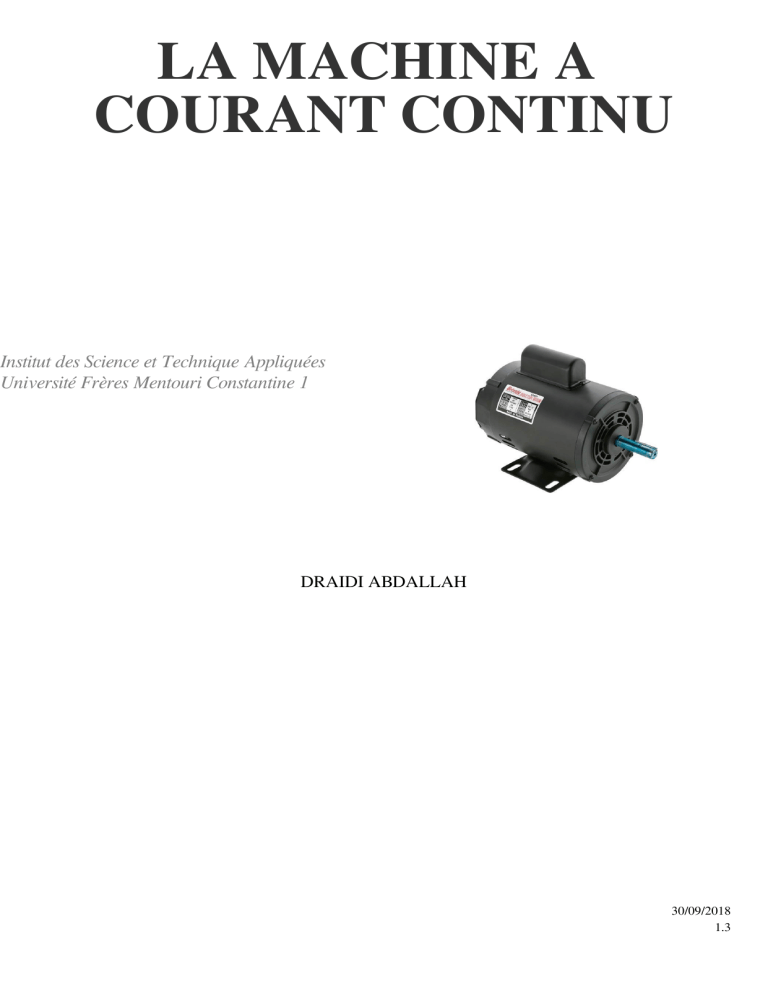 LA MACHINE A COURANT CONTINU Institut des Science et Technique Appliquées Université Frères Mentouri Constantine 1 DRAIDI ABDALLAH 30/09/2018 1.3 Table des matières Objectifs 4 I - Exercice : Test de prérequis 5 II - Exercice 6 III - Présentation générale 7 1. Définition ........................................................................................................................................................ 7 2. Conversion d'énergie ....................................................................................................................................... 7 3. Symbole .......................................................................................................................................................... 7 4. Constitution ..................................................................................................................................................... 8 5. Parties mécaniques .......................................................................................................................................... 8 6. Plaque signalétique d'un moteur à CC ............................................................................................................ 9 7. Force électromotrice ..................................................................................................................................... 10 8. Couple électromagnétique ............................................................................................................................ 10 9. Puissance électromagnétique ........................................................................................................................ 10 10. Exercice ...................................................................................................................................................... 11 11. Exercice ...................................................................................................................................................... 11 12. Bilan des puissances du moteur à c.c. ......................................................................................................... 11 13. Le rendement .............................................................................................................................................. 12 13.1. Mesure directe .......................................................................................................................................................................... 12 13.2. Méthode des pertes séparées ..................................................................................................................................................... 12 IV - Modes d'excitation du moteur à courant continu 13 1. Excitation séparée ou à aimants permanents ................................................................................................. 13 2. Moteur à excitation série .............................................................................................................................. 14 3. Moteur à excitations composée ..................................................................................................................... 16 V - Analyse d'un moteur simplifié à aimants permanents 17 1. Modèle équivalent du moteur CC à aimant permanent ................................................................................. 17 1.1. Les équations caractéristiques du moteur .................................................................................................................................... 17 VI - Commande de vitesse des moteurs à courant continu 19 1. Moteur à excitation séparée et série .............................................................................................................. 19 2. Moteur à aimant permanent .......................................................................................................................... 19 VII - Travaux Dirigés 21 1. Exercice : Exercice 1 .................................................................................................................................... 21 2. Exercice : Exercice 2 .................................................................................................................................... 21 3. Exercice : Exercice 3 .................................................................................................................................... 21 4. Exercice : Exercice 4 : Machine à excitation indépendante entraînant un treuil ........................................... 21 5. Exercice : Exercice 5 : .................................................................................................................................. 22 Conclusion 23 Solutions des exercices 24 Références 26 Objectifs A l'issu de ce cours l'apprenant sera capable de : Connaître les principes de la machine à courant continu. Différencier entre les modes d'excitation d'un moteur à c.c ainsi que leur commande de vitesse. Analyser un moteur simplifié à aimants permanents. Appliquer les différents lois et théorème de la machine à c.c. pour résoudre des cas pratiques dans l'industrie. Prérequis : 1. Électrotechnique 1. 2. Électricité générale. 4 Exercice : Test de prérequis Exercice : Test de prérequis I [solution n°1 p.24] [*] le champ magnétique se dirige : du sud vers le nord du nord vers le sud du nord vers le nord du sud vers le sud 5 Exercice Exercice II [solution n°2 p.24] [* ] le produit vectoriel de deux vecteurs (V1) et (V2) donne un vecteur (V3) : V3 est dans le même plan que V1 et V2 V3 est perpendiculaire à V1 et V2 6 Présentation générale Présentation générale III 1. Définition Définition Une machine à courant continu est une machine électrique. Il s'agit d'un convertisseur électromécanique permettant la conversion bidirectionnelle d'énergi