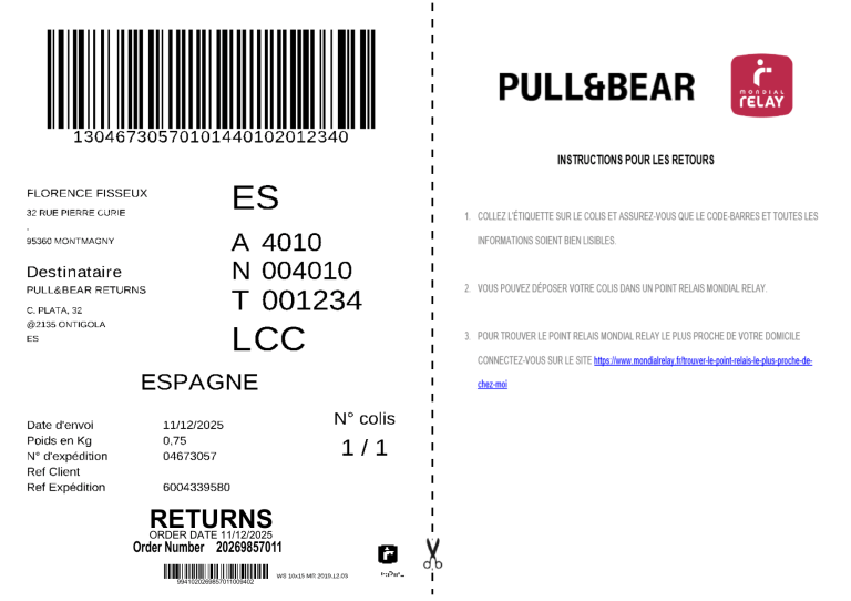RETURNS ORDER DATE 11/12/2025 Order Number 20269857011 9941020269857011009402