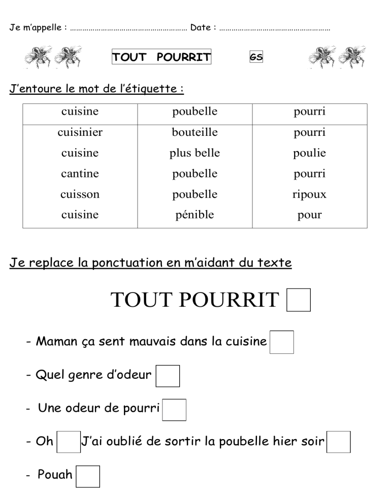 Je m’appelle : ………………………………………………… Date : ……………………………………………… TOUT POURRIT GS J’entoure le mot de l’étiquette : cuisine poubelle pourri cuisinier bouteille pourri cuisine plus belle poulie cantine poubelle pourri cuisson poubelle ripoux cuisine pénible pour Je replace la ponctuation en m’aidant du texte TOUT POURRIT - Maman ça sent mauvais dans la cuisine - Quel genre d’odeur - Une odeur de pourri - Oh - Pouah J’ai oublié de sortir la poubelle hier soir