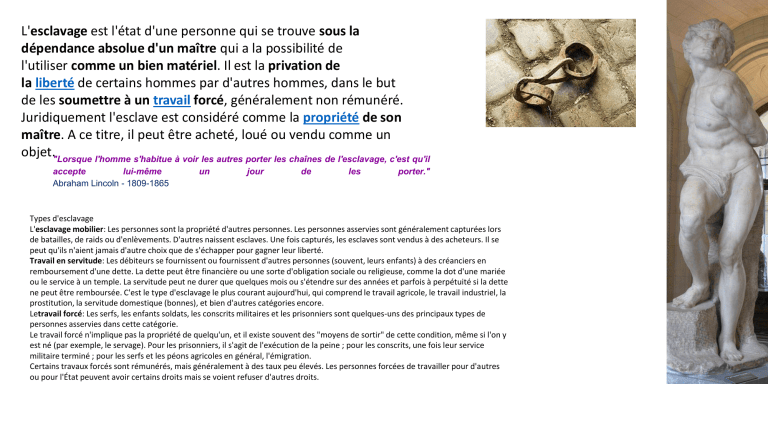 L'esclavage est l'état d'une personne qui se trouve sous la dépendance absolue d'un maître qui a la possibilité de l'utiliser comme un bien matériel. Il est la privation de la liberté de certains hommes par d'autres hommes, dans le but de les soumettre à un travail forcé, généralement non rémunéré. Juridiquement l'esclave est considéré comme la propriété de son maître. A ce titre, il peut être acheté, loué ou vendu comme un objet."Lorsque l'homme s'habitue à voir les autres porter les chaînes de l'esclavage, c'est qu'il accepte lui-même Abraham Lincoln - 1809-1865 un jour de les porter." Types d'esclavage L'esclavage mobilier: Les personnes sont la propriété d'autres personnes. Les personnes asservies sont généralement capturées lors de batailles, de raids ou d'enlèvements. D'autres naissent esclaves. Une fois capturés, les esclaves sont vendus à des acheteurs. Il se peut qu'ils n'aient jamais d'autre choix que de s'échapper pour gagner leur liberté. Travail en servitude: Les débiteurs se fournissent ou fournissent d'autres personnes (souvent, leurs enfants) à des créanciers en remboursement d'une dette. La dette peut être financière ou une sorte d'obligation sociale ou religieuse, comme la dot d'une mariée ou le service à un temple. La servitude peut ne durer que quelques mois ou s'étendre sur des années et parfois à perpétuité si la dette ne peut être remboursée. C'est le type d'esclavage le plus courant aujourd'hui, qui comprend le travail agricole, le travail industriel, la prostitution, la servitude domestique (bonnes), et bien d'autres catégories encore. Letravail forcé: Les serfs, les enfants soldats, les conscrits militaires et les prisonniers sont quelques-uns des principaux types de personnes asservies dans cette catégorie. Le travail forcé n'implique pas la propriété de quelqu'un, et il existe souvent des "moyens de sortir" de cette condition, même si l'on y est né (par exemple, le servage). Pour les prisonniers, il s'agit de l'exécution de la peine ; pour les conscrits, une fois leur service militaire terminé ; pour les serfs et les péons agricoles en général, l'émigration. Certains travaux forcés sont rémunérés, mais généralement à des taux peu élevés. Les personnes forcées de travailler pour d'autres ou pour l'État peuvent avoir certains droits mais se voient refuser d'autres droits. Histoire de l'esclavage L'esclavage existe depuis au moins 5 000 ans et sur tous les continents habités ; il est attesté dès Sumer dans le Croissant fertile. Il semble avoir évolué avec la stratification sociale, associée à la domination de l'agriculture et à la formation d'une classe dirigeante d'élite, basée dans les villes. L'esclavage est apparu indépendamment dans l'Ancien et le Nouveau Monde, probablement à de nombreuses reprises. L'esclavage ne s'est donc pas diffusé en tant que pratique culturelle à partir d'un seul endroit. Nomme un empire ou un royaume à n'importe quelle époque ou dans n'importe quelle région : neuf (ou dix) fois sur dix, il a autorisé et même encouragé l'esclavage. L'esclavage a impliqué des systèmes de racisme institutionnalisé et d'autres pratiques discriminatoires fondées sur la culture pour justifier les systèmes politiques qui autorisent cette pratique, mais il est sous-tendu par la recherche du profit. De nombreuses sociétés égalitaires ont rejeté la notion même d'esclavage. Il s'agit notamment des sociétés sans stratification sociale, la norme avant la domination de l'agriculture. Les gens qui chassent, cueillent et pêchent et qui vivent en petites bandes interdépendantes (le seul type de société qui existait jusqu'à il y a quelques milliers d'années) ne pratiquent généralement pas et n'ont jamais pratiqué aucune forme de travail involontaire. Chrétiens, musulmans et esclavage à l'échelle mondiale Deux religions universelles, le christianisme et l'islam, ont porté l'esclavage à un niveau supérieur en faisant des esclaves un pilier de leur économie. Elles ont même justifié l'esclavage en citant les Écritures. L'esclavage des non-musulmans par les musulmans a commencé dans les années 600 et s'est poursuivi jusqu'au 20ème siècle, impliquant des millions de personnes réduites en esclavage. Pendant ce temps, le monde chrétien tout entier tirait une grande influence politique et un énorme pouvoir économique de la traite transatlantique des esclaves (années 1500-1800) ; le dernier pays occidental à avoir interdit l'esclavage mobilier a été le Brésil, en 1888. Dans le monde musulman, l'esclavage était une continuation des pratiques préislamiques dans de nombreux endroits. Les zones sources se trouvaient au sud du Sahara (traite transsaharienne et traite dans l'océan Indien) et, dans une moindre mesure, en Europe et en Asie. L'Empire ottoman a poursuivi cette pratique jusqu'au début du 20e siècle. La fin de l'esclavage L'esclavage moderne en chiffres Nous aimerions pouvoir t'assurer que l'esclavage a pris fin dans l'Empire britannique avec le Slavery Abolition Act 1833, ou aux États- Globalement, 50 % de toutes les personnes contemporaines réduites en esclavage sont Unis avec la Proclamation d'émancipation de Lincoln en 1863, ou en 1888 au Brésil, ou même en Mauritanie en 1981, dernier pays à avoir impliquées dans le travail forcé, le trafic de tout, du sexe au salon de manucure, étant dominant. Les interdit l'esclavage. Mais nous ne pouvons pas. Comme nous l'avons mentionné au début, l'esclavage, bien qu'illégal enfants représentent 1/4 de tous les esclaves aujourd'hui ; 70 % des esclaves sont des femmes. partout, est toujours bien vivant, avec plus d'esclaves que jamais. Ce L'industrie mondiale, qui représente 150 milliards de n'est pas une grande consolation pour les 40 millions de personnes asservies dans le monde d'apprendre que des économies entières ne dollars, est la deuxième catégorie économique illici