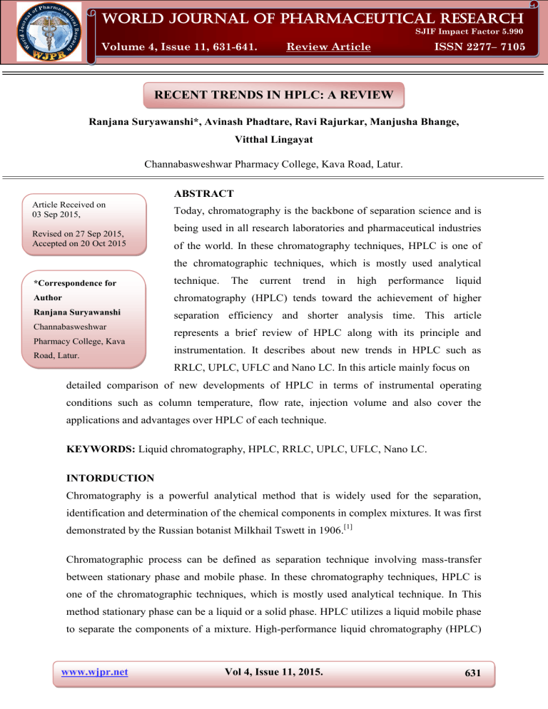 World Journal of Pharmaceutical Research Ranjana et al. Volume 4, Issue 11, 631-641. SJIF Impact Factor 5.990 World Journal of Pharmaceutical Research Review Article ISSN 2277– 7105 RECENT TRENDS IN HPLC: A REVIEW Ranjana Suryawanshi*, Avinash Phadtare, Ravi Rajurkar, Manjusha Bhange, Vitthal Lingayat Channabasweshwar Pharmacy College, Kava Road, Latur. ABSTRACT Article Received on 03 Sep 2015, Revised on 27 Sep 2015, Accepted on 20 Oct 2015 Today, chromatography is the backbone of separation science and is being used in all research laboratories and pharmaceutical industries of the world. In these chromatography techniques, HPLC is one of the chromatographic techniques, which is mostly used analytical *Correspondence for technique. Author chromatography (HPLC) tends toward the achievement of higher Ranjana Suryawanshi separation efficiency and shorter analysis time. This article Channabasweshwar Pharmacy College, Kava Road, Latur. The current trend in high performance liquid represents a brief review of HPLC along with its principle and instrumentation. It describes about new trends in HPLC such as RRLC, UPLC, UFLC and Nano LC. In this article mainly focus on detailed comparison of new developments of HPLC in terms of instrumental operating conditions such as column temperature, flow rate, injection volume and also cover the applications and advantages over HPLC of each technique. KEYWORDS: Liquid chromatography, HPLC, RRLC, UPLC, UFLC, Nano LC. INTORDUCTION Chromatography is a powerful analytical method that is widely used for the separation, identification and determination of the chemical components in complex mixtures. It was first demonstrated by the Russian botanist Milkhail Tswett in 1906.[1] Chromatographic process can be defined as separation technique involving mass-transfer between stationary phase and mobile phase. In these chromatography techniques, HPLC is one of the chromatographic techniques, which is mostly used analytical technique. In This method stationary phase can be a liquid or a solid phase. HPLC utilizes a liquid mobile phase to separate the components of a mixture. High-performance liquid chromatography (HPLC) www.wjpr.net Vol 4, Issue 11, 2015. 631 Ranjana et al. World Journal of Pharmaceutical Research is the term used to describe liquid chromatography in which the liquid mobile phase is mechanically pumped through a column that contains the stationary phase. An HPLC instrument, therefore, consists of an injector, a pump, a column, and a detector.[2] PRINCIPLE The underlying principles of this evolution are governed by the van Demeter equation, which is an empirical formula that describes the relationship between linear velocity (flow rate) and plate height (HETP or 1/column efficiency). H=A+B/u + Cu Where, A- Eddy’s diffusion B- Longitudinal diffusion C-Concentration u- Linear Velocity.[3, 4] Figure: Diagram of HPLC instrumentation NEW TRENDS IN HPLC TECHNIQUE HPLC is compared with the classical techniques are characterized by: Rapid Resolution Liquid chromatography (RRLC) Ultra Performance Liquid chromatography (UPLC) Ultra Fast Liquid chromatography (UFLC) Nano Liquid chromatography (NANO LC).[5] www.wjpr.net Vol 4, Issue 11, 2015. 632 Ranjana et al. World Journal of Pharmaceutical Research RAPID RESOLUTION LIQUID CHROMATOGRAPHY RRLC system was designed to provide highest analysis speed, resolution & pressure at a minimum.[6] Fastest and most efficient and flexible LC system in the world. It has become an increasingly useful approach to achieve higher throughput, improve sensitivity and reduce costs.[7] This analysis has become a routine method in the pharmaceutical industry. It holds excellent peak shapes, enhanced reproducibility, high sensitivity, high-speed detection with reduced analysis cost, and is valuable for the quality control of herbal medicines. The separation resolution and reduction of analysis time has continually improved in High Performance Liquid Chromatography (HPLC). Since then, HPLC using smaller particles has become more popular.[8] For further improvement, column efficiency must be increased. The relationship among separation efficiency, the mobile phase linear velocity and particle size was investigated in detail in the early 1970 s. This and other systematic investigations have led to high throughput and high resolution HPLC that we know today. The shortening in analysis time is due to the use of a shorter column length. However, a shorter column may lead to a loss of theoretical plates, hence a decrease in chromatographic resolution that may be required for a complex mixture of compounds. To offset the potential loss of resolution, the use of smaller size particles has resulted in more efficient columns. Long columns packed with smaller particles result in higher efficiency and higher resolution, with new RRLC technology, analysis time can be significantly reduced without losing chromatographic resolution.[2] The RRLC system enables faster analysis (theoretically up to 20x) than with conventional HPLC while maintaining equivalent resolution. This is achieved by using sub-2 micron column particle chemistry and high flow rates. Often higher temperatures are employed to minimize system back-pressure. With the widespread adoption of RRLC comes the question of HPLC detector compatibility. Presented here is the use of Charged Aerosol Detection with conventional HPLC and RRLC.[7] Advantages over HPLC The major high - throughput RRLC are the increase in throughput. The reduction in the analysis cost. The shortening in analysis time is due to the use of a shorter column length high resolution separation capability. www.wjpr.net Vol 4, Issue 11, 2015. 633 Ranjana et al. World Journal of Pharmaceutical Research Ultra fast and highest analysis speed. It is most improve sensitivity. High temperature up to 100°C on certain columns allows more selectivity flexibility. It is offers true fast LC analysis.[9] Applications of RRLC RRLC-tandem 