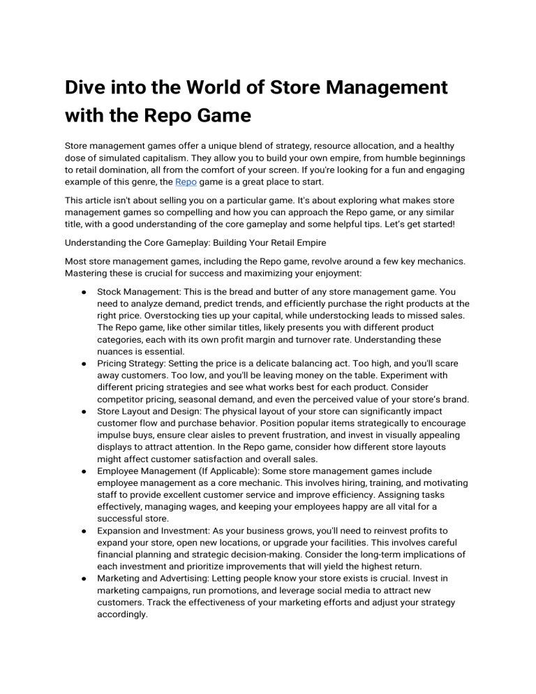 Dive into the World of Store Management with the Repo Game Store management games offer a unique blend of strategy, resource allocation, and a healthy dose of simulated capitalism. They allow you to build your own empire, from humble beginnings to retail domination, all from the comfort of your screen. If you're looking for a fun and engaging example of this genre, the Repo game is a great place to start. This article isn't about selling you on a particular game. It's about exploring what makes store management games so compelling and how you can approach the Repo game, or any similar title, with a good understanding of the core gameplay and some helpful tips. Let’s get started! Understanding the Core Gameplay: Building Your Retail Empire Most store management games, including the Repo game, revolve around a few key mechanics. Mastering these is crucial for success and maximizing your enjoyment: ● ● ● ● ● ● Stock Management: This is the bread and butter of any store management game. You need to analyze demand, predict trends, and efficiently purchase the right products at the right price. Overstocking ties up your capital, while understocking leads to missed sales. The Repo game, like other similar titles, likely presents you with different product categories, each with its own profit margin and turnover rate. Understanding these nuances is essential. Pricing Strategy: Setting the price is a delicate balancing act. Too high, and you'll scare away customers. Too low, and you'll be leaving money on the table. Experiment with different pricing strategies and see what works best for each product. Consider competitor pricing, seasonal demand, and even the perceived value of your store’s brand. Store Layout and Design: The physical layout of your store can significantly impact customer flow and purchase behavior. Position popular items strategically to encourage impulse buys, ensure clear aisles to prevent frustration, and invest in visually appealing displays to attract attention. In the Repo game, consider how different store layouts might affect customer satisfaction and overall sales. Employee Management (If Applicable): Some store management games include employee management as a core mechanic. This involves hiring, training, and motivating staff to provide excellent customer service and improve efficiency. Assigning tasks effectively, managing wages, and keeping your employees happy are all vital for a successful store. Expansion and Investment: As your business grows, you'll need to reinvest profits to expand your store, open new locations, or upgrade your facilities. This involves careful financial planning and strategic decision-making. Consider the long-term implications of each investment and prioritize improvements that will yield the highest return. Marketing and Advertising: Letting people know your store exists is crucial. Invest in marketing campaigns, run promotions, and leverage social media to attract new customers. Track the effectiveness of your marketing efforts and adjust your strategy accordingly. The Repo game, by all accounts, seems to incorporate most, if not all, of these fundamental elements. You'll likely be tasked with juggling all these responsibilities to build a thriving business. Tips and Tricks for Success: Mastering the Art of Store Management Here are a few tips that can help you succeed in the Repo game or any other store management title: ● ● ● ● ● ● ● Start Small and Experiment: Don't try to do everything at once. Focus on mastering the basics before expanding your operations. Experiment with different strategies and learn from your mistakes. Every failure is a learning opportunity. Pay Attention to Detail: Store management games are often packed with details that can significantly impact your performance. Pay attention to customer feedback, sales reports, and market trends to identify areas for improvement. Don't Be Afraid to Delegate (If Possible): If the game allows, delegate tasks to your employees to free up your time and focus on strategic decision-making. Learn to trust your team and empower them to take ownership of their responsibilities. Optimize Your Store Layout: Experiment with different layouts to find the most efficient flow for your customers. Consider the placement of popular items, the width of aisles, and the visibility of your products. Keep an Eye on Your Finances: Managing your cash flow is crucial for survival. Monitor your expenses, track your revenue, and avoid taking on too much debt. Learn from Other Players: Join online communities and forums to connect with other players. Share your experiences, ask for advice, and learn from their successes and failures. Have Fun! Store management games are meant to be enjoyable. Don't get too stressed out about winning. Focus on learning, experimenting, and having fun along the way. Conclusion: Embark on Your Store Management Adventure Store management games offer a rewarding and engaging experience for players of all skill levels. The Repo game provides a good starting point for exploring this genre. By understanding the core gameplay mechanics, applying the tips outlined above, and most importantly, embracing the learning process, you can build your own virtual retail empire and experience the thrill of success. So, dive in, experiment, and discover the satisfaction of building a thriving business from the ground up! Good luck and have fun!