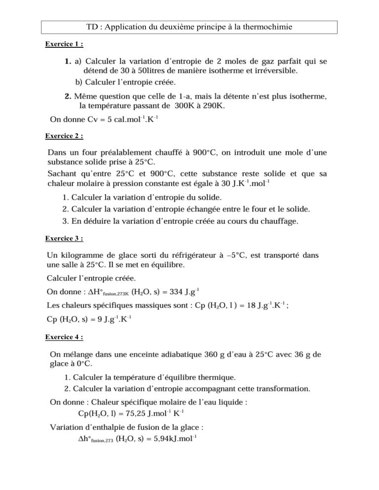 TD : Application du deuxième principe à la thermochimie Exercice 1 : Exercice 2 : Exercice 3 : Exercice 4 : Exercice 5 :