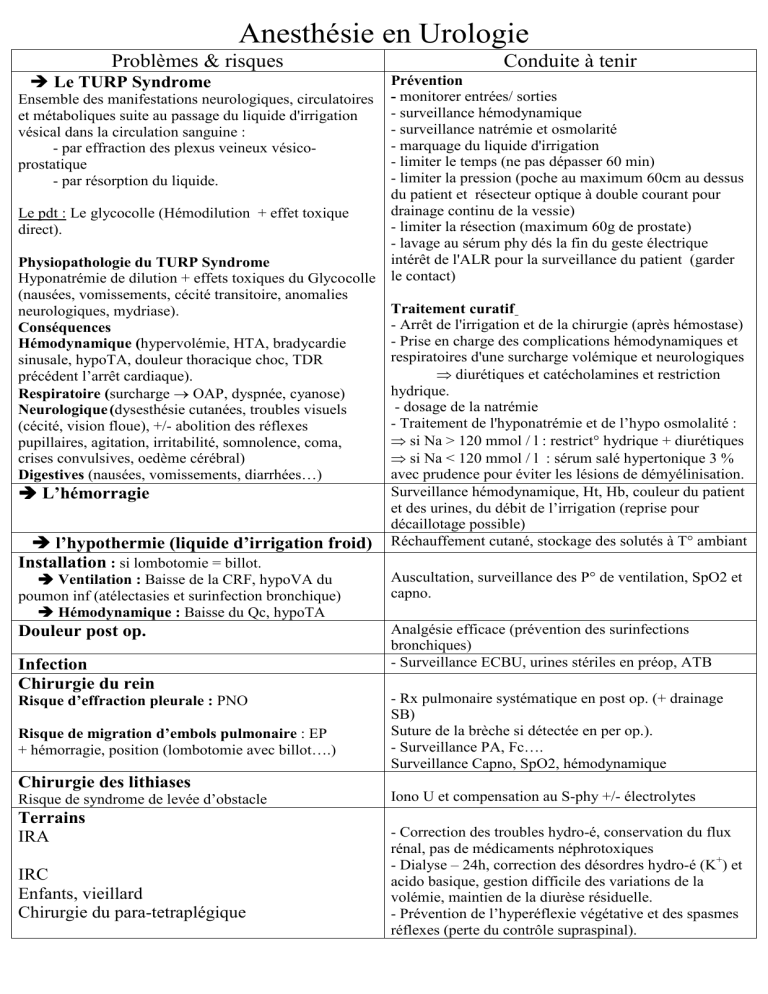 Anesthésie en Urologie Problèmes & risques Conduite à tenir Prévention Ensemble des manifestations neurologiques, circulatoires - monitorer entrées/ sorties - surveillance hémodynamique et métaboliques suite au passage du liquide d'irrigation - surveillance natrémie et osmolarité vésical dans la circulation sanguine : - marquage du liquide d'irrigation - par effraction des plexus veineux vésico- limiter le temps (ne pas dépasser 60 min) prostatique - limiter la pression (poche au maximum 60cm au dessus - par résorption du liquide. du patient et résecteur optique à double courant pour drainage continu de la vessie) Le pdt : Le glycocolle (Hémodilution + effet toxique - limiter la résection (maximum 60g de prostate) direct). - lavage au sérum phy dés la fin du geste électrique intérêt de l'ALR pour la surveillance du patient (garder Physiopathologie du TURP Syndrome Hyponatrémie de dilution + effets toxiques du Glycocolle le contact) (nausées, vomissements, cécité transitoire, anomalies Traitement curatif neurologiques, mydriase). - Arrêt de l'irrigation et de la chirurgie (après hémostase) Conséquences - Prise en charge des complications hémodynamiques et Hémodynamique (hypervolémie, HTA, bradycardie respiratoires d'une surcharge volémique et neurologiques sinusale, hypoTA, douleur thoracique choc, TDR ⇒ diurétiques et catécholamines et restriction précédent l’arrêt cardiaque). hydrique. Respiratoire (surcharge → OAP, dyspnée, cyanose) - dosage de la natrémie Neurologique (dysesthésie cutanées, troubles visuels Traitement de l'hyponatrémie et de l’hypo osmolalité : (cécité, vision floue), +/- abolition des réflexes ⇒ si Na > 120 mmol / l : restrict° hydrique + diurétiques pupillaires, agitation, irritabilité, somnolence, coma, ⇒ si Na < 120 mmol / l : sérum salé hypertonique 3 % crises convulsives, oedème cérébral) avec prudence pour éviter les lésions de démyélinisation. Digestives (nausées, vomissements, diarrhées…) Surveillance hémodynamique, Ht, Hb, couleur du patient L’hémorragie et des urines, du débit de l’irrigation (reprise pour décaillotage possible) l’hypothermie (liquide d’irrigation froid) Réchauffement cutané, stockage des solutés à T° ambiant Le TURP Syndrome Installation : si lombotomie = billot. Ventilation : Baisse de la CRF, hypoVA du poumon inf (atélectasies et surinfection bronchique) Hémodynamique : Baisse du Qc, hypoTA Auscultation, surveillance des P° de ventilation, SpO2 et capno. Douleur post op. Analgésie efficace (prévention des surinfections bronchiques) - Surveillance ECBU, urines stériles en préop, ATB Infection Chirurgie du rein Risque d’effraction pleurale : PNO Risque de migration d’embols pulmonaire : EP + hémorragie, position (lombotomie avec billot….) - Rx pulmonaire systématique en post op. (+ drainage SB) Suture de la brèche si détectée en per op.). - Surveillance PA, Fc…. Surveillance Capno, SpO2, hémodynamique Chirurgie des lithiases Risque de syndrome de levée d’obstacle Terrains IRA IRC Enfants, vieillard Chirurgie du para-tetraplégique Iono U et compensation au S-phy +/- électrolytes - Correction des troubles hydro-é, conservation du flux rénal, pas de médicaments néphrotoxiques - Dialyse – 24h, correction des désordres hydro-é (K+) et acido basique, gestion difficile des variations de la volémie, maintien de la diurèse résiduelle. - Prévention de l’hyperéflexie végétative et des spasmes réflexes (perte du contrôle supraspinal). Anesthésie en Gynécologie Problèmes & risques Conduite à tenir Hystéroscopie Risque d’embolie gazeuse liée à l’utilisation de gaz (CO2) Utilisation du capno Arrêt de la procédure, ventilation en FiO2 = 1 Aspiration de la bulle par KTC, Oxygénothérapie hyperbare. Risque de TURP Syndrome lié à l’utilisation de soluté d’irrigation = surcharge liquidienne (OAP, tb Cardio-vasc, nausées, vomissements, tb visuel, confusion, agitation, coma P° intra-utérine < 70mmhg Durée < 45 min. Bilan entrées/sorties + dosage natrémie Diurétiques Coelioscopie Retentissements hémodynamiques = liés au pneumopéritoine (baisse du retour veineux, du Qc Mais PA stable car augmentation des RVS. = liés au tredelenbourg (baisse du retour veineux suite à l’augmentation des P° intrathoraciques engendrée par la diminution des mouvements du diaphragme. Retentissements respiratoires Hypercapnie = Altération des échanges gazeux (modif VA/Q) = Dépression respiratoire en VS = Diffusion du CO2 intra péritonéal. Cf. Anesthésie et Coeliochirurgie Anesthésie en Ophtalmologie Buts de l’anesthésie Analgésie – Akinésie – Baisse de la PIO – Champ exsangue Problèmes & risques Conduite à tenir P°intra oculaire résulte de l’équilibre entre la production et la résorption de l’humeur aqueuse (nale : 12 - 20 mmhg) = angle fermé = risque d’ischémie rétinienne = angle ouvert = risque d’expulsion du contenu de l’oeil Augmentation de la PIO : - HTA, augmentation de la PVC, hypercapnie, hypoxie, les mvts oculaires, les clignements de paupières - Célocurine et Kétamine - Parasympatholytique et sympathomimétiques (antispasmodiques, anticholinergiques, antihistaminiques, bronchodilatateurs, IMAO, Antitussifs…) Surveiller, monitorer et contrôler ces paramètres Ne pas utiliser ces produits Utiliser ceux qui font baisser la PIO (halogénés, pentothal, etomidate, propofol, benzo, morphiniques, curares non dépolarisants). Réveil calme : éviter la toux Réflexe oculo-cardiaque (ROC) Diminuer sous AG et ALR mais non supprimé. Manifestations : - Bradycardies sinusales, pauses, ESV, ESA, jusqu’à arrêt cardiaque. les manifestations sont d’autant plus importantes que la stimulation est soudaine et brutale. Réflexe oculo-respiratoire Surveillance = ECG Traitement = Atropine 6µ/kg (attention chez insuffisant coronaires et adénomes de prostates). CAT en cas de sur