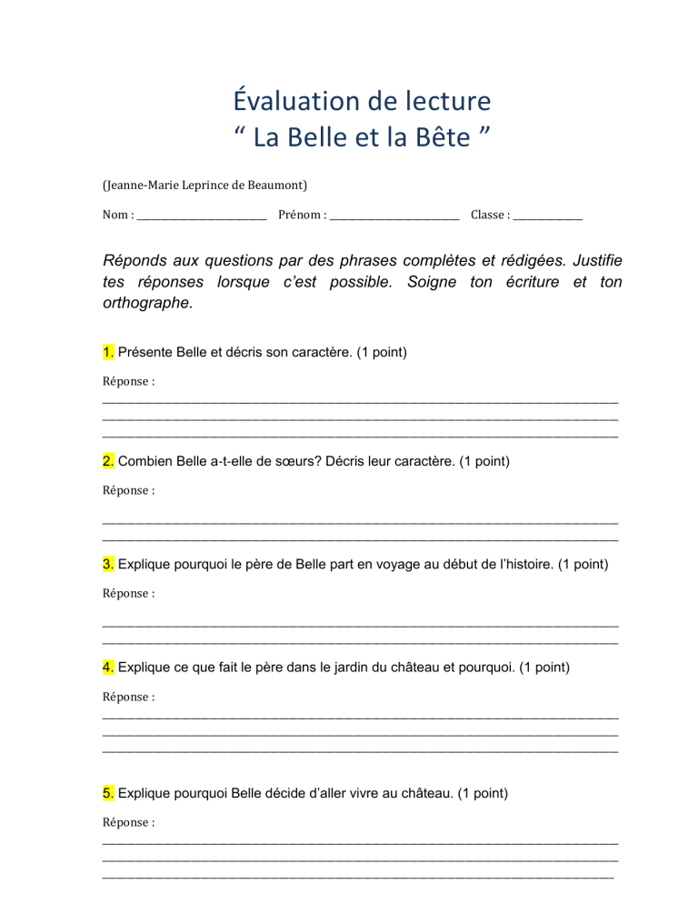 Évaluation de lecture “ La Belle et la Bête ” (Jeanne‑Marie Leprince de Beaumont) Nom : ____________________________ Prénom : ____________________________ Classe : _______________ Réponds aux questions par des phrases complètes et rédigées. Justifie tes réponses lorsque c’est possible. Soigne ton écriture et ton orthographe. 1. Présente Belle et décris son caractère. (1 point) Réponse : _______________________________________________________________________________________________________________ _______________________________________________________________________________________________________________ _______________________________________________________________________________________________________________ 2. Combien Belle a‑t‑elle de sœurs? Décris leur caractère. (1 point) Réponse : _______________________________________________________________________________________________________________ _______________________________________________________________________________________________________________ 3. Explique pourquoi le père de Belle part en voyage au début de l’histoire. (1 point) Réponse : _______________________________________________________________________________________________________________ _______________________________________________________________________________________________________________ 4. Explique ce que fait le père dans le jardin du château et pourquoi. (1 point) Réponse : _______________________________________________________________________________________________________________ _______________________________________________________________________________________________________________ _______________________________________________________________________________________________________________ 5. Explique pourquoi Belle décide d’aller vivre au château. (1 point) Réponse : _______________________________________________________________________________________________________________ _______________________________________________________________________________________________________________ ______________________________________________________________________________________________________________ 6. Décris le comportement de la Bête envers Belle. (1 point) Réponse : _______________________________________________________________________________________________________________ _______________________________________________________________________________________________________________ _______________________________________________________________________________________________________________ 7. Quel objet magique la Belle utilise-t-elle pour se rendre chez son père et en revenir? (1point). Réponse : _______________________________________________________________________________________________________________ _______________________________________________________________________________________________________________ 8. Explique pourquoi Belle quitte le château pour plusieurs jours. (1 point) Réponse : _______________________________________________________________________________________________________________ _______________________________________________________________________________________________________________ _______________________________________________________________________________________________________________ 9. De retour chez la Bête, que découvre la Belle? (1point) _______________________________________________________________________________________________________________ _______________________________________________________________________________________________________________ _______________________________________________________________________________________________________________ 10. Explique ce qui se passe à la fin de l’histoire. (1 point) Réponse : _______________________________________________________________________________________________________________ _______________________________________________________________________________________________________________ _______________________________________________________________________________________________________________ Bonus : Qui a dit les paroles suivantes? “J’aime mieux mourir moi-même que de vous donner du chagrin”. __________________________________ “Vous avez préféré la vertu à la beauté et à l’esprit ; vous méritez de trouver toutes ces qualités réunies en une même personne.” ___________________________________
