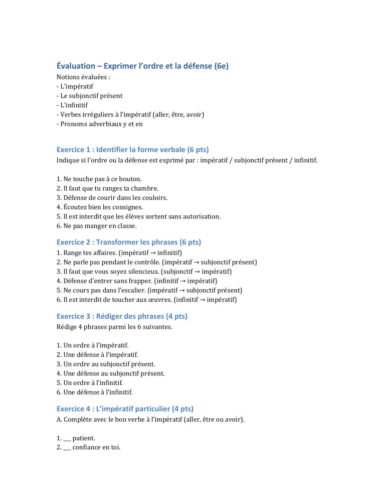 Évaluation – Exprimer l’ordre et la défense (6e) Notions évaluées : - L’impératif - Le subjonctif présent - L’infinitif - Verbes irréguliers à l’impératif (aller, être, avoir) - Pronoms adverbiaux y et en Exercice 1 : Identifier la forme verbale (6 pts) Indique si l’ordre ou la défense est exprimé par : impératif / subjonctif présent / infinitif. 1. Ne touche pas à ce bouton. 2. Il faut que tu ranges ta chambre. 3. Défense de courir dans les couloirs. 4. Écoutez bien les consignes. 5. Il est interdit que les élèves sortent sans autorisation. 6. Ne pas manger en classe. Exercice 2 : Transformer les phrases (6 pts) 1. Range tes affaires. (impératif → infinitif) 2. Ne parle pas pendant le contrôle. (impératif → subjonctif présent) 3. Il faut que vous soyez silencieux. (subjonctif → impératif) 4. Défense d’entrer sans frapper. (infinitif → impératif) 5. Ne cours pas dans l’escalier. (impératif → subjonctif présent) 6. Il est interdit de toucher aux œuvres. (infinitif → impératif) Exercice 3 : Rédiger des phrases (4 pts) Rédige 4 phrases parmi les 6 suivantes. 1. Un ordre à l’impératif. 2. Une défense à l’impératif. 3. Un ordre au subjonctif présent. 4. Une défense au subjonctif présent. 5. Un ordre à l’infinitif. 6. Une défense à l’infinitif. Exercice 4 : L’impératif particulier (4 pts) A. Complète avec le bon verbe à l’impératif (aller, être ou avoir). 1. ___ patient. 2. ___ confiance en toi. 3. ___ me chercher après l’école. 4. ___ prudents sur la route. 5. ___ ton cahier pour demain. B. Réécris les phrases en utilisant y ou en. 6. Va à la bibliothèque. → __________ 7. Prends des bonbons. → __________ 8. Ne retourne pas à cet endroit. → __________ 9. Mange de ce gâteau. → __________ 10. N’apporte pas de stylos. → __________ Barème sur 20 Exercice 1 : 6 pts (1 pt par bonne réponse) Exercice 2 : 6 pts (1 pt par phrase correcte, 0,5 pt si petite erreur) Exercice 3 : 4 pts (1 pt par phrase correcte) Exercice 4 : 4 pts - Partie A : 2,5 pts (0,5 pt par réponse) - Partie B : 1,5 pt (0,3 pt par réponse) Total : 20 pts Corrigé Exercice 1 : 1. impératif 2. subjonctif présent 3. infinitif 4. impératif 5. subjonctif présent 6. infinitif Exercice 2 (réponses possibles) : 1. Ranger tes affaires. 2. Il faut que tu ne parles pas pendant le contrôle. 3. Soyez silencieux. 4. N’entrez pas sans frapper. 5. Il faut que tu ne cours pas dans l’escalier. 6. Ne touchez pas aux œuvres. Exercice 3 : réponses libres, correctes grammaticalement. Exercice 4 : A. 1. Sois patient. 2. Aie confiance en toi. 3. Va me chercher après l’école. 4. Soyez prudents sur la route. 5. Aie ton cahier pour demain. B. 6. Vas-y. 7. Prends-en. 8. N’y retourne pas. 9. Manges-en. 10. N’en apporte pas.