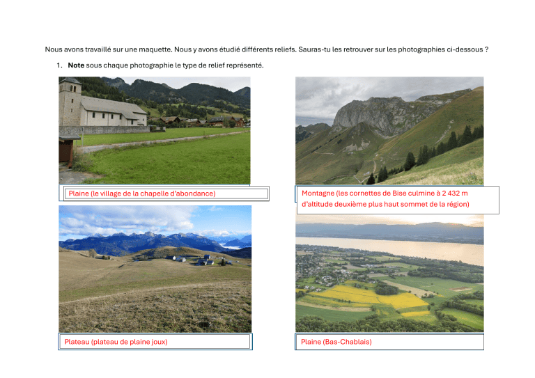 Nous avons travaillé sur une maquette. Nous y avons étudié différents reliefs. Sauras-tu les retrouver sur les photographies ci-dessous ? 1. Note sous chaque photographie le type de relief représenté. Plaine (le village de la chapelle d’abondance) Plaine (le village de la chapelle d’abondance) Montagne (les cornettes de Bise culmine à 2 432 m d’altitude deuxième plus haut sommet de la région) Plateau (plateau de plaine joux) Plaine (Bas-Chablais) DECOUVERTE DES PAYSAGES ET DES RELIEFS DE CHAPELLE D’ABONDANCE 1 Montagne (le Mont Chauffé) Plateau (Plateau de Semine) Montagne (Mont de Grange ex-aequo avec la cornette bise en culminant à 2432 m d’altitude) Plaine (Rte de Chessel Rennaz, Vaud) DECOUVERTE DES PAYSAGES ET DES RELIEFS DE CHAPELLE D’ABONDANCE 1. Relie les définitions relatives aux reliefs avec les images . . . Plateau Plaine Surface relativement plane, d’altitude plus ou moins élevée et dans laquelle les cours d’eau sont encaissés Montagne Relief d’altitude élevée caractérisé par de fortes pentes et de fortes dénivellations Altitude Élévation par rapport au niveau de la mer 2. Replace les différents reliefs sur le schéma ci-dessous. 2 Surface plane et peu élevée dans laquelle les cours d’eau sont peu ou pas encaissés