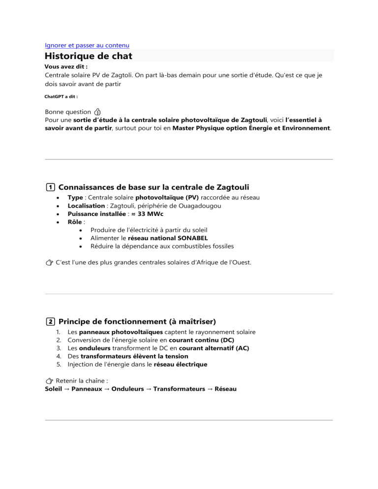 Ignorer et passer au contenu Historique de chat Vous avez dit : Centrale solaire PV de Zagtoli. On part là-bas demain pour une sortie d'étude. Qu'est ce que je dois savoir avant de partir ChatGPT a dit : Bonne question 👍 Pour une sortie d’étude à la centrale solaire photovoltaïque de Zagtouli, voici l’essentiel à savoir avant de partir, surtout pour toi en Master Physique option Énergie et Environnement. Connaissances de base sur la centrale de Zagtouli Type : Centrale solaire photovoltaïque (PV) raccordée au réseau Localisation : Zagtouli, périphérie de Ouagadougou Puissance installée : ≈ 33 MWc Rôle : Produire de l’électricité à partir du soleil Alimenter le réseau national SONABEL Réduire la dépendance aux combustibles fossiles 👉 C’est l’une des plus grandes centrales solaires d’Afrique de l’Ouest. Principe de fonctionnement (à maîtriser) 1. 2. 3. 4. 5. Les panneaux photovoltaïques captent le rayonnement solaire Conversion de l’énergie solaire en courant continu (DC) Les onduleurs transforment le DC en courant alternatif (AC) Des transformateurs élèvent la tension Injection de l’énergie dans le réseau électrique 👉 Retenir la chaîne : Soleil → Panneaux → Onduleurs → Transformateurs → Réseau Équipements que tu verras sur le site Essaie de les identifier clairement : Champs de modules photovoltaïques Structures de support (fixes ou orientables) Onduleurs (centrales ou string) Transformateurs Poste de livraison / poste électrique Systèmes de protection (disjoncteurs, parafoudres) Système de supervision (SCADA) Paramètres techniques importants Sois attentif à : Puissance totale installée (MWc) Type de panneaux (monocristallins / polycristallins) Rendement des modules Orientation et inclinaison des panneaux Production journalière / annuelle Facteur de capacité Pertes (température, poussière, câbles) Exploitation et maintenance Points clés à retenir : Nettoyage des panneaux (très important au Burkina) Maintenance préventive et curative Surveillance à distance Problèmes courants : Poussière Surchauffe Vieillissement des composants Aspects environnementaux et socio-économiques Très important pour ton option : Réduction des émissions de CO₂ Impact sur l’emploi local Occupation du sol Intégration au réseau national Contribution à la sécurité énergétique du Burkina Questions intelligentes à poser sur place Si tu veux te démarquer 👌 : Pourquoi ce type de panneaux a été choisi ? Quelle est la production moyenne annuelle ? Quelles sont les principales difficultés d’exploitation ? Comment se fait la maintenance en saison sèche ? Y a-t-il un système de stockage (batteries) ? Quel est le taux de perte global du système ? Conseils pratiques pour la sortie Prends un cahier ou téléphone pour noter Écoute bien les explications techniques Respecte les consignes de sécurité Observe, même les détails Pense déjà au rapport de sortie Si tu veux, je peux aussi : te préparer un plan de rapport de sortie d’étude te faire une fiche résumé à réviser avant d’arriver ou une liste de questions à poser au nom de ta promotion Dis-moi 👍 Vous avez dit : C'est en quelle année la centrale a vu le jour ChatGPT a dit : La centrale solaire photovoltaïque de Zagtouli a vu le jour en 2017. 👉 Plus précisément, elle a été inaugurée en novembre 2017 et mise en service la même année. C’est donc une centrale relativement récente, souvent citée comme un projet phare du Burkina Faso en matière d’énergies renouvelables. Vous avez dit : Quelle date précisément ChatGPT a dit : La date précise est : 📅 30 novembre 2017 👉 C’est à cette date que la centrale solaire photovoltaïque de Zagtouli a été officiellement inaugurée et mise en service. Tu peux donc retenir pour tes exposés ou rapports : « La centrale solaire de Zagtouli a été inaugurée le 30 novembre 2017. » Vous avez dit : Avec combien de module pv ChatGPT a dit : La centrale solaire photovoltaïque de Zagtouli est équipée d’environ 129 600 modules photovoltaïques (panneaux solaires). Wikipédia+1 👉 Chaque module est typiquement de 260 Wc, et tous ensemble ils contribuent à la puissance installée d’environ 33 MWc du site. Wikipédia Si tu veux, je peux aussi te donner la configuration des chaînes de modules (nombre de structures, de strings, etc.) pour mieux comprendre l’organisation de la centrale. Vous avez dit : Qu est ce que je doit savoir encore ChatGPT a dit : Très bien 👍 En plus de ce qu’on a déjà vu, voici les autres points essentiels à maîtriser avant ta sortie d’étude à la centrale solaire PV de Zagtouli, surtout pour être à l’aise face aux enseignants et ingénieurs. Données clés à retenir (par cœur) Essaie de mémoriser ces chiffres : 📍 Lieu : Zagtouli (Ouagadougou) 📅 Inauguration : 30 novembre 2017 ⚡ Puissance installée : ≈ 33 MWc 🔋 Nombre de modules : ≈ 129 600 🔌 Raccordement : réseau SONABEL ☀ Technologie : photovoltaïque (sans stockage) Différence MWc / MW (important) MWc (mégawatt-crête) : puissance maximale théorique sous conditions standards MW : puissance réellement injectée dans le réseau à un instant donné 👉 À Zagtouli, on parle surtout de 33 MWc, pas 33 MW constants. Rendement réel de la centrale Tu dois comprendre que : La centrale ne produit pas 24h/24 La production dépend : de l’ensoleillement de la température de la poussière des pertes électriques ➡ Le facteur de charge est généralement autour de 20 %. Contraintes locales spécifiques au Burkina Très important à mentionner dans un rapport : 🌪 Poussière (harmattan) → baisse du rendement 🌡 Températures élevées → pertes thermiques 🌧 Saison des pluies → variation de production 🧼 Nécessité d’un nettoyage fréquent des panneaux Sécurité sur le site À respecter absolument : Ne pas toucher aux équipements Respecter les zones 