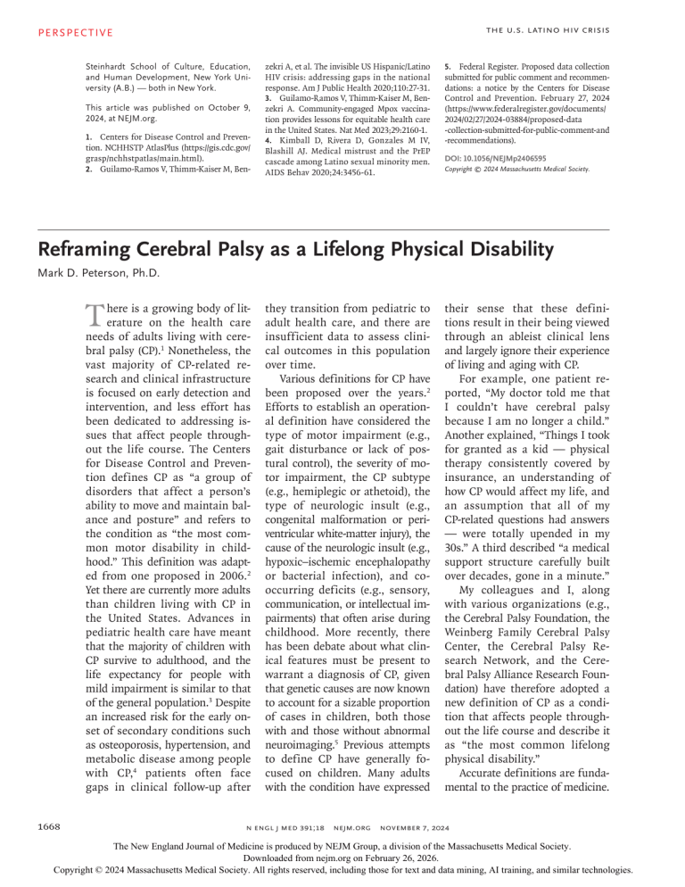 The U.S. Latino HIV Crisis PERS PE C T IV E Steinhardt School of Culture, Education, and Human Development, New York Uni‑ versity (A.B.) — both in New York. This article was published on October 9, 2024, at NEJM.org. 1. Centers for Disease Control and Preven- tion. NCHHSTP AtlasPlus (https://gis.­cdc.­gov/ ­ rasp/­nchhstpatlas/­main.­html). g 2. Guilamo-Ramos V, Thimm-Kaiser M, Ben- zekri A, et al. The invisible US Hispanic/Latino HIV crisis: addressing gaps in the national response. Am J Public Health 2020;110:27-31. 3. Guilamo-Ramos V, Thimm-Kaiser M, Benzekri A. Community-engaged Mpox vaccination provides lessons for equitable health care in the United States. Nat Med 2023;29:2160-1. 4. Kimball D, Rivera D, Gonzales M IV, Blashill AJ. Medical mistrust and the PrEP cascade among Latino sexual minority men. AIDS Behav 2020;24:3456-61. 5. Federal Register. Proposed data collection submitted for public comment and recommendations:a notice by the Centers for Disease Control and Prevention. February 27, 2024 (https://www.­federalregister.­gov/­documents/ ­2024/­02/­27/­2024-­03884/­proposed-­data -­collection-­submitted-­for-­public-­comment-­and -­recommendations). DOI: 10.1056/NEJMp2406595 Copyright © 2024 Massachusetts Medical Society. The U.S. Latino HIV Crisis Reframing Cerebral Palsy as a Lifelong Physical Disability Mark D. Peterson, Ph.D. T Reframing Cerebral Palsy as a Lifelong Disability here is a growing body of literature on the health care needs of adults living with cerebral palsy (CP).1 Nonetheless, the vast majority of CP-related research and clinical infrastructure is focused on early detection and intervention, and less effort has been dedicated to addressing issues that affect people throughout the life course. The Centers for Disease Control and Prevention defines CP as “a group of disorders that affect a person’s ability to move and maintain balance and posture” and refers to the condition as “the most common motor disability in childhood.” This definition was adapted from one proposed in 2006.2 Yet there are currently more adults than children living with CP in the United States. Advances in pediatric health care have meant that the majority of children with CP survive to adulthood, and the life expectancy for people with mild impairment is similar to that of the general population.3 Despite an increased risk for the early onset of secondary conditions such as osteoporosis, hypertension, and metabolic disease among people with CP,4 patients often face gaps in clinical follow-up after 1668 they transition from pediatric to adult health care, and there are insufficient data to assess clinical outcomes in this population over time. Various definitions for CP have been proposed over the years.2 Efforts to establish an operational definition have considered the type of motor impairment (e.g., gait disturbance or lack of postural control), the severity of motor impairment, the CP subtype (e.g., hemiplegic or athetoid), the type of neurologic insult (e.g., congenital malformation or periventricular white-matter injury), the cause of the neurologic insult (e.g., hypoxic–ischemic encephalopathy or bacterial infection), and cooccurring deficits (e.g., sensory, communication, or intellectual impairments) that often arise during childhood. More recently, there has been debate about what clinical features must be present to warrant a diagnosis of CP, given that genetic causes are now known to account for a sizable proportion of cases in children, both those with and those without abnormal neuroimaging.5 Previous attempts to define CP have generally focused on children. Many adults with the condition have expressed n engl j med 391;18 nejm.org their sense that these definitions result in their being viewed through an ableist clinical lens and largely ignore their experience of living and aging with CP. For example, one patient reported, “My doctor told me that I couldn’t have cerebral palsy because I am no longer a child.” Another explained, “Things I took for granted as a kid — physical therapy consistently covered by insurance, an understanding of how CP would affect my life, and an assumption that all of my CP-related questions had answers — were totally upended in my 30s.” A third described “a medical support structure carefully built over decades, gone in a minute.” My colleagues and I, along with various organizations (e.g., the Cerebral Palsy Foundation, the Weinberg Family Cerebral Palsy Center, the Cerebral Palsy Research Network, and the Cerebral Palsy Alliance Research Foundation) have therefore adopted a new definition of CP as a condition that affects people throughout the life course and describe it as “the most common lifelong physical disability.” Accurate definitions are fundamental to the practice of medicine. November 7, 2024 The New England Journal of Medicine is produced by NEJM Group, a division of the Massachusetts Medical Society. Downloaded from nejm.org on February 26, 2026. Copyright © 2024 Massachusetts Medical Society. All rights reserved, including those for text and data mining, AI training, and similar technologies. Reframing Cerebral Palsy as a Lifelong Disability PE R S PE C T IV E Clear criteria are important for identifying, categorizing, diagnosing, and managing diseases, as well as for understanding patients’ needs. They help standardize diagnostic practices, ensure continuity between pediatric and adult care, and reduce variability in care. For example, the Diagnostic and Statistical Manual of Mental Disorders, fifth edition, text revision (DSM-5-TR) provides operational definitions for psychiatric disorders, thereby facilitating reliable diagnosis and appropriate treatment selection. There are currently no comprehensive clinical practice guidelines specific to adults with CP. An important reason for this gap is the lack of clinical and epidemiologic research on the health care ne