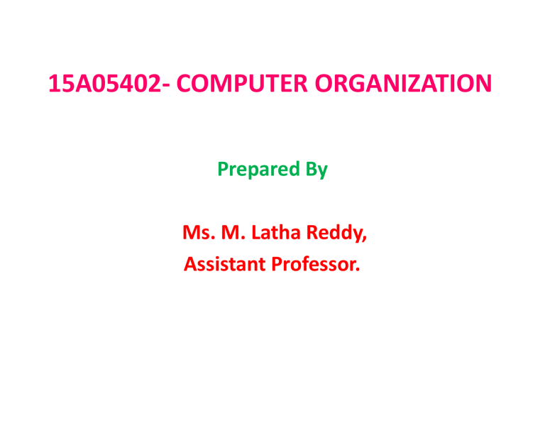 15A05402- COMPUTER ORGANIZATION Prepared By Ms. M. Latha Reddy, Assistant Professor. • JAWAHARLAL NEHRU TECHNOLOGICAL UNIVERSITY ANANTAPUR • B. Tech III-I Sem. (ECE) LTPC 3103 15A05402- COMPUTER ORGANIZATION • UNIT-I Computer types, Functional units, basic operational concepts, Bus structures, Data types, Software: Languages and Translators, Loaders, Linkers, Operating systems. Memory locations addresses and encoding of information – main memory operations Instruction formats and instruction sequences – Addressing modes and instructions -Simple input programming – pushdown stacks – subroutines. • UNIT-II • Register transfer Language, Register transfer, Bus and Memory Transfers, Arithmetic Micro operations, Logic Micro operations, shift Micro operations, Arithmetic Logic Shift Unit. • Stack organization, instruction formats, Addressing modes, Data transfer and manipulation, Execution of a complete instruction, Sequencing of control signals,Program Control. • UNIT-III Control Memory, address Sequencing, Micro Program Example, Design of Control Unit. Addition and Subtraction, Multiplication Algorithms, Division Algorithms, Floating Point Arithmetic Operations, Decimal Arithmetic Unit, Decimal Arithmetic Operations. • UNIT-IV • Peripheral Devices, Input-Output Interface, Asynchronous Data Transfer, Modes of Transfer, Priority Interrupt, Direct Memory Access (DMA), Input-Output Processor (IOP), Serial Communication. Memory hierarchy, main memory, auxiliary memory, Associative memory, Cache memory, Virtual memory, Memory management hardware. • UNIT-V • Parallel Processing, Pipelining, Arithmetic Pipeline, Instruction Pipeline, RISC Pipeline Vector Processing, Array Processors. Characteristics of Multiprocessors, Interconnection Structures, Inter processor Arbitration, Inter-processor Communication and Synchronization, Cache Coherence. • Text Books: 1. M. Morris Mano, “Computer system Architecture”, Prentice Hall of India (PHI), Third edition. 2. William Stallings,“Computer organization and programming”, Prentice Hall of India(PHI) Seventh Edition, Pearson Education(PE) Third edition, 2006. COURSE OUTCOMES • C311.1 Identify functional units, bus structure and addressing modes. • C311.2 Explain the functional units of the processor such as register file and ALU. • C311.3 Make use of memory and I/O devices and virtual memory effectively. • C311.4 Explain the input/output devices. • C311.5 Apply the algorithms for exploring the pipelining and basic characteristics of multiprocessors. Basic Structure of Computers Content Coverage Main Memory System Address Data/Instructio n Central Processing Unit (CPU) Cache memory Operationa l Registers Program Counter Arithmeti c and Logic Unit Instruction Sets Control Unit Input/Output System Advanced Reliable Systems (ARES) Lab. Jin-Fu Li, EE, NCU 7 Functional A computer consists of three main parts: Units A processor (CPU) A main-memory system An I / O system The CPU consists of a control unit, registers, the arithmetic and logic unit, the instruction execution unit, and the interconnections among these components The information handled by a computer Instruction Govern the transfer information within a computer as well as between the computer and its I / O devices Specify the arithmetic and logic operations to be performed Data Numbers and encoded characters that are used as operands by the instructions Advanced Reliable Systems (ARES) Lab. Jin-Fu Li, EE, NCU 8 Progra A list of instructions that performs a task is called a m program The program usually is stored in a memory called program memory The computer is completely controlled by the stored program, except for possible external interruption by an operator or by I / O devices connected to the machine Information handled by a computer must be encoded in a suitable format. Most present-day hardware employs digital circuits that have only two stable states, 0 (OFF) and 1 (ON) Advanced Reliable Systems (ARES) Lab. Jin-Fu Li, EE, NCU 9 Memory Memory The storage area in whichUnit programs are kept when they are running and that contains the data needed by the running programs Types of memory Volatile memory: storage that reta ins data only if it is receiving power, such as dynamic random access memory (DRAM) Nonvolatile memory: a form of memory that retains data even in the absence of a power source and that is used to store programs between runs, such as flash memory Usually, a computer has two classes of storage Primary memory and secondary memory Primary memory Also called main memory. Volatile memory used to hold programs while they are running; typically consists of DRAM in today’s computers Advanced Reliable Systems (ARES) Lab. Jin-Fu Li, EE, NCU 1 0 Memory Secondary memory Unit Nonvolatile memory used to st ore programs and data between runs; typically consists of magnetic disks in today’s computers The memory consists of storage cells, each capable of storing one bit of information The storage cells are processed in groups of fixed size called words To provide easy access to any word in the memory, a distinct address is associated with each word location The number of bits in each word is often referred to as the word length of the computer Typical word length from 16 to 64 bits The capacity of the memory is one factor that characterizes the size of a computer Advanced Reliable Systems (ARES) Lab. Jin-Fu Li, EE, NCU 1 1 Memory Instruction and data can be written into the memory or Unit read out under the control of the processor It is essential to be able to access any word location in the memory as quickly as possible Memory in which any location can be reached in a short and fixed amount of time after spec ifying its address called randomaccess memory (RAM) The time required to access one word is called the memory access time This time is fixed, independent of the location of the word being accessed The memory of a computer is normally implemente