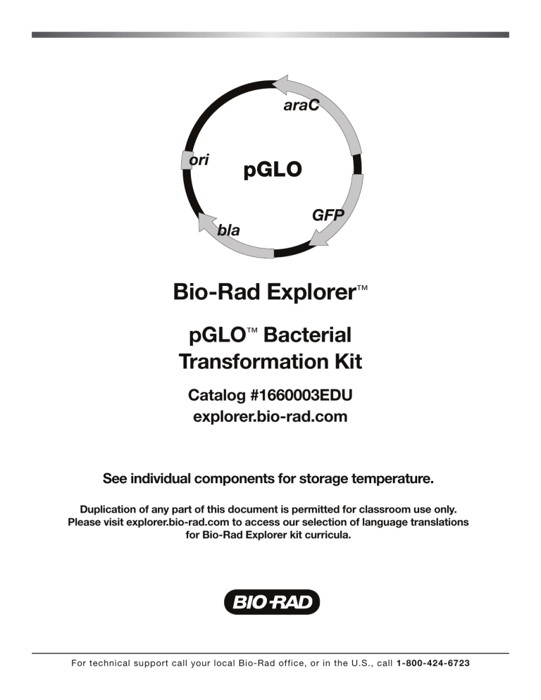 araC ori pGLO GFP bla Bio-Rad Explorer™ pGLO™ Bacterial Transformation Kit Catalog #1660003EDU explorer.bio-rad.com See individual components for storage temperature. Duplication of any part of this document is permitted for classroom use only. Please visit explorer.bio-rad.com to access our selection of language translations for Bio-Rad Explorer kit curricula. For technical support call your local Bio-Rad office, or in the U.S., call 1-800-424-6723 How can jellyfish shed light on the subject? One of the biggest challenges for first-time students of biotechnology or molecular biology is that many of the events and processes they are studying are invisible. The Bio-Rad Explorer program has a solution: a gene from a bioluminescent jellyfish and its Green Fluorescent Protein—GFP. GFP fluoresces a brilliant green when viewed with a hand-held long-wave ultraviolet light (such as a pocket geology lamp). The gene for GFP was originally isolated from the jellyfish, Aequorea victoria. The wild-type jellyfish gene has been modified by Maxygen Inc., a biotechnology company in Santa Clara, California. Specific mutations were introduced into the DNA sequence, which greatly enhance fluorescence of the protein. This modified form of the GFP gene has been inserted into Bio-Rad’s pGLO plasmid and is now available exclusively from Bio-Rad for educational applications. GFP is incredibly bright. Using pGLO to transform bacteria, students can actually observe gene expression in real time. Following the transformation with Bio-Rad’s GFP purification kit, students purify the genetically engineered GFP from their transformed bacteria using a simple chromatography procedure. The entire process is visible using the hand-held UV lamp. Guided Investigation The intent of this curriculum is to guide students through the thought process involved in a laboratory-based scientific procedure. The focus here is not so much on the answer or result, but rather on how the result was obtained and how it can be substantiated by careful observation and analysis of data. This is referred to as a guided inquiry-based laboratory investigation. At each step along the way, student understanding of the process and the analysis of data is stressed. Instead of providing students with explanations or interpretations, the Student Manual poses a series of questions to focus and stimulate thinking about all aspects of the investigation. Answers are provided in the Instructor’s Answer Guide. Student involvement in this process will result in an increased understanding of the scientific process and the value of proceeding into a task in an organized and logical fashion. Furthermore, we are expecting that students who engage in this type of process will start to develop a more positive sense of their ability to understand the scientific method. Bio-Rad’s GFP-based curriculum is unique and has generated an unprecedented level of excitement among science educators. We strive to continually improve our curriculum and products. Your input is extremely important to us. We welcome your stories, comments, and suggestions. Bio-Rad Explorer Team Bio-Rad Laboratories 6000 James Watson Drive Hercules, CA 94547 [email protected] Create context. Reinforce learning. Stay current. New scientific discoveries and technologies create more content for you to teach, but not more time. Bio-Rad Explorer kits help you teach more effectively by integrating multiple core content subjects into a single lab. Connect concepts with techniques and put them into context with real-world scenarios. • Genetic engineering of organisms • Use of experimental controls • Interpretation of experimental results • Calculate transformation efficiency Environmental and Health Science • Genetically modified organisms (GMOs) • GMOs in research, medicine, nutrition, and bioremediation • Global challenges of GMOs • Microbiology Scientific Inquiry pGLO Bacterial Transformation Chemistry of Life Kit • Prokaryotic cell structure and cell division • Selective growth media • Bacterial metabolism • Antibiotic selection and resistance genes • Selection mechanisms • Adaptation to environment • Bacterial conjugation and gene transmission Cell and Molecular Biology Evolution Genetics • DNA structure, function, and chemistry • Chemical properties of biological molecules • Effects of temperature and pH on biochemical reactions • DNA > RNA > protein > trait • Bacterial transformation • The lac operon • Creating genetically engineered organisms (GMOs) • Structure and function of genes • Gene regulation and transcription factors Table of Contents Instructorʼs Guide Page Introduction to Transformation ........................................................................................1 The pGLO System ..........................................................................................................1 Kit Inventory Checklist......................................................................................................2 Implementation Timeline ..................................................................................................5 Safety Issues ..................................................................................................................5 Lesson Points to Highlight................................................................................................6 General Laboratory Skills ......................................................................6 Experimental Points – Optimizing your pGLO Lab Experiment ............7 Conceptual Points ..................................................................................8 Instructor’s Advance Preparation Overview....................................................................11 Workstation Checklist ....................................................................................................11 Instructor’s Advance Preparation 