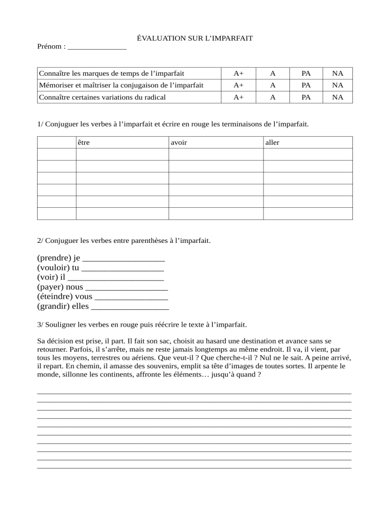 ÉVALUATION SUR L’IMPARFAIT Prénom : _______________ Connaître les marques de temps de l’imparfait A+ A PA NA Mémoriser et maîtriser la conjugaison de l’imparfait A+ A PA NA Connaître certaines variations du radical A+ A PA NA 1/ Conjuguer les verbes à l’imparfait et écrire en rouge les terminaisons de l’imparfait. être avoir aller 2/ Conjuguer les verbes entre parenthèses à l’imparfait. (prendre) je __________________ (vouloir) tu __________________ (voir) il _____________________ (payer) nous __________________ (éteindre) vous ________________ (grandir) elles _________________ 3/ Souligner les verbes en rouge puis réécrire le texte à l’imparfait. Sa décision est prise, il part. Il fait son sac, choisit au hasard une destination et avance sans se retourner. Parfois, il s’arrête, mais ne reste jamais longtemps au même endroit. Il va, il vient, par tous les moyens, terrestres ou aériens. Que veut-il ? Que cherche-t-il ? Nul ne le sait. A peine arrivé, il repart. En chemin, il amasse des souvenirs, emplit sa tête d’images de toutes sortes. Il arpente le monde, sillonne les continents, affronte les éléments… jusqu’à quand ? ________________________________________________________________________________ ________________________________________________________________________________ ________________________________________________________________________________ ________________________________________________________________________________ ________________________________________________________________________________ ________________________________________________________________________________ ________________________________________________________________________________ ________________________________________________________________________________ ________________________________________________________________________________ ________________________________________________________________________________