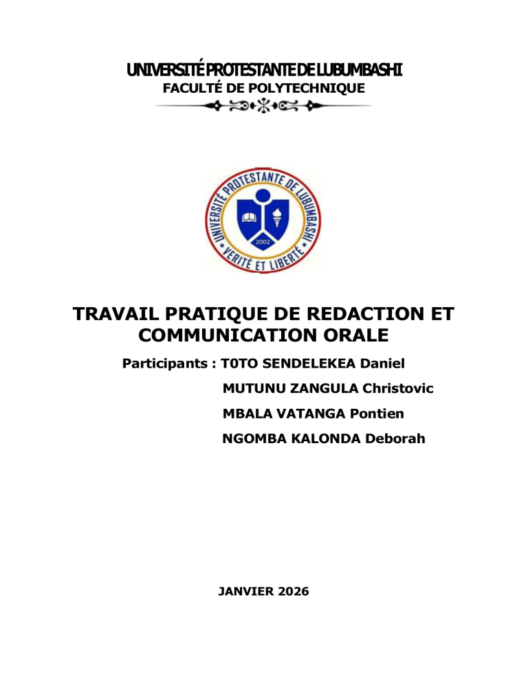UNIVERSITÉPROTESTANTEDELUBUMBASHI FACULTÉ DE POLYTECHNIQUE TRAVAIL PRATIQUE DE REDACTION ET COMMUNICATION ORALE Participants : T0TO SENDELEKEA Daniel MUTUNU ZANGULA Christovic MBALA VATANGA Pontien NGOMBA KALONDA Deborah JANVIER 2026 Thème : Le Curriculum Vitae (CV) INTRODUCTION GÉNÉRALE Le curriculum vitae, communément appelé CV, est un document essentiel dans le processus de recherche d’emploi et d’insertion professionnelle. Il représente le premier contact entre un candidat et un recruteur et joue un rôle déterminant dans la sélection des candidats. Dans un contexte marqué par une concurrence accrue sur le marché de l’emploi, notamment pour les jeunes diplômés, la qualité du CV devient un facteur décisif. Malgré la possession de compétences et de diplômes, plusieurs candidats peinent à intégrer le monde professionnel en raison d’un CV mal rédigé ou inadapté. C’est dans cette optique que ce travail s’intéresse au curriculum vitae, afin d’en analyser l’importance, les règles de rédaction et son rôle dans le processus de recrutement. CHAPITRE I : NOTIONS GÉNÉRALES SUR LE CURRICULUM VITAE I.1. Définition du curriculum vitae Le curriculum vitae est un document écrit qui présente de manière synthétique le parcours académique, les expériences professionnelles, les compétences et les informations personnelles d’un individu. Il permet au recruteur d’avoir une vue d’ensemble du profil du candidat. I.2. Rôle du curriculum vitae Le CV sert principalement à : • Présenter le candidat • Mettre en valeur ses compétences et expérience • Permettre au recruteur d’effectuer une présélection I.3. Types de curriculum vitae On distingue généralement : • Le CV chronologique • Le CV fonctionnel • Le CV mixte Chaque type est choisi en fonction du profil du candidat et du poste visé. CHAPITRE II : RÈGLES DE RÉDACTION D’UN BON CURRICULUM VITAE II.1. Présentation générale Un bon CV doit être clair, concis et lisible. Il ne doit pas dépasser deux pages et doit être bien structuré. II.2. Contenu d’un curriculum vitae Un CV doit généralement contenir : • Les informations personnelles • La formation académique • Les expériences professionnelles • Les compétences • Les langues et centres d’intérêt II.3. Erreurs à éviter Parmi les erreurs courantes, on peut citer : • Les fautes d’orthographe • Les informations inutiles • Une mauvaise mise en page • L’absence d’adaptation au poste visé CHAPITRE III : IMPORTANCE DU CV DANS LE PROCESSUS DE RECRUTEMENT Le CV permet au recruteur de sélectionner rapidement les candidats correspondant au profil recherché. Un CV bien rédigé augmente considérablement les chances d’être convoqué à un entretien d’embauche. Il constitue ainsi un outil stratégique pour l’accès à l’emploi et l’évolution professionnelle. CONCLUSION GÉNÉRALE Au terme de cette étude, il ressort que le curriculum vitae occupe une place centrale dans le processus de recrutement. Sa qualité et sa pertinence conditionnent en grande partie l’accès à l’emploi. Il est donc indispensable pour tout candidat de maîtriser les règles de rédaction d’un CV afin d’améliorer son employabilité et ses perspectives professionnelles.