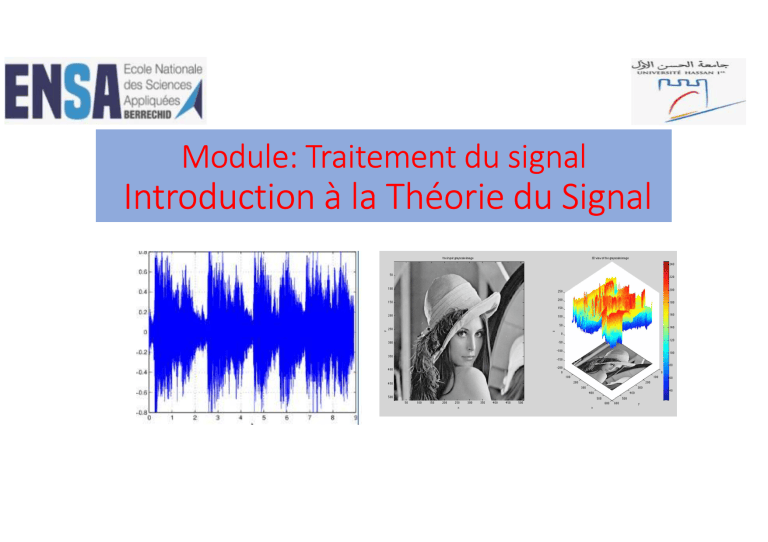 Module: Traitement du signal Introduction à la Théorie du Signal Plan I. Introduction II. Signal 1.Géneralités et Définitions 2. Rappel Mathématique III. Classification des signaux IV. Applications de traitement du signal V. Développement en Série de Fourier VI. Conclusion 2 Objectifs Acquérir les notions de base de traitement du signal Savoir définir un signal Acquérir un langage spécifique au signal et son traitement Savoir décrire une chaine de traitement Savoir les domaines d’application de traitement du signal Connaitre les différentes types de signaux Savoir la décomposition en série de Fourier d’un signal 3 I. Introduction Les relations de l'homme avec son milieu naturel ou avec les systèmes techniques qu’ il construit se caractérisent par un intense échange d'informations Bref Historique: 1930-1940 : Radar (reconnaissance des signaux avions ennemis pendant la deuxième guerre mondiale ) 1950: Circuits analogiques. 1960 : Théorie de l’information (Shanon): Techniques de modulations des signaux. 1970 Filtres, 1980 CD, images médicales, télédétection 1990 Circuits intégrés consommables 2000+ réseaux télécom, capteurs avancés Traiter un signal c’est extraire l’information véhiculée par celui ci. 4 II. Signal 1. Définition et Généralités Un signal décrit la relation entre un paramètre et un autre paramètre Exemple en électronique, une tension électrique variant dans le temps. Comme chaque paramètre peut être considéré comme continu, nous appelons cela un signal continu. Le traitement du signal (TS) s’appuie sur les ressources de l’électronique, de l’informatique et de la physique appliquée, TS permet de créer, d'analyser et de transformer les signaux en vue de leur exploitation, Principales fonctions du traitement de signal sont : • L’analyse • La mesure • Le filtrage et La régénération . 5 II. Signal 1. Définition et Généralités Un signal est une grandeur physique mesurable de nature quelconque porteuse d’information. Un capteur permet de capter et convertir un signal en une grandeur électrique 6 II. Signal 1. Définition et Généralités Exemples : Signaux optiques, magnétiques, radioélectriques. . . Onde acoustique : courant délivré par un microphone (parole, musique, …) Signaux biologiques : activité électrique du cerveau, activité musculaire du cœur, Tension aux bornes d'un condensateur en charge, Signaux géophysiques : vibrations sismiques, Images, Vidéos etc. 7 II.Signal 2. Rappel Mathématique Traiter un signal c’est extraire l’information véhiculée par celui-ci. Un signal peut être utile pour un récepteur et non pour un autre. Pour un traitement il faut un background mathématique Trigonométrie 8 II. Signal 2. Rappel mathématique Nombre complexe Comme les nombres complexes ont deux composantes (partie réelle et partie imaginaire) On peut les placer dans un repère en inscrivant la partie réelle sur l'axe des abscisses et la partie imaginaire sur l'axe des ordonnées Pour un nombre complexe z=a+bi, on a toujours : =cos(x)+ ( ) 9 II. Signal 2. Rappel mathématique Nombre complexe Comme les nombres complexes ont deux composantes (partie réelle et partie imaginaire) On peut les placer dans un repère en inscrivant la partie réelle sur l'axe des abscisses et la partie imaginaire sur l'axe des ordonnées Pour un nombre complexe z=a+bi, on a toujours : =cos(x)+ ( ) 10 III. Classification des signaux Classification phénoménologique On considère la nature de l'évolution du signal en fonction du temps. Il apparaît deux types de signaux : Les signaux déterministes : ou signaux certains, leur évolution en fonction du temps peut être parfaitement modélisée par une fonction mathématique. X(t)=A cos(2πf0.t+ϕ) 11 III. Classification des signaux Classification phénoménologique Les signaux aléatoires : leur comportement temporel est imprévisible. Il faut faire appel à leurs propriétés statistiques pour les décrire. Si leurs propriétés statistiques sont invariantes dans le temps, on dit qu'ils sont stationnaires les signaux aléatoires non stationnaires, qui ne jouissent pas de cette propriété 12 III. Classification des signaux Classification énergétique Soit un signal x(t) défini sur −∞, +∞ L’énergie de x(t) E= Puissance de x(t) T-périodique P= ( ) / / ( ) Signaux à énergie finie : possèdent une puissance moyenne nulle et une énergie finie. Signaux à puissance moyenne finie : possèdent une énergie infinie et sont donc physiquement irréalisables. 13 IV. Applications Les applications du traitement du signal sont extrêmement nombreuses et variées Télécom Automo bile Analyses biomédi cales Reconnaissance de formes Télédétection Domaine d’application Aéronautique Géophysique Prospection minière Reconnaissa nce de formes Radar Surveillance industrielle Traitement d’images 14 V. Développement en Série de Fourier Théorème de Fourier La série de Fourier permet de représenter toutes les fréquences contenues dans un signal périodique dont la fonction x(t) est connue mathématiquement Un signal est pair si s(-t) = s (t) : Un signal est impair si s(-t) = - s(t) : bn=0 an=0 15 V. Développement en Série de Fourier Théorème de Fourier La série de Fourier permet de représenter toutes les fréquences contenues dans un signal périodique dont la fonction x(t) est connue mathématiquement Un signal est pair si s(-t) = s (t) : Un signal est impair si s(-t) = - s(t) : bn=0 an=0 16 V. Développement en Série de Fourier Représentation complexe : S = = S(t)= + ∑ &' !" # () # + ∑ &' + ∑ &' + )$ ) # + $ !%" # *) # +$ + + + )$ = () # ) # *) # +) On pose 17 V. Développement en Série de Fourier Représentation complexe On peut écrire = , = )$ + = + ∑ &' , + ∑ &' , = = ' . . , = +-, &' ) # ) # ) # + - , !( # ) / − ) ' . . & ' ' . . ) # ) # +, ) # + ∑ &' , ) # = - , ) # & ( # )/ / 18 V. Développement en Série de Fourier S
