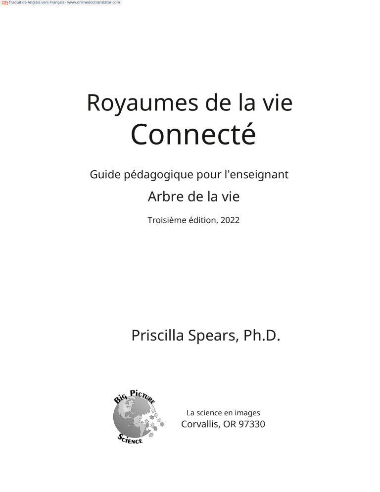 Traduit de Anglais vers Français - www.onlinedoctranslator.com Royaumes de la vie Connecté Guide pédagogique pour l'enseignant Arbre de la vie Troisième édition, 2022 Priscilla Spears, Ph.D. La science en images Corvallis, OR 97330 Dédié à M. Morris Jennison, mon professeur de biologie au lycée. Il m'a donné la liberté d'explorer. Les règnes du vivant interconnectés : Guide pédagogique sur l'Arbre de VieTroisième édition Troisième édition © 2022 par Priscilla Spears Deuxième édition © 2016, 2019 par Priscilla Spears Première édition © 2008, 2009 et 2013 par Priscilla Spears Publié et distribué par Big Picture Science Boîte postale 829 Corvallis, OR 97339www.bigpicturescience.biz Imprimé aux États-Unis d'Amérique L'acheteur est autorisé à reproduire des extraits de cet ouvrage, mais UNIQUEMENT pour un usage en classe. Veuillez demander aux autres enseignants d'acquérir leur propre exemplaire. Pour toute autre reproduction, même partielle, de cet ouvrage, veuillez contacter Priscilla Spears afin d'obtenir son autorisation. Vous pouvez la joindre via www.priscillaspears.com. ISBN-10 : 0-9821517-3-x ISBN-13 : 978-0-9821517-3-0 COUVERTURE AVANT : Image composite des graphiques des leçons sur « L’avènement des royaumes ». Veuillez noterque les fichiers de ces graphiques sont disponibles en téléchargement et impression gratuits sur le site web Big Picture Science,www.bigpicturescience.biz , sous une licence Creative Commons qui interdit toute utilisation commerciale. IMAGES DE LA QUATRE COUVERTURE, en partant du coin supérieur gauche : Modèle d’adénovirus – domaine public, photo du Dr Richard Feldmann, avec l’aimable autorisation du National Cancer Institute ; les autres photos sont la propriété de l’auteur. Algue rouge ; varech, une algue brune ; photomicrographie de spores de basidiomycète ; champignon de la rouille sur la face inférieure d’une feuille ; photomicrographie d’ascospores alignées dans les sacs d’un champignon en forme de coupe ; guêpe commune ; cônes de graines deÉphédra; strobile deEquisetum telmatiea ; renard roux;Zinniahybride. Autres livres de Priscilla Spears, disponibles surwww.bigpicturescience.biz : De la biosphère aux atomes : un guide pédagogique sur l'organisation du monde vivant.2e édition. (2013) Big Picture Science. ISBN 978-0-9821517-2-3. Leçons sur les plantes : Initier les enfants à la forme et à la fonction des plantes. 2e édition. (2010) Big Picture Science. ISBN 978-0-9821517-1-6. Changements dans la troisième édition À l'instar des êtres vivants qu'ils décrivent, les termes et concepts biologiques évoluent. L'évolution rapide de nos connaissances et de nos idées exige des mises à jour fréquentes. Lors de ma révision, j'ai donc révisé…Les règnes du vivant connectésHuit ans seulement après sa première publication, j'espérais que la seconde édition serait utile plus longtemps. Il n'en fut rien. Début 2022, j'ai compris qu'une nouvelle révision s'imposait. Mon objectif pour cette édition reste le même que pour les précédentes : proposer ce livre comme une source d'informations utiles pour initier les enfants à la diversité du vivant. Les modifications apportées à cette édition sont les suivantes : j’ai ajouté une leçon fondamentale importante : une introduction à l’Arbre de Vie dans son ensemble. Elle offre une vue d’ensemble indispensable avant d’étudier plus en détail chaque partie de l’Arbre de Vie. Chez les protistes, les biologistes ont abandonné le terme « chromalvéolés ». Le règne des champignons a fait l'objet d'une importante refonte de ses lignées. L'arbre phylogénétique et les noms de plusieurs branches sont nouveaux. Les embranchements du règne animal restent inchangés, mais le nom d'une branche de protostomiens a évolué. Autrefois appelée « Lophotrochozoa », cette branche est encore parfois désignée sous le nom de « Spiralia » par de nombreux biologistes. Dans le règne végétal, des études ont révélé que les anthocérotes constituent la première branche des bryophytes. Les hépatiques et les mousses sont désormais considérées comme des groupes frères. La position des gnétophytes au sein des gymnospermes reste à déterminer, et plusieurs hypothèses intéressantes sont actuellement à l'étude. Tout cela confirme l'idée que la vie est loin d'être monotone. Son étude ne devrait pas l'être non plus. J'espère que ce livre vous éclairera et enrichira votre exploration de la diversité du vivant. - Priscilla Spears, Ph.D., septembre 2022 À propos de la deuxième édition Au cours des huit années écoulées depuis que j'ai écritLes règnes du vivant connectésDepuis, les informations sur la diversité du vivant, et notamment sur les liens de parenté génétique entre les organismes, n'ont cessé d'affluer. Les biologistes ont levé certaines incertitudes et certaines conceptions des lignées fondamentales ont évolué. Rassurez-vous, ces changements ne sont pas majeurs, mais j'estimais qu'ils justifiaient une nouvelle édition. Je souhaitais également clore définitivement le chapitre des Cinq Règnes et me consacrer à la systématique phylogénétique, la classification de l'Arbre de la Vie utilisée par la plupart des biologistes et enseignée dans les cours de niveau supérieur. La terminologie scientifique évolue, j'ai donc apporté quelques modifications. J'ai introduit un nouveau terme pour désigner les principaux groupes d'eucaryotes : les supergroupes eucaryotes. Les quatre supergroupes actuellement reconnus incluent un nouveau, SAR, qui représente la lignée commune des chromalvéolés et des rhizariens. Les autres sont les archéplastides, les excavés et les unikontes, désormais également appelés Amorphea. J'ai enrichi le chapitre sur les virus, notamment avec des informations pour aider les enfants à comprendre les images qu'ils voient, et des détails supplémentaires sur