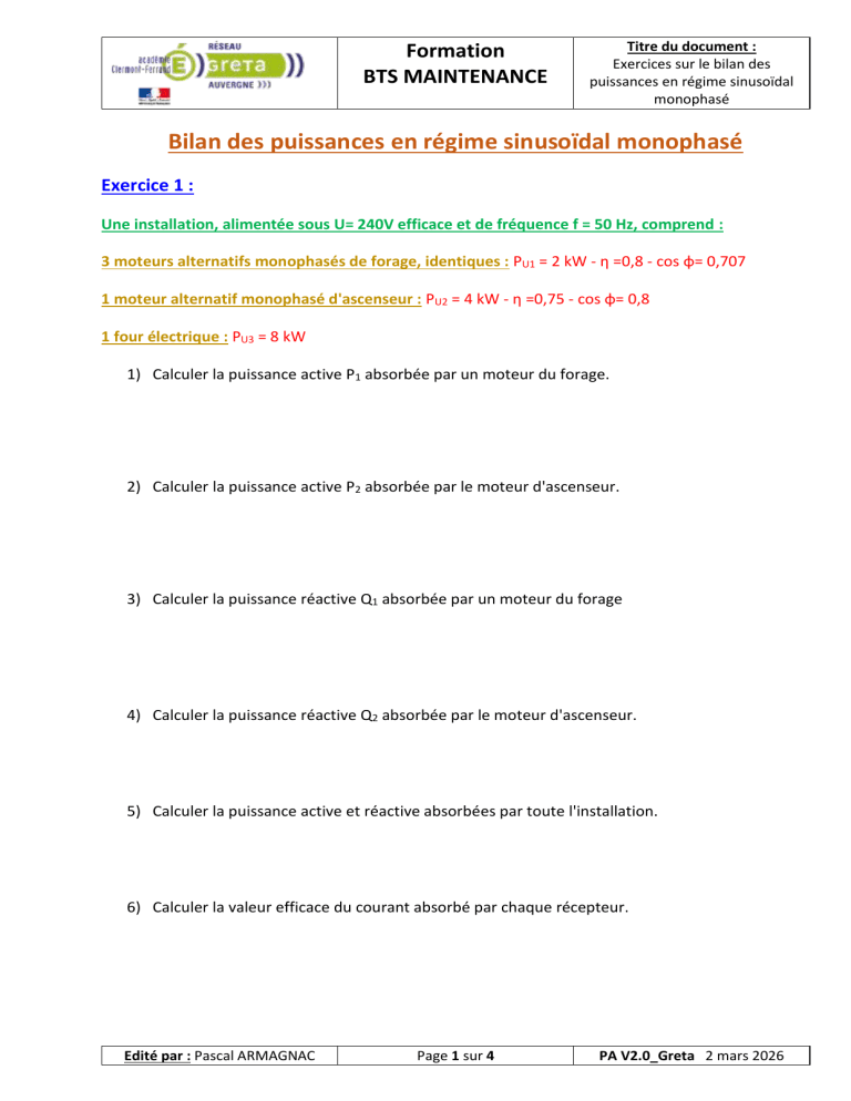 Formation BTS MAINTENANCE Titre du document : Exercices sur le bilan des puissances en régime sinusoïdal monophasé Bilan des puissances en régime sinusoïdal monophasé Exercice 1 : Une installation, alimentée sous U= 240V efficace et de fréquence f = 50 Hz, comprend : 3 moteurs alternatifs monophasés de forage, identiques : PU1 = 2 kW - η =0,8 - cos φ= 0,707 1 moteur alternatif monophasé d'ascenseur : PU2 = 4 kW - η =0,75 - cos φ= 0,8 1 four électrique : PU3 = 8 kW 1) Calculer la puissance active P1 absorbée par un moteur du forage. 2) Calculer la puissance active P2 absorbée par le moteur d'ascenseur. 3) Calculer la puissance réactive Q1 absorbée par un moteur du forage 4) Calculer la puissance réactive Q2 absorbée par le moteur d'ascenseur. 5) Calculer la puissance active et réactive absorbées par toute l'installation. 6) Calculer la valeur efficace du courant absorbé par chaque récepteur. Edité par : Pascal ARMAGNAC Page 1 sur 4 PA V2.0_Greta 2 mars 2026 Formation BTS MAINTENANCE Titre du document : Exercices sur le bilan des puissances en régime sinusoïdal monophasé 7) Calculer (en appliquant deux méthodes différentes) la valeur efficace du courant absorbée par toute l'installation. 8)Calculer le facteur de puissance de l'installation. 9) On veut ramener ce facteur de puissance à 0,96, déterminer la valeur de la puissance réactive qu'il faut installer. 10) En déduire la valeur de la capacité qui fournira cette puissance réactive. 11) Calculer la nouvelle valeur efficace du courant absorbée par toute l'installation Exercice 2 : Un circuit de puissance est alimenté par un réseau monophasé 240 V, 50 Hz et comporte : • 2 fours électriques, absorbant chacun une puissance nominale de 1500 W . • 2 moteurs asynchrones. Chacun absorbe une puissance active nominale Pa avec un facteur de puissance cos φ= 0,85 et fournit une puissance utile nominale Pu = 1200 W avec un rendement h= 80%. 1)Calculer la puissance active et réactive absorbées par un seul moteur en régime nominal. 2) Les 3 fours et les 2 moteurs fonctionnent simultanément. Calculer les puissances active P, réactive Q et apparente S absorbées par tout le circuit de puissance. Edité par : Pascal ARMAGNAC Page 2 sur 4 PA V2.0_Greta 2 mars 2026 Formation BTS MAINTENANCE Titre du document : Exercices sur le bilan des puissances en régime sinusoïdal monophasé 3) En déduire la valeur efficace I de l'intensité totale du courant en ligne, ainsi que le facteur de puissance de cette installation 4) On veut ramener le facteur de puissance de l'installation à 1, calculer la valeur de la puissance réactive ramenée par le condensateur. 5) Calculer dans ce cas la valeur de la capacité. Exercice 3 : Une installation 230 V, 50 Hz alimente trois moteurs dont les caractéristiques sont les suivantes : - moteur M 1 : puissance absorbée : P1 = 1 kW ; facteur de puissance cos φ= 0,80 ; - moteur M 2 : puissance absorbée : P2 = 1,2 kW ; facteur de puissance cos φ= 0,75 ; - moteur M 3 : puissance absorbée : P3 = 2 kW ; facteur de puissance cos φ= 0,84. • Calculer les puissances active, réactive et apparente fournies totales • Calculer la valeur du facteur de puissance dans ces conditions. • Calculer la valeur efficace de l'intensité du courant de l'installation. Edité par : Pascal ARMAGNAC Page 3 sur 4 PA V2.0_Greta 2 mars 2026 Formation BTS MAINTENANCE Titre du document : Exercices sur le bilan des puissances en régime sinusoïdal monophasé Exercice 4 : Une installation, alimentée sous U= 240V efficace et de fréquence f = 50 Hz, comprend : • Récepteur n°1 : P1 = 1,2 kW ; Q1 = 2 kVar ; • Récepteur n°2 : P2 = 2,5 kW ; Q2 = 1,8 kVar ; • Récepteur n°3 : Moteur triphasé asynchrone de puissance utile Pu = 1,2 kW ; de rendement = 80% et de facteur de puissance fp = 0,84 ; • Récepteur n°4 : Radiateur triphasé de puissance P4 = 1,8 kW ; 1- Déterminer, lorsque tous les appareils sont sous tension la puissance active P, la puissance réactive Q, la puissance apparente S ainsi que le facteur de puissance fp de cette installation. 2- En déduire l'intensité I. 3- On désire relever le facteur de puissance fp' = 1, déterminer la valeur de la puissance réactive qu'il faut installer. 4-En déduire dans ce cas la valeur de la capacité. 5- Calculer alors la nouvelle intensité I' qui circule dans une ligne de l'installation. Edité par : Pascal ARMAGNAC Page 4 sur 4 PA V2.0_Greta 2 mars 2026