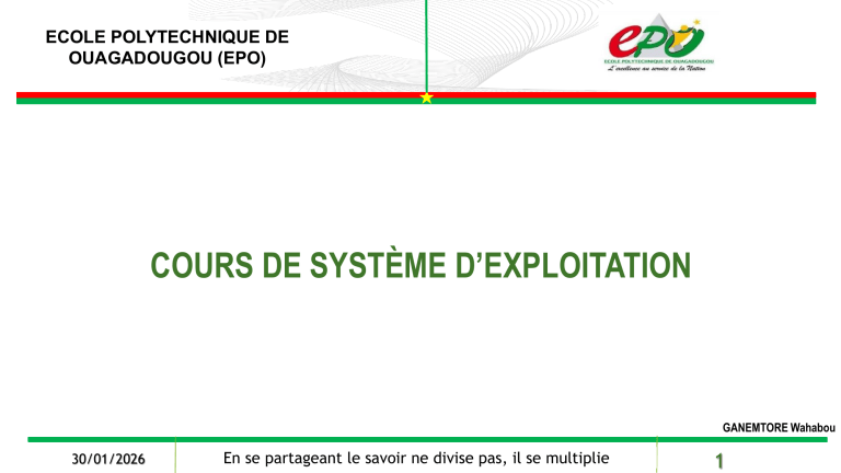 ECOLE POLYTECHNIQUE DE OUAGADOUGOU (EPO) COURS DE SYSTÈME D’EXPLOITATION GANEMTORE Wahabou 30/01/2026 JUILLET 2022 En se partageant le savoir ne divise pas, il se multiplie 11 ECOLE POLYTECHNIQUE DE OUAGADOUGOU (EPO) CHAP I: INTRODUCTION 1-DEFINITION D’UN SYSTÈME D’EXPLOITATION 2-DÉCRIRE LES COMPOSANTS D’UN SYSTÈME D’EXPLOITATION 3- COMPOSANTS DE BASE D’UN ORDINATEUR CHAP II: PRISE EN MAIN D’UN SYSTÈME D’EXPLOITATION (WINDOWS ET LINUX) 1- FONCTIONS PRINCIPALES D’UN SYSTÈME D’EXPLOITATION 2-GESTION DES UTILISATEURS CHAP III: PRISE EN MAIN D’UNE SUITE BUREAUTIQUE (MS office, Open office) 1- TRAITEMENT DE TEXTE (MISE EN FORME,…) 2- TABLEUR (FORMULES USUELLES DE CALCUL) 30/01/2026 En se partageant le savoir ne divise pas, il se multiplie 2 CHAP I: INTRODUCTION OBJECTIF GENERAL Ce cours s’adresse plus généralement à toute personne (étudiant) ayant un Bac scientifique ou équivalent avec la vocation d’apprendre le cours de système d’exploitation. OBJECTIFS SPÉCIFIQUES: A la fin de ce cours chaque étudiant doit pouvoir: -Définir un système d’exploitation; -Décrire les composants d’un système d’exploitation; -Utiliser les principales commandes d’un système d’exploitation; -Décrire les fonctions principales d’un système d’exploitation; -Utiliser un outil bureautique. 30/01/2026 En se partageant le savoir ne divise pas, il se multiplie 3 CHAP I: INTRODUCTION 1-DEFINITION D’UN SYSTÈME D’EXPLOITATION ET SES FONCTIONS A- DÉFINITION Le système d’exploitation est le logiciel de base d’un ordinateur, il peut-être définit comme: • L’interface qui rend possible la communication homme-machine, • L’intermédiaire entre la partie logicielle et la partie matériel, • Le premier programme exécuté lorsque l’ordinateur est mis en marche, Il existe plusieurs systèmes d’exploitation: Windows, Mac OS, Unix, Linux, Android, etc. Il représente le modèle: Utilisateur -> Système d’exploitation->Machine (Matériel et logiciel) B- Les FONCTION D’UN SYSTÈME D’EXPLOITATION Un système d'exploitation réalise 4 grands types de fonctions : • La gestion des processus (= applications en cours d'exécution) • La gestion de la mémoire • La gestion des périphériques d'entrée/sortie • La gestion du système de fichiers 30/01/2026 En se partageant le savoir ne divise pas, il se multiplie 4 CHAP I- INTRODUCTION 2-DÉCRIRE LES COMPOSANTS D’UN SYSTÈME D’EXPLOITATION (1/5) *Le noyau La partie principale d’un SE, c’est son noyau (Kernel), Il offre en générale les fonctionnalités suivantes: -l’exécution et ordonnancement des programmes (choisir les processus qui vont être exécutés); -l’utilisation et la gestion des ressources de l’ordinateur comme de la mémoire; -la gestion des périphériques; -la gestion et la communication via le réseau; -Interface utilisateur graphique -Les pilotes… *Interpréteur de commande (Shell) Un interpréteur de commandes, ou shell, est un programme qui agit comme l'interface textuelle principale entre l'utilisateur et le système d'exploitation (noyau/kernel). 30/01/2026 En se partageant le savoir ne divise pas, il se multiplie 5 CHAP I- INTRODUCTION 2-DÉCRIRE LES COMPOSANTS D’UN SYSTÈME D’EXPLOITATION (2/5) Il prend les commandes saisies au clavier, les interprète, les exécute, puis affiche le résultat. Il permet d'automatiser des tâches via des scripts et de gérer les fichiers et processus. Sur les SE utilisant les distributions Lunix, le shell représente le terminal (Console) et sur les systèmes Windows, il représente CMD (invite de commandes) Caractéristiques principales du Shell : Interface en ligne de commande (CLI) : Contrairement aux interfaces graphiques (GUI), le shell utilise une console textuelle pour interagir avec l'ordinateur. Interprétation et exécution : Il analyse la ligne de commande, identifie la commande et ses arguments, puis transmet les instructions au système. Langage de script : Il permet d'écrire des scripts (fichiers contenant une suite de commandes) pour automatiser des tâches répétitives. 30/01/2026 En se partageant le savoir ne divise pas, il se multiplie 6 CHAP I- INTRODUCTION 2-DÉCRIRE LES COMPOSANTS D’UN SYSTÈME D’EXPLOITATION (3/5) Description du shell *Quelques commandes shell sous Windows Pour les commandes de fichier: -copy / del / rename / xcopy: Déplacer ou supprimer des fichiers et des répertoires. -robocopy: Copie/synchronisation robuste des dossiers. -cd / dir / mkdir / rmdir / tree: Se déplacer entre les dossiers, dresser la liste de leur contenu et créer/supprimer des répertoires. 30/01/2026 En se partageant le savoir ne divise pas, il se multiplie 7 CHAP I- INTRODUCTION 2-DÉCRIRE LES COMPOSANTS D’UN SYSTÈME D’EXPLOITATION (4/5) Pour les tâches réseau: ipconfig / ping / tracert / netstat / nslookup / netsh / arp -a / hostname / pathping / getmac / nbtstat / shutdown /i: Diagnostiquer et configurer les paramètres du réseau, les connexions et les arrêts à distance. Informations système et processus: systeminfo / winver: Afficher les détails du système d’exploitation. tasklist / taskkill: Visualiser les processus en cours et y mettre fin. wmic: Gestion avancée du système (matériel, logiciel, etc.). Gestion des disques : diskpart / chkdsk / format / list disk / select disk / clean: Partitionner, vérifier et formater les disques. 30/01/2026 En se partageant le savoir ne divise pas, il se multiplie 8 CHAP I- INTRODUCTION 2-DÉCRIRE LES COMPOSANTS D’UN SYSTÈME D’EXPLOITATION (5/5) *Système de gestion de fichiers (SGF) Le système de gestion de fichiers est la partie la plus visible d'un système d'exploitation. Il est une façon de stocker les informations et de les organiser dans des fichiers sur des mémoires secondaires (pour le matériel informatique, il s'agit de mémoire de masse comme un disque dur, un disque SSD, un CD-ROM, une clé USB, une disquette, etc.). C'est
