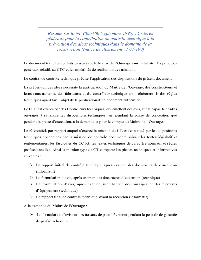 Résumé sur la NF P03-100 (septembre 1995) : Critères généraux pour la contribution du contrôle technique à la prévention des aléas techniques dans le domaine de la construction (Indice de classement : P03-100) Le document traite les contrats passés avec le Maitre de l’Ouvrage ainsi relate-t-il les principes généraux relatifs au CTC et les modalités de réalisation des missions. Le contrat de contrôle technique précise l’application des dispositions du présent document. La prévention des aléas nécessite la participation du Maitre de l’Ouvrage, des constructeurs et leurs sous-traitants, des fabricants et du contrôleur technique ainsi élaborent-ils des règles techniques ayant fait l’objet de la publication d’un document authentifié. Le CTC est exercé par des Contrôleurs techniques, qui émettent des avis, sur la capacité desdits ouvrages à satisfaire les dispositions techniques tant pendant la phase de conception que pendant la phase d’exécution, à la demande et pour le compte du Maitre de l’Ouvrage. Le référentiel, par rapport auquel s’exerce la mission du CT, est constitué par les dispositions techniques concernées par la mission de contrôle documenté suivant les textes législatif et réglementaires, les fascicules du CCTG, les textes techniques de caractère normatif et règles professionnelles. Ainsi la mission type de CT comporte les phases techniques et informatives suivantes : ➢ Le rapport initial de contrôle technique, après examen des documents de conception (informatif) ➢ La formulation d’avis, après examen des documents d’exécution (technique) ➢ La formulation d’avis, après examen sur chantier des ouvrages et des éléments d’équipement (technique) ➢ Le rapport final de contrôle technique, avant la réception (informatif) A la demande du Maître de l'Ouvrage : ➢ La formulation d'avis sur des travaux de parachèvement pendant la période de garantie de parfait achèvement. Le contrat de contrôle technique prévoit que le Maitre de l’Ouvrage prend des mesures tels une indication et sujétions de l’utilisation de l’ouvrage, fourniture des données, accès au chantier en temps utile et le mise à niveau des informations dans l’optique d’une bonne gestion avec le contrôleur technique. Dans sa mission le CT n’examine pas les dispositions relatives aux espaces verts et aux aménagements extérieurs, ni celles concernant les aménagements spécifiques des activités professionnelles.IL ne procède pas aux vérifications de l’implantation, des cotes qui n’ont pas d'incidence sur l'objet de sa mission ou métrés des ouvrages et éléments d'équipement soumis au contrôle, ni prendre en compte les risques liés aux cas de force majeure. Il se réfère aux caractéristiques des matériaux, équipements et appareils telles qu'elles sont attestées par les certificats de produits ou procès-verbaux d'essais qui lui sont fournis. Le CT émet des avis suspendus quand les dispositions soumises à son contrôle sont trop générales pour justifier un avis favorable en l'absence de précisions complémentaires. Les missions de CT se classent en trois catégories : les missions de base L Solidité et S Sécurité, les missions complémentaires et les missions composées (somme de plusieurs missions de base ou complémentaire) La rémunération du Contrôleur Technique est fixée en considération des éléments d'information fournis par le Maître de l'Ouvrage sur la destination, l'importance, la nature des ouvrages et la durée des travaux soumis au contrôle (Voir Annexe B). Un ajustement est aussi prévu dans le cas où le Maitre de l’Ouvrage n’est pas en mesure de renseigner complétement la note d’information. Le contrôleur technique procède au choix des personnels techniques et évalue le temps d’intervention en fonction de l’étendue de la mission et caractéristiques de l’installation.