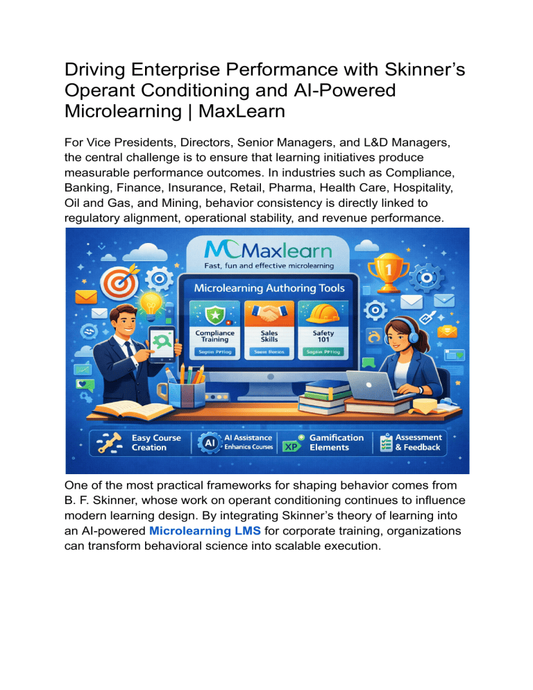 Driving Enterprise Performance with Skinner’s Operant Conditioning and AI-Powered Microlearning | MaxLearn For Vice Presidents, Directors, Senior Managers, and L&D Managers, the central challenge is to ensure that learning initiatives produce measurable performance outcomes. In industries such as Compliance, Banking, Finance, Insurance, Retail, Pharma, Health Care, Hospitality, Oil and Gas, and Mining, behavior consistency is directly linked to regulatory alignment, operational stability, and revenue performance. One of the most practical frameworks for shaping behavior comes from B. F. Skinner, whose work on operant conditioning continues to influence modern learning design. By integrating Skinner’s theory of learning into an AI-powered Microlearning LMS for corporate training, organizations can transform behavioral science into scalable execution. Understanding Operant Conditioning in Corporate Learning Operant conditioning—often referred to as Skinnerian conditioning—explains how consequences influence behavior. According to Skinner’s learning theory: Reinforced behaviors increase in frequency. Behaviors followed by corrective consequences decrease. Immediate feedback strengthens retention. Repetition supports consistent performance habits. Skinner’s experiment demonstrated that reinforcement schedules shape behavioral persistence. Fixed reinforcement encourages predictable results, while variable reinforcement supports sustained engagement. The Learning theory of Skinner highlights that structured reinforcement drives durable behavior change. For L&D leaders, this means training must move beyond information distribution and focus on consequence-driven reinforcement. Why Microlearning Platforms Align with Skinner’s Learning Theories Traditional learning programs often rely on lengthy modules and periodic certifications. However, Learning Theories Skinner advanced emphasize frequent reinforcement and timely feedback. Without these elements, behavior change remains inconsistent. Modern Microlearning Platforms provide the structure necessary to apply Skinner’s operant conditioning effectively. Microlearning Courses are designed as short, focused learning interactions that include: Scenario-based exercises Instant knowledge checks Real-time corrective feedback Continuous reinforcement cycles A microlearning application embeds these cycles into daily workflows, ensuring that reinforcement occurs consistently rather than sporadically. This structure reflects Skinner's Theory of Learning by integrating measurable consequences into every learning interaction. AI-Powered Reinforcement for Corporate Training An AI-powered microlearning LMS for corporate training enhances reinforcement by adapting to learner behavior. One of Skinner’s key insights involved reinforcement scheduling. Modern microlearning LMS systems replicate this through: Fixed Reinforcement Certification acknowledgments Compliance confirmations Skill milestone recognition Variable Reinforcement Gamified achievements Adaptive incentives AI-triggered performance recognition MaxLearn integrates these reinforcement models into its Microlearning Authoring Tools, enabling L&D teams to design targeted learning journeys aligned with enterprise goals. AI-driven analytics identify performance gaps and adjust content delivery accordingly, strengthening reinforcement where needed most. This elevates microlearning software from static content management to behavior-focused performance optimization. Industry Impact Across High-Stakes Sectors Embedding Skinner’s learning theories into modern Microlearning Platforms drives measurable results across industries: Compliance: Continuous reinforcement strengthens regulatory adherence. Sales: Repeated practice improves conversion behaviors. Banking and Finance: Scenario-based reinforcement enhances procedural precision. Insurance: Microlearning Tools reinforce underwriting accuracy. Pharma and Health Care: Ongoing reinforcement supports protocol compliance. Hospitality and Retail: Behavioral repetition enhances customer engagement standards. Oil and Gas or Mining: Safety microlearning courses reinforce hazard prevention practices. Across these sectors, the Learning theory of Skinner provides a structured approach to shaping workforce performance. Conclusion Skinner’s operant conditioning remains a powerful foundation for enterprise learning strategy. When embedded within an AI-powered microlearning LMS for corporate training, reinforcement becomes continuous, adaptive, and measurable. MaxLearn’s Microlearning Platform integrates behavioral science with advanced microlearning tools and analytics, enabling L&D leaders to operationalize Skinnerian conditioning at scale. For organizations seeking consistent compliance, stronger sales outcomes, and improved operational discipline, applying Skinner’s theory of learning through intelligent microlearning platforms offers a strategic path to sustained performance excellence.