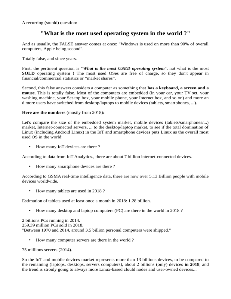 A recurring (stupid) question: "What is the most used operating system in the world ?" And as usually, the FALSE answer comes at once: "Windows is used on more than 90% of overall computers, Apple being second". Totally false, and since years. First, the pertinent question is "What is the most USED operating system", not what is the most SOLD operating system ! The most used OSes are free of charge, so they don't appear in financial/commercial statistics or “market shares”. Second, this false answers considers a computer as something that has a keyboard, a screen and a mouse. This is totally false. Most of the computers are embedded (in your car, your TV set, your washing machine, your Set-top box, your mobile phone, your Internet box, and so on) and more an d more users have switched from desktop/laptops to mobile devices (tablets, smartphones, ...). Here are the numbers (mostly from 2018): Let's compare the size of the embedded system market, mobile devices (tablets/smarphones/...) market, Internet-connected servers, ... to the desktop/laptop market, to see if the total domination of Linux (including Android Linux) in the IoT and smartphone devices puts Linux as the overall most used OS in the world: • How many IoT devices are there ? According to data from IoT Analytics., there are about 7 billion internet-connected devices. • How many smartphone devices are there ? According to GSMA real-time intelligence data, there are now over 5.13 Billion people with mobile devices worldwide. • How many tablets are used in 2018 ? Estimation of tablets used at least once a month in 2018: 1.28 billion. • How many desktop and laptop computers (PC) are there in the world in 2018 ? 2 billions PCs running in 2014. 259.39 million PCs sold in 2018. "Between 1970 and 2014, around 3.5 billion personal computers were shipped." • How many computer servers are there in the world ? 75 millions servers (2014). So the IoT and mobile devices market represents more than 13 billions devices, to be compared to the remaining (laptops, desktops, servers computers), about 2 billions (only) devices in 2018, and the trend is stronly going to always more Linux-based clould nodes and user-owned devices... So the IoT (embedded devices) is widely dominating the amount of running devices, and Linux runs on 72% of it (2018 numbers), and as the second largest market is the mobile devices (smartphones, tablets, ...) and Android (a Linux distribution) runs on 85% of the devices, the result is there: Linux is far the most used operating system in the world. No need to add the 500 most powerful supercomputers (top500.org) or the Internet web servers.