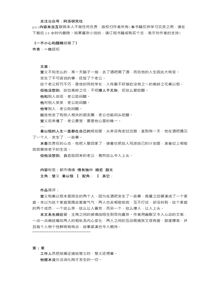 关注公众号:阿洛研究社 ps:内容来自互联网本人不做任何负责,版权归作者所有!本书籍仅供学习交流之用,请在下载后24小时内删除。如果喜欢小说的,请订阅书籍或购买个志,表示对作者的支持! 《一不小心和醋精结婚了》 作者:一枚纽扣 文案: 楚义不知怎么的,某一天脑子一抽,去了酒吧喝了酒,而后他的人生因此大转变。 发生了不可言说的事,还捡了个老公。 这个老公好巧不巧,是他的同校学长,人传最不好接近没有之一的高岭之花秦以恒。 但他没想到,这位高岭之花,不但撩人于无形,还这么爱吃醋。 他和别人说话,老公吃闷醋。 他对别人笑笑,老公吃闷醋。 他夸别人,老公吃闷醋。 就连他发了和别人相关的朋友圈,老公也能闷头吃醋。 楚义后来懂了,老公要宠,要是他心里的唯一。 …… 秦以恒的人生一直都在自己的规划里,从来没有走过岔路,直到有一天,他在酒吧遇见了一个人,发生了,一些事。 本着负责任的心态,他把人娶回家了,接着也把这人写进自己的计划里,准备过上相敬如宾莫挨老子的生活。 但他没想到,自己捡回来的老公,竟然这么令人上头。 内容标签:都市情缘 情有独钟 婚恋 甜文 主角:楚义 秦以恒 ┃ 配角: ┃ 其它: 作品简评: 楚义和秦以恒本是陌生的两个人,因为在酒吧发生了一些事,商量之后硬凑成了一个家庭。本以为这个家庭氛围会客客气气,两人也会相敬如宾,互不打扰,却没料到,这个家庭的两个成员,一个这么乖,这么让人喜欢,而另一个,这么撩人,让人上头。 本文系先婚后爱,主角之间的感情由陌生到双向喜欢。作者用幽默又令人心动的文笔,一点一点阐述婚后两人的相处及内心变化,两人之间的互动既搞笑又很有爱,甜度爆表,并且每个人物个性鲜明有特点,故事紧凑也令人期待。 ========================= 第1章 工作人员把结婚证递给楚义时,楚义还愣着。 他根本没办法消化刚才发生的一切。 也没办法消化他已经是秦以恒合法丈夫的事实。 “楚先生。” 身边的人在提醒他。 很低沉,很有磁性的嗓音,敲在楚义的心坎上,他脑子好像嗡的响了一声。 楚义是立马就回过神来,接过了结婚证。 楚义对工作人员说谢谢,然后转头,把目光投向了秦以恒。 的领带。 “呃呃,那个。” 楚义不敢看秦以恒,甚至因为突然回过神来,又突然感受到了秦以恒的气场,慌到忘了刚刚想说什么。 他只好硬着头皮说话:“我们接下来,该干什么?” 确切说,今天是他们人生的第二次见面。 上一次是一个月前,在酒吧。 楚义因为心情不好,在酒吧里喝了酒。 大概是因为实在是喝太多了,他后面的记忆有点模糊。 反正是遇见了一个很好看的男人。 然后怎么的两个人就到酒店了。 然后怎么的两个人就滚到床上了。 第二天早上醒来,那个男人已经不见了,只留了楚义一身的痕迹,还有满地乱七八糟的东西。 楚义当时是慌的。 虽然他去酒吧确实是有想寻点艳遇的心思,但谁会想到啊这个愿望竟然还就真的实现了。 他的第一次就这么糊里糊涂地给了。 对方还是个他想不起脸的男人。 他昨天到底在干什么? 就这么的,他在酒店的大床上坐了整整一个小时。 狠狠地在心里自说自话了一个小时,才把自己安慰好。 多大点事。 他都26岁了,第一次没了就没了。 有什么关系。 虽然想不起对方的脸,但是在他印象里,那个男的是个超级大帅哥。 而且…… 他昨天,似乎,好像,非常,舒服。 小事小事。 他本来就是来酒吧买醉买男人的,这不心想事成了。 okok。 楚义还要上班,想完这些火速收拾了一下自己,也离开了酒店。 那个男人把房钱付了,也把房间里需要付费的一些小东西都付了。 在前台站了一会儿,前台小姐通知阿姨检查房间,几分钟后告诉楚义可以离开。 楚义说:“谢谢。” 他说完本想转身就走。 但他还是问:“你好,方便告诉我和我一起住的这位先生叫什么名字吗?” 楚义记得,前台当时非常惊讶的目光。 但很快,不到一秒吧,前台的目光就收敛了,大概是也明白了什么。 “这位先生叫……” 楚义突然打断:“不用了,谢谢。” 露水情缘而已,别人都不在意,他在意什么。 但他万万没想到,他的露水情缘,一个月后出现在了他的工作室。 楚义是个设计师。 大学毕业之后就自己开了个工作室,现在招有两个小员工。 小本经营,给别人设计海报,设计封面,设计排版,设计logo,这些那些。 他的工作室在市不太中心的一条街上。 也就是今天。 早上十点,他这个老板例行迟到,才刚到工作室,门口便停下了一辆车。 楚义手里拿着一块面包,因为这个车停得实在过于巧妙了,正正停在他的店门口,所以楚义脑子当下就把他处理成自己的客人。 面包也不吃了,包好塞在手边桌子的角落里,抽了张纸擦擦手,把玻璃门打开,准备迎接客人。 但这位客人却没有立马下车,而是等他的司机先下了车,绕到后座,开了门,把手垫在门框上,他再逼逼格格地伸出一条腿,露出脚踝和皮鞋来。 这是什么偶像剧? 楚义还没来得及咽下的面包差点卡在喉咙里。 然后这位男主的脸就出现在了楚义的视线里。 他第一感觉是,哇,果然是男主,真他妈帅。 第二感觉是,妈呀,有大单子! 男人很快下车,很快走到楚义面前,对他点头一笑:“楚先生,你好。” 楚义露出了对客人的标准笑容:“先生您好。” 楚义先伸出了右手,但这位男人似乎没有要和他握手的意思,皱了皱眉,目光往下瞥了瞥,还没瞥到楚义的手呢,就把视线收了回来。 楚