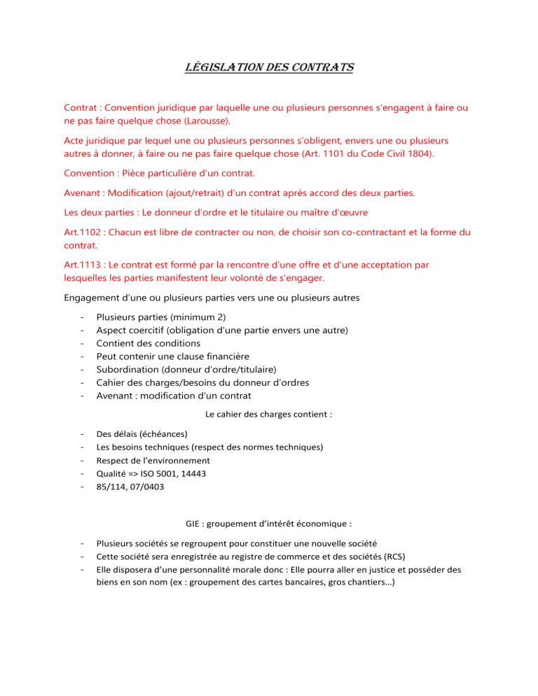 Législation des contrats Contrat : Convention juridique par laquelle une ou plusieurs personnes s’engagent à faire ou ne pas faire quelque chose (Larousse). Acte juridique par lequel une ou plusieurs personnes s’obligent, envers une ou plusieurs autres à donner, à faire ou ne pas faire quelque chose (Art. 1101 du Code Civil 1804). Convention : Pièce particulière d’un contrat. Avenant : Modification (ajout/retrait) d’un contrat après accord des deux parties. Les deux parties : Le donneur d’ordre et le titulaire ou maître d’œuvre Art.1102 : Chacun est libre de contracter ou non, de choisir son co-contractant et la forme du contrat. Art.1113 : Le contrat est formé par la rencontre d’une offre et d’une acceptation par lesquelles les parties manifestent leur volonté de s’engager. Engagement d’une ou plusieurs parties vers une ou plusieurs autres - Plusieurs parties (minimum 2) Aspect coercitif (obligation d’une partie envers une autre) Contient des conditions Peut contenir une clause financière Subordination (donneur d’ordre/titulaire) Cahier des charges/besoins du donneur d’ordres Avenant : modification d’un contrat Le cahier des charges contient : - Des délais (échéances) Les besoins techniques (respect des normes techniques) Respect de l’environnement Qualité => ISO 5001, 14443 85/114, 07/0403 GIE : groupement d’intérêt économique : - Plusieurs sociétés se regroupent pour constituer une nouvelle société Cette société sera enregistrée au registre de commerce et des sociétés (RCS) Elle disposera d’une personnalité morale donc : Elle pourra aller en justice et posséder des biens en son nom (ex : groupement des cartes bancaires, gros chantiers…) GME : groupement momentané d’entreprise, durée limitée à un seul contrat (ex : RGV BGY 2/modifications PNPP063S…) 85-114(IND.17) : pour travailler avec un GME, il faut : - Une convention précisant le rôle de chacun et les missions mandataires 15 jours avant le début des travaux Le système qualité applicable (mandataire ? autre société ?) Les dispositions de solidarité pour garantir l’achèvement des travaux en cas de défaillance d’une entreprise du GME Certification UTO exigée pour les entreprises dans le domaine (et le sous domaine) dans lequel elles interviennent. Solidarité => nécessaire pour achever les travaux en cas de défaillance d’une des entreprises du GME. Plusieurs cas : - GME avec solidarité du mandataire => Le mandataire doit réaliser les travaux à la place de l’entreprise défaillante GME-S (solidaire) : Les entreprises constituant le GME réalisent les travaux à la place de l’entreprise défaillante GME-C (conjoint) sans solidarité du mandataire : Le mandataire va trouver une nouvelle entreprise pour achever les travaux Rôle du mandataire Il est chargé de : Représenter les GME auprès du maître d’ouvrage Remettre les offres Signer le marché Coordonner les prestations Assurer la gestion administrative et financière Rémunéré d’un accord commun entre les membres du GME en fonction des missions confiées. Responsabilités du mandataire - Strictement limitées à ce qui est indiqué dans la convention du GME Si la convention prévoit la solidarité du mandataire commun, il doit réaliser le lot confié à une des entreprises du groupement si celle-ci est défaillante Sécurité et réglementation 2 cas de figure : - Chantier en interférence avec d’autres chantiers, cadre règlementaire : Décret de février 1992 Chantiers isolés et clos, cadre réglementaire : Décret de 1996 Inexécution du contrat Art. 1218 : Force majeure => Evènement 1. Echappant au contrôle du débiteur 2. Qui ne pouvait être prévu 3. Dont les effets ne peuvent être évités Modification d’un contrat - Evènement : vol de câbles – irrésistible => oui Echappera à la volonté des parties => oui => force majeure, non Imprévisible ? => non Dans le cas de l’installation d’un nouveau matériel, le fabricant à l’obligation de vous fournir : - Les accessoires Sa documentation GEE (guide d’exploitation et d’entretien) Contrat de sous-traitance Déléguer un travail à une autre entreprise du fait de : - Intérêt financiers : / ! \ l’exploitant d’une INB ne peut pas tout sous-traiter (conduite/contrôle des installations combustible/surveillance sur les AIP) Absence de compétences techniques Manque de ressource Avantages et inconvénients : - Donneur d’ordre Permet de réaliser des tâches plus nombreuses (plus de ressources) Disposer de compétences reconnues Permet de passer des pics (AT) Risque de perdre les compétences Risque de dépendance d’un même sous-traitant au point de vue technique et financier (tarifs élevés) Coûteux/à arbitrer % réalisation en interne Besoin de surveillance - Sous-traitant Commandes à honorer Garantie de revenus Volume d’activités à réaliser (dimensionnement) Risque d’être payé avec retard (voir pas du tout) par le titulaire Risque de trop dépendre d’un même donneur d’ordre => Besoin de diversification Loi du 31 décembre 1975 relative à la sous-traitance, elle permet le paiement direct des soustraitants de premier rang par le donneur d’ordre. Donneur d’ordre Titulaire Sous-traitants 1 Sous-traitants 2 Sous-traitants 3 Les soustraitants peuvent demander à être payés directement par le donneur d’ordre pour les commandes publiques d’un montant minimal de 600€. A condition que les sous-traitants de rang 1 soient déclarés par le titulaire et acceptés par le donneur d’ordre. Commande EDF c’est une commande publique, EDF peut refuser ou imposer un sous-traitant (un sous-traitant doit être certifié UTO) Interdiction de délit de marchandage C’est l’encadrement du personnel des sous-traitants sans passer par le titulaire. Sanction : deux ans de prison, amende, interdiction d’exercer une fonction d’encadrement Evaluation de la prestation : - Faire une FEP 