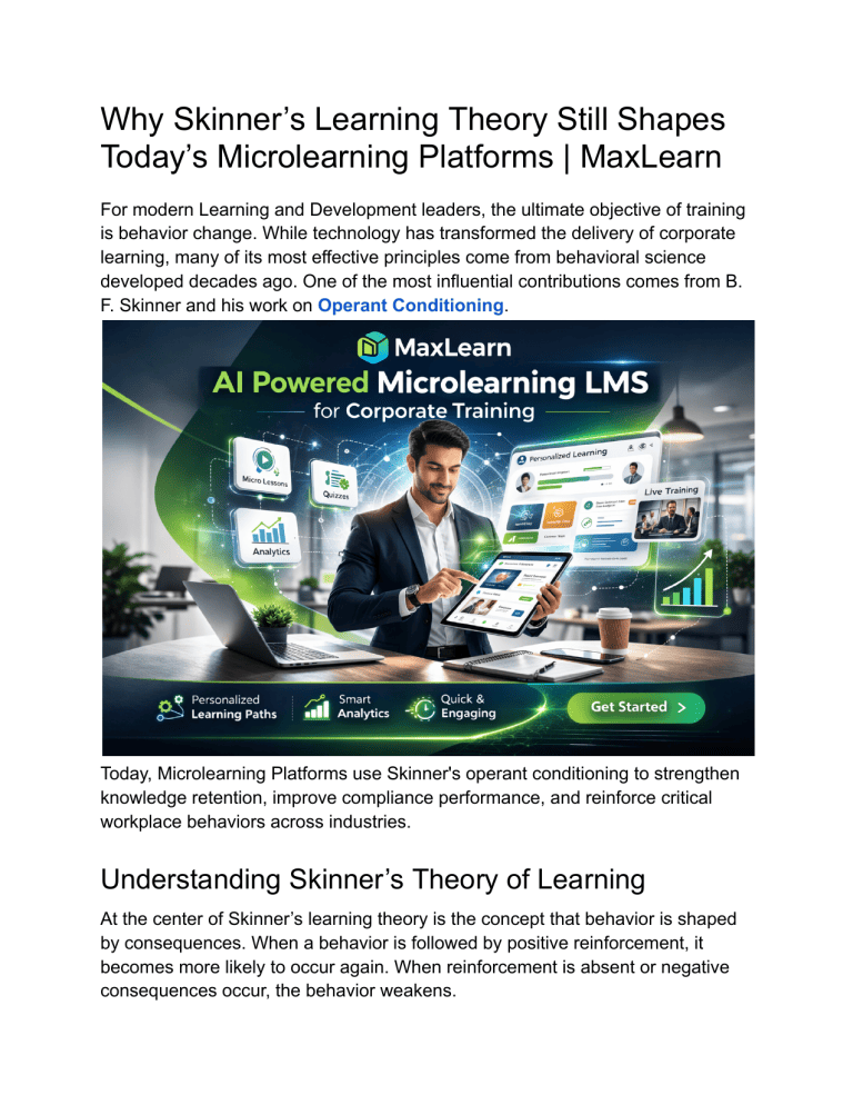 Why Skinner’s Learning Theory Still Shapes Today’s Microlearning Platforms | MaxLearn For modern Learning and Development leaders, the ultimate objective of training is behavior change. While technology has transformed the delivery of corporate learning, many of its most effective principles come from behavioral science developed decades ago. One of the most influential contributions comes from B. F. Skinner and his work on Operant Conditioning. Today, Microlearning Platforms use Skinner's operant conditioning to strengthen knowledge retention, improve compliance performance, and reinforce critical workplace behaviors across industries. Understanding Skinner’s Theory of Learning At the center of Skinner’s learning theory is the concept that behavior is shaped by consequences. When a behavior is followed by positive reinforcement, it becomes more likely to occur again. When reinforcement is absent or negative consequences occur, the behavior weakens. Through Skinner’s experiment, controlled environments demonstrated how reinforcement schedules guide consistent responses over time. These insights laid the foundation for Skinnerian Conditioning, which continues to influence modern learning design. For L&D leaders in Banking, Finance, Insurance, Retail, Pharma, Health care, Hospitality, Oil and Gas, and Mining, The theory of Skinner in learning remains highly relevant. These industries rely on employees consistently performing the right actions—whether following compliance regulations, delivering customer service standards, or executing safety procedures. Why Traditional Training Approaches Struggle Many organizations still rely on long, periodic training programs. While these programs introduce important information, they rarely align with Skinner's theory of learning, which emphasizes continuous reinforcement. Without frequent practice and immediate feedback, knowledge fades quickly. This creates risk in compliance-driven industries and limits performance improvement in sales and customer-facing roles. Understanding learning theories Skinner proposed highlights the importance of short learning cycles combined with repeated reinforcement. How Microlearning Platforms Apply Skinner’s Principles A modern Microlearning Platform is built around reinforcement-based learning. Instead of long sessions, Microlearning Courses deliver focused learning moments that strengthen specific knowledge areas or skills. This structure reflects Skinner's theories by incorporating: Immediate feedback following learning activities Repetition that strengthens knowledge retention Incremental skill progression Frequent engagement with learning content Using a dedicated microlearning application, organizations can deliver consistent reinforcement within employees’ daily workflows. The Role of AI-Powered Microlearning LMS for Corporate Training An AI-powered microlearning LMS for corporate training strengthens the application of Skinner's Operant Conditioning by adapting reinforcement schedules to each learner. Advanced microlearning software analyzes performance data and engagement patterns to determine when additional reinforcement is needed. For example: Banking and Insurance organizations can reinforce compliance knowledge through targeted refreshers. Retail and Hospitality sales teams can revisit product knowledge through short Microlearning Courses. Safety protocols in Oil and Gas or Mining environments can be reinforced through scenario-based learning. A sophisticated Microlearning LMS ensures that reinforcement occurs consistently across large workforces. Supporting L&D Leaders with Microlearning Tools To implement reinforcement-driven learning effectively, organizations need powerful microlearning tools and flexible microlearning authoring tools. These tools allow L&D teams to create targeted learning assets quickly while maintaining alignment with business objectives. By combining data insights with scalable microlearning software, leaders gain visibility into learner progress, skill development, and knowledge gaps. How MaxLearn Brings Skinner’s Learning Theories to Enterprise Training MaxLearn integrates Skinner's learning theories with advanced digital learning technology. Its intelligent Microlearning Platforms support continuous reinforcement through adaptive learning experiences, AI-driven insights, and performance analytics. By aligning modern learning systems with Learning theory of Skinner, MaxLearn helps organizations strengthen workforce capability across compliance, sales, and operational functions. For enterprise L&D leaders, applying Skinner's theory of learning through a data-driven microlearning ecosystem ensures that training does more than deliver information—it supports consistent, high-quality performance across the organization.