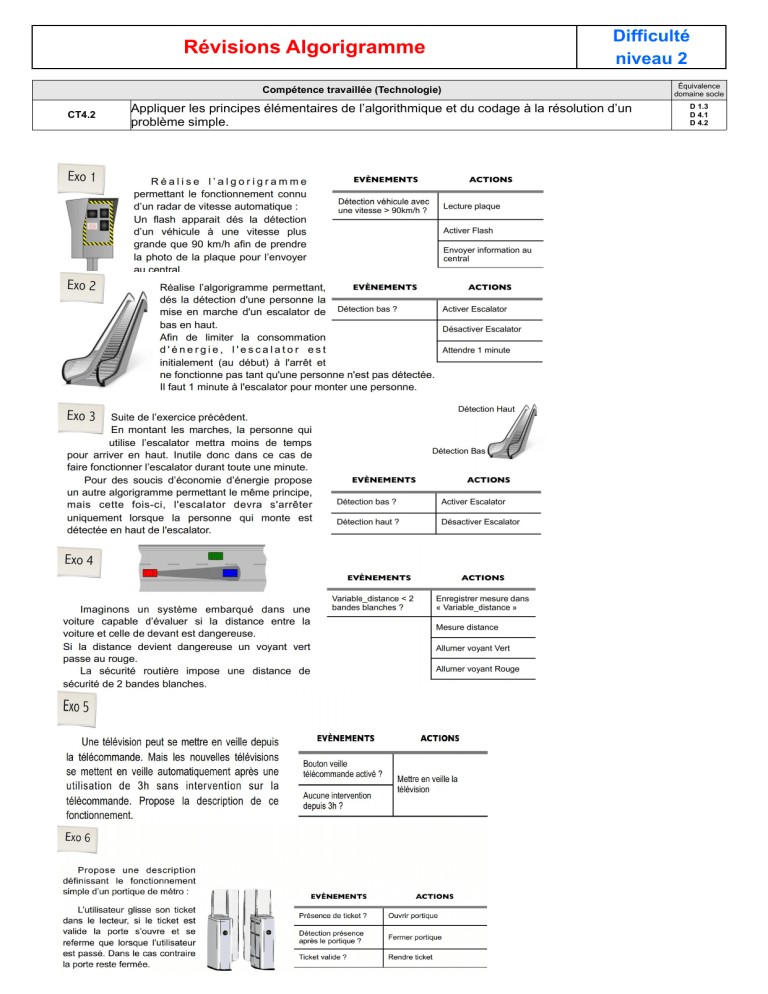 Révisions Algorigramme Difficulté niveau 2 Compétence travaillée (Technologie) CT4.2 Appliquer les principes élémentaires de l’algorithmique et du codage à la résolution d’un problème simple. Équivalence domaine socle D 1.3 D 4.1 D 4.2