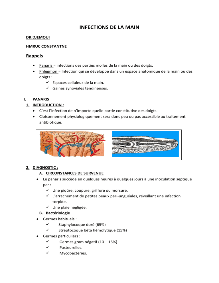 INFECTIONS DE LA MAIN DR.DJEMOUI HMRUC CONSTANTNE Rappels Panaris = infections des parties molles de la main ou des doigts. Phlegmon = Infection qui se développe dans un espace anatomique de la main ou des doigts : Espaces celluleux de la main. Gaines synoviales tendineuses. I. PANARIS 1. INTRODUCTION : C’est l’infection de n’importe quelle partie constitutive des doigts. Cloisonnement physiologiquement sera donc peu ou pas accessible au traitement antibiotique. 2. DIAGNOSTIC : A. CIRCONSTANCES DE SURVENUE Le panaris succède en quelques heures à quelques jours à une inoculation septique par : Une piqûre, coupure, griffure ou morsure. L'arrachement de petites peaux péri-unguéales, réveillant une infection torpide. Une plaie négligée. B. Bactériologie Germes habituels : Staphylocoque doré (65%) Streptocoque bêta hémolytique (15%) Germes particuliers : Germes gram négatif (10 – 15%) Pasteurelles. Mycobactéries. C. EVOLUTION a) Stade d’inoculation Souvent méconnu. Douleur rapidement calmée. b) A la phase de début (catarrhale) Signes inflammatoires locaux (rougeur, chaleur, œdème) sans fièvre. Douleur spontanée, mais pas de douleur la nuit. → Stade réversible (spontanément ou par le traitement), mais en quelques heures on peut passer / stade suivant. c) A la phase d'état (collectée) Inflammation + marquée, collection de pus palpable (fluctuation). Douleur intense, pulsatile, insomniante ++ Signes régionaux : gg en amont (épitrochléen + axillaire), lymphangite. Signes généraux : fièvre à 38°c, rare ù GB. →Stade irréversible de manière spontanée. Chirurgie indispensable pour évacuer la collection. Sinon passage au stade suivant. d) Stade des complications (diffusion): L’infection se propage aux tissus de voisinage : À la peau : fistulisation À l’os (ostéite) = RX Aux articulations (arthrite) = douleur articulaire spontanée et à la mobilisation + RX Aux tendons et gaine phlegmon, nécrose tendon / infection = déficit moteur. D. EVOLUTION SOUS TRAITEMENT a) A la phase catarrhale : Récupération ad integrum en 24 à 48 heures. b) Après l'excision, si vu au stade collecté, La récupération ad integrum se fait après cicatrisation dirigée au prix d'une petite cicatrice stellaire sans conséquence fonctionnelle. E. EVOLUTION SANS TRAITEMENT La collection va s'éliminer d'elle-même : Soit en se fistulisant vers l'extérieur comme le ferait un abcès Soit diffuser en profondeur risquant alors d'infecter : la pulpe de voisinage (extension), la phalange sous-jacente (ostéite) et/ou gagner l'articulation inter phalangienne la plus proche (arthrite ou ostéo-arthrite). F. EVOLUTION MAL TRAITE MEME EVOLUTION QUE DANS LE CAS PRECEDENT : Diffusion en profondeur = phlegmon des gaines. Fistulisation. Ostéite. Arthrite. Panaris index + phlegmon gaine 3. FORMES CLINIQUES : Diffusion Fistulisation et ostéite A. FORMES CLINIQUES SELON LE SITE Les panaris pulpaires , latéro , péri ou sous unguéaux. La classique forme dite en "bouton de chemise". La méconnaissance de cette dernière peut être source d'excision insuffisante et conduire à l'évolution vers une ostéite de la phalange distale. B. FORMES CLINIQUES SELON LE TERRAIN On se méfiera des panaris chez les sujets débilités et les sujets à risques majeurs de diffusion septique (valvulopathes, immunodéprimés etc.) C. FORMES CLINIQUES SELON LE GERME Le staphylocoque auréus est de loin le plus souvent en cause (80% des cas) viennent ensuite les streptocoques D et A (10%) puis le Protéus le Pasteurelles etc. Le panaris dit chronique, récidivant peut être la complication d'une excision insuffisante, d'une cause entretenue ou s'intriquer avec une mycose périunguéale. 4. Examens complémentaires (facultatifs) : A. Biologique : NFS (hyperleucocytose, hyperpolynucléose) Glycémie (bilan diabète) B. Bactériologique : Prélèvement du pus C. Radiologique : Recherche de corps étranger Signes d’ostéite ou arthrite 5. TRAITEMENT : Il est médico-chirurgical. URGENCE +++ A. Stade d’invasion Bains antiseptiques (Hexomedine transcutanée, 20mn x 6/jour) Antibiothérapie si terrain fragilisé Surveillance : clinique … et régulière (but = éviter la chirurgie) B. Stade de collection Chirurgical : excision de tous les tissus nécrosés ou purulents Anesthésie loco-régionale (à distance du foyer infectieux) Antibiotiques si prélèvement bactériologiques … et pour 8 jours Antibiothérapie systématique si : Signes de diffusion Morsures animales (penicolline, tétracyclines) Nourrisson (risque de staphylococcie pleuro-pulmonaire) Valvulopathes ou porteurs de prothèses (risques d’endocardite …) Immunodéprimés C. Quatre principes : Excision de la porte d’entrée Pas d’antibiotiques à l’aveugle Un trou propre vaut mieux qu’un couvercle sale Toute règle a ses exceptions II. PHLEGMON DES GAINES 1. ANATOMIE : 2. DEFINITION : Infection aiguë des gaines synoviales digitales du deuxième, troisième et quatrième doigt et des gaines digito-carpiennes du pouce et du cinquième doigt. 3. ETIOLOGIE : Secondaires à une piqûre septique ou à un panaris non ou mal traité. Staphylocoque doré, suivi en deuxième position par le streptocoque. Le terrain affaibli joue un rôle important dans la survenue de l’infection 4. ANAT-PATH : A. Stade I (40%) ou stade de ténosynovite inflammatoire : la gaine est inflammatoire, hyperhémiée contenant un liquide plus ou moins louche. Le tendon reste sain. B. Stade II (35%) ou stade de ténosynovite suppurée : La gaine contient du pus franc Mais le tendon est épargné. C. Stade III (25%) ou stade de ténosynovite diffusée : C’est la nécrose infectieuse du tendon. La fistulisation à la peau et l’extension ostéo-articulaire s’observent à ce stade. 5. DIAGNOSTIC : A. PHASE DE DEBUT Doigt de coloration normale, non inflammatoire, en légère flexion antalgique, réductible. La mise en évidence d’une douleur à la palpat
