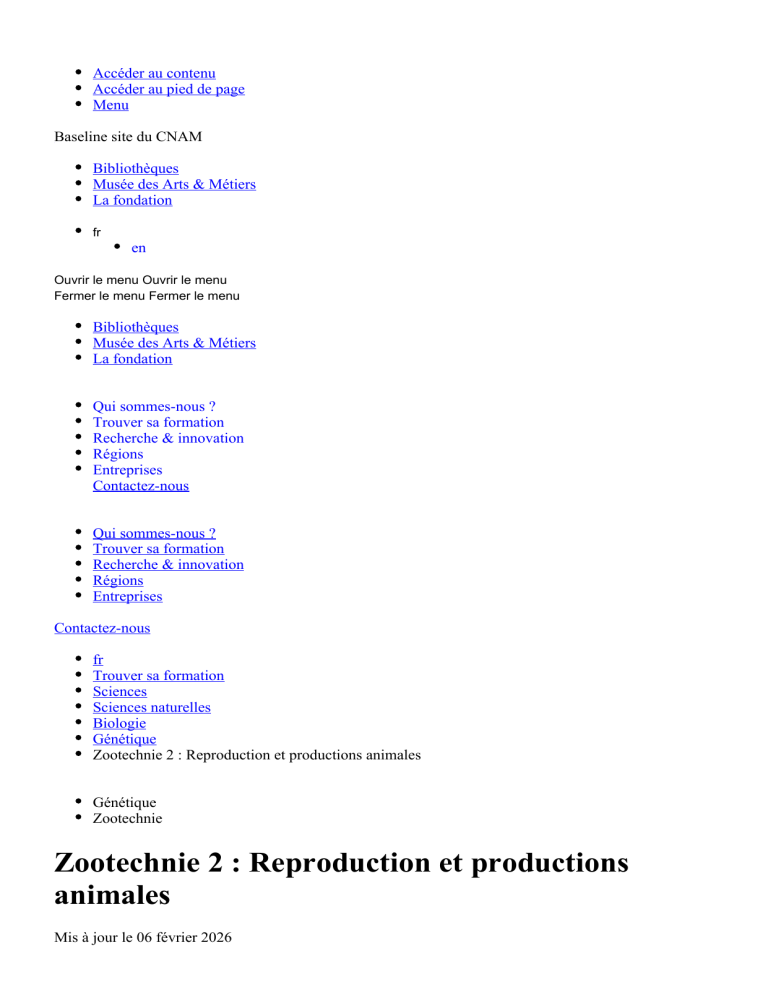 Accéder au contenu Accéder au pied de page Menu Baseline site du CNAM Bibliothèques Musée des Arts & Métiers La fondation fr en Ouvrir le menu Ouvrir le menu Fermer le menu Fermer le menu Bibliothèques Musée des Arts & Métiers La fondation Qui sommes-nous ? Trouver sa formation Recherche & innovation Régions Entreprises Contactez-nous Qui sommes-nous ? Trouver sa formation Recherche & innovation Régions Entreprises Contactez-nous fr Trouver sa formation Sciences Sciences naturelles Biologie Génétique Zootechnie 2 : Reproduction et productions animales Génétique Zootechnie Zootechnie 2 : Reproduction et productions animales Mis à jour le 06 février 2026 Responsable(s) : Mme Rebeca GARCIA, Mme Marion POMMET Cours Code Cnam : BLG118 Téléchargez le pdf Téléchargez le pdf Envie d'en savoir plus sur cette formation ? Afin d’obtenir les tarifs, le calendrier de la formation, en distanciel, en présentiel, le lieu de la formation et un contact, remplissez les critères suivants : Modalité d'apprentissage Modalité d'apprentissage Présentiel Rythme de session Rythme de session A la carte Lieu(x) Lieu(x) Pointe-à-Pitre Session de rentrée Session de rentrée Annuel Afficher mes résultats Afficher le centre adapté à mes besoins Afin d’obtenir les tarifs, le calendrier de la formation et le lieu de la formation, remplissez les critères suivants : Filtrer Tout effacer Lieu(x) Modalité d'apprentissage Rythme de session Session de rentrée Trier par Afficher les résultats Trier par Le plus récent d'abord Le plus ancien d'abord Par ordre alphabétique (A - Z) Par ordre alphabétique (Z - A) Date d'événement Afficher les résultats Lieu(x) Pointe-à-Pitre (1) Afficher les résultats Modalité d'apprentissage Présentiel (1) Afficher les résultats Rythme de session A la carte (1) Afficher les résultats Session de rentrée Annuel (1) Afficher les résultats Résultats 1 à 4 sur 11, page 1 sur 3 Filtres Lieu(x) Lieu(x) Pointe-à-Pitre (1) Modalité d'apprentissage Modalité d'apprentissage Présentiel (1) Rythme de session Rythme de session A la carte (1) Session de rentrée Session de rentrée Annuel (1) Raffraichir mes résultats Résultats 1 à 4 sur 11, page 1 sur 3 Accéder aux résultats Modifier le tri des résultats Trier par Trier par Le plus récent d'abord Le plus ancien d'abord Par ordre alphabétique (A - Z) Par ordre alphabétique (Z A) Date d'événement Génétique Environnement aménagement Phytotechnie 2 : Enjeux, concepts et outils pour le raisonnement de la conduite des cultures Cours, BLG116 6 crédits Présentiel A la carte 2025/26 Lieu Pointe-à-Pitre Voir la formation Mis à jour le 6 février 2026 Voir la formation Génétique Environnement aménagement Phytotechnie 1 : Bases scientifiques pour l'étude des plantes et des peuplements végétaux Cours, BLG115 6 crédits Présentiel A la carte 2025/26 Lieu Pointe-à-Pitre Voir la formation Mis à jour le 6 février 2026 Voir la formation Génétique Ergonomie Ingénierie formation Adaptation sociale Handicap : concepts fondamentaux et panorama sur les déficiences Cours, HTS101 4 crédits Présentiel Distanciel A la carte 2025/26 2026/27 2027/28 Lieu Cnam Entreprises Paris, Paris Voir la formation Mis à jour le 6 février 2026 Voir la formation Bio-informatique Génétique Entrée Sans niveau spécifique Certificat de spécialisation Bio-informatique avancée Certificat de spécialisation, CS8800A 27 crédits A la carte 2025/26 Lieu Centre Cnam Paris Voir la formation Mis à jour le 6 février 2026 Voir la formation 50 heures Durée : 50 heures A la carte En journée 6 crédits Présentiel Présentation Public, conditions d'accès et prérequis Prérequis Bac + 2 dans le domaine des sciences du vivant. Anglais lu recommandé. Objectifs Faire acquérir les bases scientifiques de la biologie des animaux domestiques en s'appuyant principalement sur l'étude de leur nutrition, de leur reproduction, et de leur génétique ; ces fonctions seront illustrées par des applications zootechniques. L'avis des auditeurs Les dernières réponses à l'enquête d'appréciation pour cet enseignement : Fiche synthétique au format PDF Compétences et débouchés Parcours Certificat de compétence Productions agricoles et technologies agro-alimentaires Informations pratiques Contact Département : Département : EPN07 - IAA Tel : Tel : 01 40 27 21 67 Email : Email : [email protected] Adresse : Adresse : 292 rue Saint Martin - 75003 Paris Retrouvez cette formation en centre : Lieux de formation Guadeloupe Programme Contenu Reproduction et productions animales Reproduction Conditions requises pour réussir la fécondation (réduction des digynies et polyspermie, insémination au "bon moment", intérêt de la détection des chaleurs). Ponte du maximum d'ovocytes chez les femelles de grande valeur génétique (folliculogénèse et superovulation). Détection précoce des femelles gravides (croissance et destruction des corps jaunes ; recherche des sécrétions lutéales et embryonnaires). Réduction des périodes infertiles : avancement de l'âge à la première mise à bas ; diminution des anoestrus (saisonniers et post-partum) ; méthode de synchronisation des chaleurs. Sexage, clonage, congélation et transfert d'embryons. Maîtrise de la parturition. Génétique Principes de base de l'amélioration génétique. Sélection sur valeur génétique additive. Pondération économique. Effet du milieu. Applications. Constructions des schémas de sélection. Hétérosis. Utilisation du croisement. Illustrations zootechniques Production laitière chez les ruminants, production de viande bovine, production porcine, production avicole, autres élevages (ovin, caprins, équin, cunicole, etc... ) Ces formations pourraient vous intéresser Génétique Environnement aménagement Phytotechnie 2 : Enjeux, concepts et outils pour le raisonnement de la conduite des cultures Cours, BLG116 6 crédits Présentiel A la carte 2025/26 Li