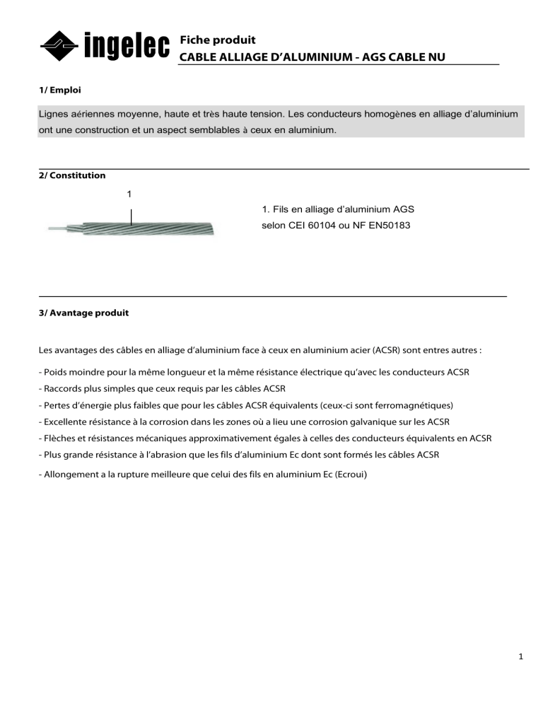 Fiche produit CABLE ALLIAGE D’ALUMINIUM - AGS CABLE NU 1/ Emploi Lignes aériennes moyenne, haute et très haute tension. Les conducteurs homogènes en alliage d’aluminium ont une construction et un aspect semblables à ceux en aluminium. 2/ Constitution 1 1. Fils en alliage d’aluminium AGS selon CEI 60104 ou NF EN50183 1 3/ Avantage produit Les avantages des câbles en alliage d’aluminium face à ceux en aluminium acier (ACSR) sont entres autres : - Poids moindre pour la même longueur et la même résistance électrique qu’avec les conducteurs ACSR - Raccords plus simples que ceux requis par les câbles ACSR - Pertes d’énergie plus faibles que pour les câbles ACSR équivalents (ceux-ci sont ferromagnétiques) - Excellente résistance à la corrosion dans les zones où a lieu une corrosion galvanique sur les ACSR - Flèches et résistances mécaniques approximativement égales à celles des conducteurs équivalents en ACSR - Plus grande résistance à l’abrasion que les fils d’aluminium Ec dont sont formés les câbles ACSR - Allongement a la rupture meilleure que celui des fils en aluminium Ec (Ecroui) 1 Fiche produit CABLE ALLIAGE D’ALUMINIUM - AGS CABLE NU 3/Références Référence Section (mm2) Compositio n Nb fils Composition Ø nominal des fils (mm Diamètre extérieur nominal du câble (mm) Charge de rupture assignée (daN) Masse approximative du câble (Kg/Km) Sans graisse Masse approximative du câble Avec graisse (1) (Kg/Km) Résistance électrique Maxi 20°C (Ω/Km) Intensité (A) (2) Module d’élasticité 103 Mpa Conditionnement standard T : Touret (m) AGS 22 22 7 2.0 6.00 715 60.2 4 1.50 115 62 T 7000 AGS 34.4 34.4 7 2.50 7.50 1115 94 6 0.958 145 62 T 5000 AGS 54.6 54.6 7 3.15 9.45 1775 149 8 0.603 190 62 T 6500 AGS 75.5 75.5 19 2.25 11.25 2455 208 5 0.438 240 62 T 6500 AGS 93.3 93.27 19 2.50 12.50 3031 252 6 0.354 270 60 T 5000 AGS 117 117 19 2.80 14.00 3800 322 7 0.283 315 60 T 4000 AGS 148 148 19 3.15 15.75 4810 407 8 0.224 365 60 T 3000 AGS 181.6 181.6 37 2.50 17.50 5900 500 17 0.183 415 57 T 2500 AGS 228 228 37 2.80 19.60 7405 627 21 0.146 480 57 T 2000 AGS 288 288 37 3.15 22.05 9370 794 25 0.115 550 57 T 1500 AGS 366 366 37 3.55 24.85 11535 1009 31 0.0905 630 57 T 2500 AGS 570 570 61 3.45 31.05 18530 1574 57 0.0583 840 54 T 1500 Pour des sections ne figurant pas dans ce tableau, nous consulter (1) Les conducteurs a 7 fils sont prévus avec graissage de la couche extérieure, les autres ne le sont que sur demande seulement. (2) L’intensité admissible en régime permanent pour un échauffement de 25°C au-dessus de la température ambiante de 30°C. Emballage : Touret (Douvage sur demande) Tolérance sur la masse du cable : + /- 2%. Unité de vente : Kg Sens de câblage de la couche extérieure est à gauche : S Les données du catalogue sont à titre indicatif et non contractuel Mise à jour : 03/08/2013 2