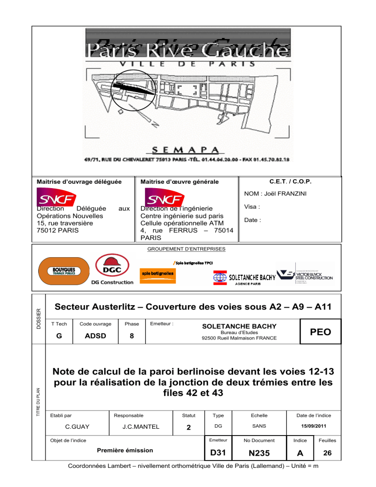 Maitrise d’ouvrage déléguée C.E.T. / C.O.P. Maitrise d’œuvre générale NOM : Joël FRANZINI Direction Déléguée Opérations Nouvelles 15, rue traversière 75012 PARIS aux Direction de l’ingénierie Centre ingénierie sud paris Cellule opérationnelle ATM 4, rue FERRUS – 75014 PARIS Visa : Date : TITRE DU PLAN DOSSIER GROUPEMENT D’ENTREPRISES Secteur Austerlitz – Couverture des voies sous A2 – A9 – A11 T Tech Code ouvrage Phase G ADSD 8 Emetteur : SOLETANCHE BACHY PEO Bureau d’Etudes 92500 Rueil Malmaison FRANCE Note de calcul de la paroi berlinoise devant les voies 12-13 pour la réalisation de la jonction de deux trémies entre les files 42 et 43 Etabli par C.GUAY Responsable J.C.MANTEL Objet de l’indice Première émission Statut Type Echelle Date de l’indice 2 DG SANS 15/09/2011 Emetteur No Document Indice Feuilles D31 N235 A 26 Coordonnées Lambert – nivellement orthométrique Ville de Paris (Lallemand) – Unité = m Paris 13 dalle Austerlitz îlots A2-A9-A11 n° : N235 3979 Note de calcul de la paroi berlinoise devant les voies 12-13 pour la réalisation de la jonction de deux trémies entre les files 42 et 43 révision : A Date : 30/09/11 Page : 2 / 26 Modification suivant Visa SNCF reçu le 29/09/11 C. GUAY J-C. Mantel J-C. Mantel 2 30/09/2011 A Première émission C. GUAY J-C. Mantel J-C. Mantel 2 15/09/2011 0 MODIFICATIONS : Rédaction Vérification Approbation Statut Date Ind. DOCUMENTS DE REFERENCE EMETTEUR DOSSIER D31 - Soletanche Bachy G ADSD 8 N° Ind. TITRE N851 B Note d’hypothèses Générales Fondations Profondes DGC construction Reçu par mail le 09/09/2011 11:33 F EG-AtmSt13-préfaisabilité-001.F.dwg DGC construction Reçu par mail le 09/09/2011 11:33 F galerie technique.vue regard.dwg en plan.001.F.levé Paris 13 dalle Austerlitz îlots A2-A9-A11 n° : N235 3979 Note de calcul de la paroi berlinoise devant les voies 12-13 pour la réalisation de la jonction de deux trémies entre les files 42 et 43 révision : A Date : 30/09/11 Page : 3 / 26 SUIVI DES REVISIONS Légende : page 1 2 2 3 3 4 4 5 5 6 6 7 7 8 8 9 9 10 10 11 11 12 12 13 13 14 14 15 15 16 16 17 17 18 18 19 19 20 20 21 21 22 22 23 23 24 24 25 25 1 X = page modifiée. 0 x x x x x x x x x x x x x x x x x x x x x x x x A B C D + = page ajoutée. - = page enlevée. E 0 page A B C D E page 51 101 52 102 53 103 54 104 55 105 56 106 57 107 58 108 59 109 60 110 61 111 62 112 63 113 64 114 65 115 66 116 67 117 68 118 69 119 70 120 71 121 72 122 73 123 74 124 75 125 26 76 126 27 77 127 28 78 128 29 79 129 30 80 130 31 81 131 32 82 132 33 83 133 34 84 134 35 85 135 36 86 136 37 87 137 38 88 138 39 89 139 40 90 140 41 91 141 42 92 142 43 93 143 44 94 144 45 95 145 46 96 146 47 97 147 48 98 148 49 99 149 50 100 150 x x x x x x x x x x x x + 0 A B C D E Paris 13 dalle Austerlitz îlots A2-A9-A11 n° : N235 3979 révision : A Note de calcul de la paroi berlinoise devant les voies 12-13 pour la réalisation de la jonction de deux trémies entre les files 42 et 43 Date : 30/09/11 Page : 4 / 26 SOMMAIRE 1. INTRODUCTION ..........................................................................................................................................................5 2. NATURE DES TRAVAUX............................................................................................................................................5 3. COUPE DE CALCULS..................................................................................................................................................5 3.1. 3.2. 3.3. 3.4. 3.5. 3.6. 3.7. ZONE DES COUPES .........................................................................................................................................................5 STRATIGRAPHIE .............................................................................................................................................................5 CHOIX DU FOND DE FOUILLE ..........................................................................................................................................5 PHASAGE .......................................................................................................................................................................6 VUE EN ELEVATION DES COUPES ...................................................................................................................................6 COUPE 1 : FOND DE FOUILLE HAUT ................................................................................................................................7 COUPE 2 : FOND DE FOUILLE BAS ..................................................................................................................................7 4. HYPOTHESES DE CALCUL.......................................................................................................................................8 4.1. HYPOTHESES GEOTECHNIQUES .....................................................................................................................................8 4.2. METHODE DE CALCUL ...................................................................................................................................................8 4.3. HYPOTHESES COMPLEMENTAIRES .................................................................................................................................9 4.3.1. Critère de dimensionnement .................................................................................................................................9 4.3.2. Prise en compte des voies .....................................................................................................................................9 4.3.3. Cœfficient berlinoise ...........................................................................................................................................10 4.3.4. Hypothèses de calcul du choix des profilés......................