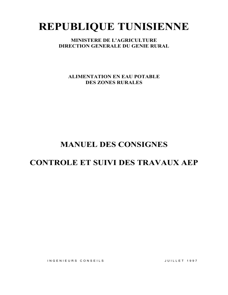 REPUBLIQUE TUNISIENNE MINISTERE DE L'AGRICULTURE DIRECTION GENERALE DU GENIE RURAL ALIMENTATION EN EAU POTABLE DES ZONES RURALES MANUEL DES CONSIGNES CONTROLE ET SUIVI DES TRAVAUX AEP INGENIEURS CONSEILS JUILLET 1997 SOMMAIRE PREFACE ......................................................................................................................................................... 5 I. PLANIFICATION DE LA REALISATION .............................................................................................. 7 1. Introduction.................................................................................................................................. 7 1.2 Méthodologie ............................................................................................................................... 7 1.3 Rappel des inconvénients constatés ............................................................................................. 8 1.4 Aspects particuliers à respecter .................................................................................................... 8 1.4.1 Etudes ..................................................................................................................... 9 1.4.2 Appel d'offres ......................................................................................................... 9 1.4.3 Réalisation .............................................................................................................. 9 1.5 Démarches détaillées relatives à la planification.......................................................................... 10 1.5.1 Etudes et préparation dossier .................................................................................. 10 1.5.2 Mise en appel d'offres ............................................................................................. 10 1.5.3 Réalisation .............................................................................................................. 10 1.6 Contrôle des délais et dates .......................................................................................................... 10 1.7 Personnel et moyens à mettre en place ......................................................................................... 11 II. PREPARATION ORGANISATIONNELLE D'UN CHANTIER ............................................................. 12 2.1 Introduction.................................................................................................................................. 12 2.2 Au niveau AGR ............................................................................................................................ 12 2.2.1 Besoin humain et de locomotion ............................................................................. 12 2.2.2 Matériel de contrôle nécessaire............................................................................... 12 2.2.3 Disponibilité des crédits et avance de démarrage ................................................... 12 2.2.4 Résolution des problèmes fonciers ......................................................................... 13 2.2.5 Fréquence de visites ................................................................................................ 13 2.2.6 Documents .............................................................................................................. 13 2.3. Au niveau du chantier ............................................................................................................... 14 2.3.1 Concertation avec l'entrepreneur............................................................................. 14 2.3.2 Dossier d'exécution ................................................................................................. 14 2.3.3 Implantation de réseau et des ouvrages................................................................... 14 2.3.4 Installation de chantier ............................................................................................ 14 2.3.5 Approbation du personnel et matériel de chantier .................................................. 15 2.3.6 Approbation matériau et matériel ........................................................................... 15 2.3.7 Planning .................................................................................................................. 15 III. ORIENTATION ET RECOMMANDATIONS DE MISE EN APPLICATION DES NOUVEAUX PLANS TYPE ET DES CAHIERS DE CHARGE .................................................................... 16 A. PLANS TYPE : APPLICATION ET PARTICULARITES D'ADAPTATION ......................................... 16 3.1 Introduction.................................................................................................................................. 16 3.2 Adaptation des plans à l'environnement ....................................................................................... 16 3.2.1 Orientation des ouvrages ........................................................................................ 16 3.2.2 Calage altimétrique des ouvrages ........................................................................... 17 3.2.3 Conseils pratiques d'implantation ........................................................................... 17 3.2.3.1 Stations de pompage et points d'eau ...................................................... 17 3.2.3.2 Réservoirs ............................................................................................. 18 3.2.3.3 Regards ................................................................................................. 18 3.3 Adaptation des plans type à l'équipement .................................................................................... 19 3.3.1 Conception de l'équipement hydro-électro-mécanique ........................................... 19 3.3.2 Adaptation des plans type .....................................