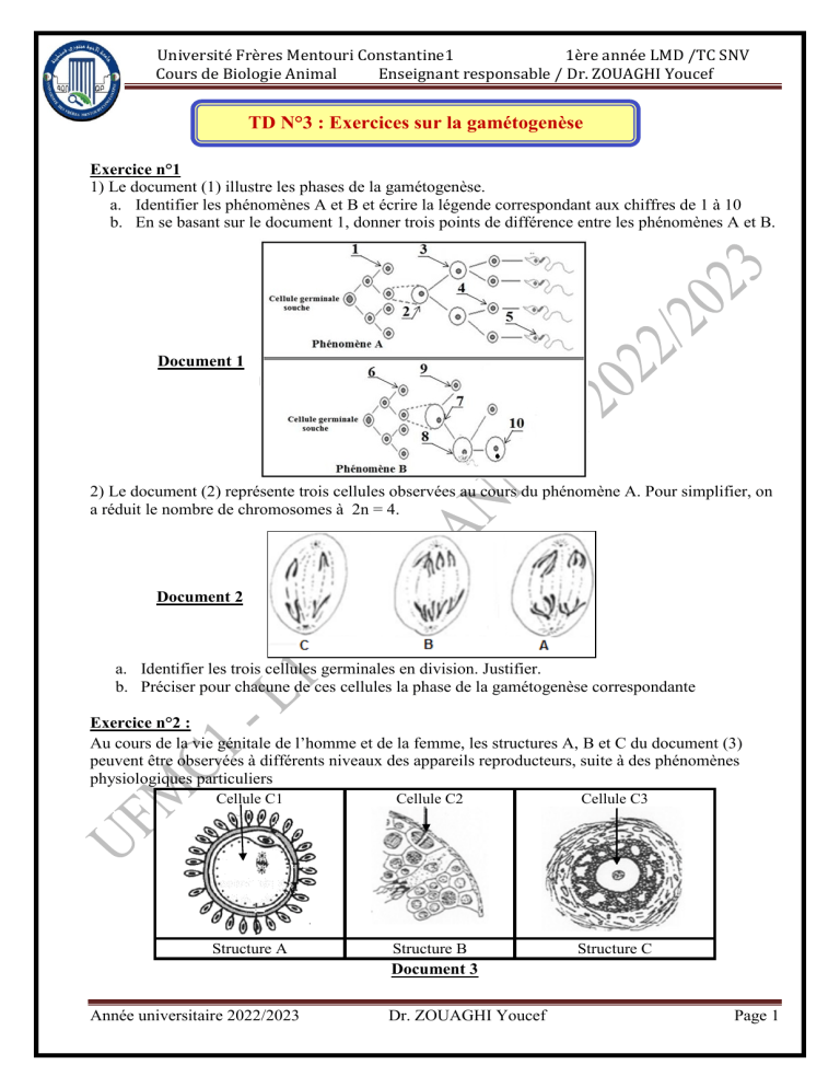 Université Frères Mentouri Constantine1 1ère année LMD /TC SNV Cours de Biologie Animal Enseignant responsable / Dr. ZOUAGHI Youcef TD N°3 : Exercices sur la gamétogenèse Exercice n°1 1) Le document (1) illustre les phases de la gamétogenèse. a. Identifier les phénomènes A et B et écrire la légende correspondant aux chiffres de 1 à 10 b. En se basant sur le document 1, donner trois points de différence entre les phénomènes A et B. Document 1 2) Le document (2) représente trois cellules observées au cours du phénomène A. Pour simplifier, on a réduit le nombre de chromosomes à 2n = 4. Document 2 a. Identifier les trois cellules germinales en division. Justifier. b. Préciser pour chacune de ces cellules la phase de la gamétogenèse correspondante Exercice n°2 : Au cours de la vie génitale de l’homme et de la femme, les structures A, B et C du document (3) peuvent être observées à différents niveaux des appareils reproducteurs, suite à des phénomènes physiologiques particuliers Cellule C1 Cellule C2 Cellule C3 Structure A Structure B Document 3 Structure C Année universitaire 2022/2023 Dr. ZOUAGHI Youcef Page 1 Université Frères Mentouri Constantine1 1ère année LMD /TC SNV Cours de Biologie Animal Enseignant responsable / Dr. ZOUAGHI Youcef 1) Nommez les structures A, B et C. 2) Nommez les cellules C1, C2 et C3. 3) Schématisez les cellules C1, C2 et C3 du document 3, en prenant 2n = 6 (4 autosomes + 2 chromosomes sexuels) 4) Indiquez : a. pour chacune des structures A et C, le phénomène physiologique à l’origine de sa formation b. pour la structure B, le phénomène physiologique observé. 5) le document (4) montre schématiquement deux cellules germinales en cours de la gamétogenèse, pour la simplification des schémas, on a utilisé 3 paires de chromosomes (deux paires d’autosomes et le paire des chromosomes sexuels XX ou XY) Cellule germinale 1 Cellule germinale 2 Document 4 Reproduisez le tableau suivant et complétez-le. Cellule germinale 1 Nom de la cellule Nom de la division Phase de la division et justification Etape de la gamétogenèse Produit de la division Cellule germinale 2 Exercice n°3 : Entourez la (les) lettre(s) correspondante(s) à la (aux) proposition(s) exacte(s) 1) La sécrétion de LH chez l’homme est conditionnée directement par le taux sanguin : a. de testostérone. b. de GnRH. c. d’inhibine. d. de FSH 2) La FSH assure : a. la maturation des spermatides. b. la différenciation des spermatides. c. le développement des tubes séminifères. d. la sécrétion de l’inhibine. 3) L’injection d’une substance chimique à une rate pubère entraine une augmentation de la sécrétion de LH. Cette substance peut être : a. la GnRH. b. la progestérone à forte dose. c. l’inhibine. d. L’œstradiol à forte dos 4) La testostérone exerce un rétrocontrôle négatif sur : a. les cellules du tractus génital. b. certaines cellules de l’hypophyse. c. les cellules de Sertoli. d. les cellules de Leydig 5) Les cellules cible par l'inhibine sont: a. cellules hypophysaires sécrétrices de FSH b. les neurones hypothalamiques. c. cellules de Leydig d. cellules de la thèque interne 6) Dans les ovaires d’une fille non pubère, on peut trouver dans la zone corticale : a. des follicules primaires. b. les restes d’un corps jaune. c. aucun follicule. d. un unique follicule mûr de De Graff. Fin Année universitaire 2022/2023 Dr. ZOUAGHI Youcef Page 2