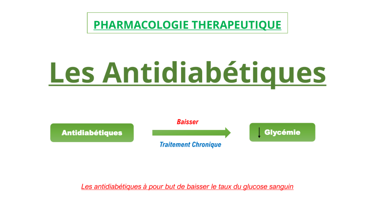 PHARMACOLOGIE THERAPEUTIQUE Les Antidiabétiques Baisser Glycémie Antidiabétiques Traitement Chronique Les antidiabétiques à pour but de baisser le taux du glucose sanguin Introduction • Le diabète est une maladie chronique qui apparaît lorsque le pancréas ne produit pas suffisamment d'insuline ou que l'organisme n'utilise pas correctement l'insuline qu'il produit. • L'insuline est une hormone qui régule la concentration de sucre dans le sang (Glycémie). Diabète de type 1 : Résulte d’une Diabète de type 2 : Caractérisé destruction des par une présence de sécrétion productrices d’insuline mais insuffisante pour cellules d’insuline. auto-immune bêta obtenir un effet physiologique. Glycémie normale à jeun = 0,70 à 1,10 g/L Symptômes du diabète : ▪ une soif intense (Polydipsie) ; ▪ le besoin d'uriner plus souvent que d'habitude (Polyurie) ▪ une vision floue ; ▪ Augmentation de l’appétit ; ▪ une sensation de fatigue ; ▪ une perte de poids involontaire. ▪ Glycémie à jeun ≥ 1,26 g/L (7mmol/L) à deux reprises ▪ Ou : Glycémie à n’importe quel moment de la journée ≥ 2 g/L (11,1mmol/L) Diagnostic du diabète : ▪ Glycémie 2 heures après administration 75g du glucose per os ≥ 2 g/L (11,1mmol/L). I- Classification du diabète Diabète de type 1 Contre Diabète de type 2 I- Classification du diabète II- Physiopathologie du diabète II- Physiopathologie du diabète 1- La résistance à l’insuline (Insulinorésistance) La "résistance à l'insuline" se traduit par une mauvaise utilisation du glucose par l'organisme et donc une glycémie plus important. Cette augmentation du taux de sucre dans le sang stimule le pancréas, qui augmente la sécrétion d'insuline pour compenser. Au bout d'un certain nombre d'années d'évolution, le pancréas s'épuise, l'intolérance au glucose apparaît, puis le diabète de type 2. II- Physiopathologie du diabète 1- La résistance à l’insuline (Insulinorésistance) Le diabète de type 2 est caractérisé par des perturbations dans la sécrétion hormonale pancréatique (diminution d'insuline et une augmentation du glucagon), ainsi que par une insulinorésistance, caractérisée par une diminution du captage de glucose par les muscles, une augmentation de la production hépatique de glucose et la présence élevée d'acides gras libres chez les diabétiques obèses. II- Physiopathologie du diabète 2- Les complications du diabète Statistiques III- Traitement du diabète 1- Généralités Stratégie thérapeutique Diabète de type 1 Diabète de type 2 ▪ Insulino-dépendant (ID) ▪ Non Insulino-dépendant (NID) ▪ Compenser la carence en insuline ▪ Limiter l’insulino-résistance ▪ Traitement substitutif ▪ Suivie de l’insulinopénie ➔ Insuline et analogues ➔ Antidiabétiques oraux (ADO) ▪ Diabétiques (T2): Insulino-requérant ➔ Insuline ➢ Mesures non pharmacologique: Le sport et la surveillance de l'alimentation font partie intégrante du traitement du diabète. Le contrôle et la surveillance des facteurs de risque : Surpoids, le tabagisme, l'excès de cholestérol et la consommation d'alcool. III- Traitement du diabète 1- Traitement du diabète de type 1 (DID) 1- Insulinothérapie (Insuline) C’est une hormone hypoglycémiante secrété par les cellules ß du pancréas, utilisée dans le traitement du DID. ➔ Le but est d’abaisser le taux de glycose dans le sang. L’insuline utilisée est d’origine humaine. Elle est produite par génie génétique tout en modifiant le génome d’une bactérie par l’introduction du gène codant pour l’insuline humaine qui sera isoler et purifier. Plusieurs types d’insulines : ▪ Insulines d’action ultra rapide ▪ Insulines d’action rapide ▪ Insulines intermédiaires ▪ Insulines d’action prolongée (Lente) ▪ Insulines mixtes 1- Traitement du diabète de type 1 (DID) a) Les insulines d’action rapide Effet entre 15 et 30 min et cesse au bout de 6 à 8H. Sa composition est pur-insuline avec un aspect clair, administrés 15min avant les repas. Utilisée aussi en cas d’urgence pour traiter ou prévenir un coma hyperglycémique. • Principales insulines d’action rapide Insuline biogénique : INSULET RAPIDE ® ; UMULINE RAPIDE®. b) Les insulines d’action ultra rapide Il s’agit d’analogue d’insuline humaine. Leur délai d’action est de 15min. Activité extrêmement immédiate du diabétique. • Principales insulines d’action Très rapide Lispro : HUMALOG®. 1- Traitement du diabète de type 1 (DID) c) Les insulines intermédiaires Action au bout de 30min jusqu’à une heure et leur durée d’action est de 12 à 18 H. elles ont un aspect trouble. Principales insulines intermédiaires • Insuline isophane : UMULINE®, INSULATARD® • Administrées par voie SC. d) Insuline à action prolongée Il agit au bout de 2 heures. Elle permet d’obtenir une concentration constante d’insuline durant toute la journée (durée d’action 24heures). Son injection se fait une fois par jour au coucher Principales insulines à action prolongée : Insuline glargine : LANTUS (100 UI/ml), Insuline détémir : LÉVÉMIR 1- Traitement du diabète de type 1 (DID) e) Insulines mixtes Composées de combinés d’insuline à action rapide et d’insuline à action intermédiaire. Ils ont un effet rapide contre la glycémie postprandiale et effet prolongé pour maintenir un taux suffisant d’insuline entre les repas. Principales insulines mixes: ➔ Actrapid 30% + Insuline intermédiaire 70% : MIXTARD® • Il existe d’autres médicaments avec divers % entre action rapide et action intermédiaire : ➔ (10/90 ; 20/80 ; 40/60 ; 50/50) 1- Traitement du diabète de type 1 (DID) 2) Différentes insulines selon le type d’injection 1. Insuline en flacon : graduée en UI : injection par seringue 0,5 ou 0,3 ml. 2. Insuline stylo auto-piqueur : Sont des cartouches d’insuline introduite dans un stylo auto piqueur. 3. Stylo p