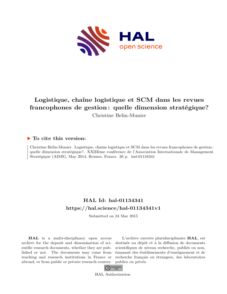 Logistique, chaîne logistique et SCM dans les revues francophones de gestion : quelle dimension stratégique? Christine Belin-Munier To cite this version: Christine Belin-Munier. Logistique, chaîne logistique et SCM dans les revues francophones de gestion : quelle dimension stratégique?. XXIIIème conférence de l’Association Internationale de Management Stratégique (AIMS), May 2014, Rennes, France. 26 p. �hal-01134341� HAL Id: hal-01134341 https://hal.science/hal-01134341v1 Submitted on 24 Mar 2015 HAL is a multi-disciplinary open access archive for the deposit and dissemination of scientific research documents, whether they are published or not. The documents may come from teaching and research institutions in France or abroad, or from public or private research centers. L’archive ouverte pluridisciplinaire HAL, est destinée au dépôt et à la diffusion de documents scientifiques de niveau recherche, publiés ou non, émanant des établissements d’enseignement et de recherche français ou étrangers, des laboratoires publics ou privés. HAL Authorization Logistique, chaîne logistique et SCM dans les revues francophones de gestion : quelle dimension stratégique ? Christine Belin-Munier Université de Bourgogne Laboratoire ThéMA, UMR 6049 [email protected] Résumé : L’objectif de cet article est de cerner le caractère stratégique de la logistique et du Supply Chain Management (SCM) tel qu’il apparaît dans les revues généralistes de gestion, afin d’avoir une vision de la nature de la diffusion de la connaissance logistique dans les sciences de gestion. Il s’appuie sur l’analyse de 62 articles parus entre 2001 et 2011 dans quatre revues de la base Cairn, accessible en ligne dans la plupart des universités : Gestion, Revue Française de Gestion, Management et Avenir, La Revue des Sciences de Gestion. Mots clés : Revue de littérature ; logistique ; supply chain management ; stratégie ; sciences de gestion 0 Logistique, chaîne logistique et SCM dans les revues francophones de gestion : quelle dimension stratégique ? Introduction L’objet de cette étude n’est pas de faire un état de l’art de la recherche en logistique sur les dix dernières années, mais de voir comment la logistique transparaît et se diffuse dans sa dimension stratégique dans les revues généralistes de gestion. S'il est indéniable, comme le montrent le nombre d'articles paru dans Logistique & Management (169 entre 2001 et 2011, hors cas d’entreprises, entretiens et éditoriaux) et la qualité croissante de ces derniers, que la recherche en logistique ne cesse de se développer en France depuis les années 1995, date des premières RIRL (Rencontres Internationales de Recherche en Logistique), il nous a paru intéressant de rechercher comment elle pénétrait les autres domaines de gestion. Pour répondre à cette question, nous nous proposons d'analyser des articles parus entre 2001 et 2011 dans des revues de gestion généralistes, non spécialisées en logistique et donc de ce fait destinées à un public de logisticiens initiés mais aussi de non logisticiens. Les articles sélectionnés ont les termes « logistique » ou « Supply Chain » (SC) ou « chaîne d’approvisionnement » dans le titre ou le résumé (ce qui inclut donc aussi management logistique, chaîne logistique, intelligence logistique, Supply Chain Management). Ces articles peuvent avoir la logistique comme objet d’étude ou comme angle d’analyse (d’un objet ou non logistique). La présence des termes logistique ou SC dans le résumé ou dans le titre les rend particulièrement visibles comme des études associées à la logistique pour des non spécialistes. Nous n’avons pas retenu dans un premier temps les articles faisant l’objet d’une approche logistique sans mention explicite. Nous avons choisi pour ces articles une base accessible en ligne dans la plupart des universités (CAIRN) et avons centré notre étude sur quatre revues généralistes de gestion : Gestion (20 articles), Revue Française de gestion (19 articles), Management & Avenir (15 articles) et La revue des Sciences de Gestion (8 articles). La gestion de la chaîne logistique a fait l’objet d’un numéro spécial dans la revue Gestion (2006/3, vol. 31) et dans la Revue Française de Gestion ( 2008/6 sur le SCM et 2005/3 sur logistique et entreprise virtuelle). Chaque article a été examiné sur son contenu, pour déterminer la définition de la logistique et/ou de la chaîne logistique et/ou du SCM retenue, la problématique étudiée, la dimension stratégique de la logistique et/ou du SCM et sur la 1 bibliographie essentiellement pour le positionnement disciplinaire. Nous allons tout d’abord présenter comment la logistique est définie aujourd’hui pas les différents auteurs étudiés (partie 1), puis nous verrons comment passer de la notion de chaîne logistique à celle de SCM stratégique (partie 2), sur l’articulation amont/aval et la place des prestataires logistiques (partie 3). 1 La logistique dans les entreprises 1.1 L’histoire de la logistique dans les entreprises Plusieurs articles font référence à l’histoire de la logistique. Cette approche historique permet de mettre en relief la place que la logistique tient aujourd’hui dans les entreprises et dans les sciences de gestion. La logistique est en effet une fonction récente et une jeune discipline qui a beaucoup évolué en l’espace d’un demi-siècle : « en un demi-siècle, le concept de logistique a considérablement évolué. Limitée dans un premier temps à une recherche d’optimisation des stocks et de leurs mouvements (années 1970-1980), la logistique, sous l’influence des contraintes de marketing, a vu sa mission s’élargir à la coordination des différentes fonctions participant à la circulation des flux au sein de l’entreprise (années 19801990). A compter des années 1990, elle est reconnue comme un véritable levier