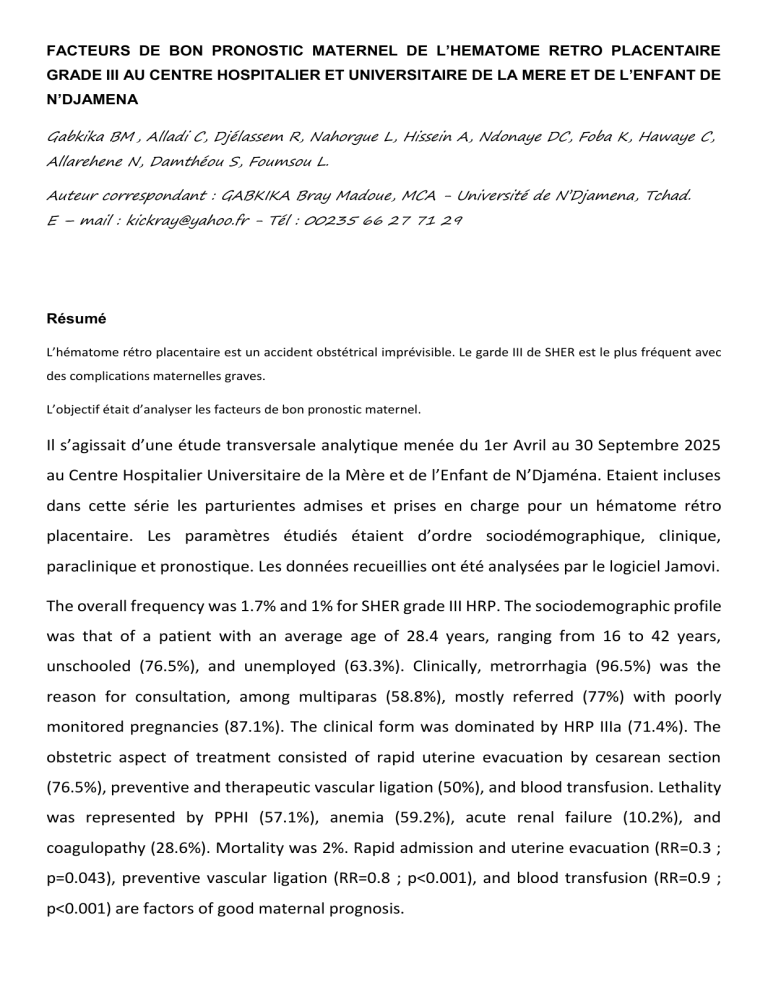 FACTEURS DE BON PRONOSTIC MATERNEL DE L’HEMATOME RETRO PLACENTAIRE GRADE III AU CENTRE HOSPITALIER ET UNIVERSITAIRE DE LA MERE ET DE L’ENFANT DE N’DJAMENA Gabkika BM , Alladi C, Djélassem R, Nahorgue L, Hissein A, Ndonaye DC, Foba K, Hawaye C, Allarehene N, Damthéou S, Foumsou L. Auteur correspondant : GABKIKA Bray Madoue, MCA - Université de N’Djamena, Tchad. E – mail : [email protected] - Tél : 00235 66 27 71 29 Résumé L’hématome rétro placentaire est un accident obstétrical imprévisible. Le garde III de SHER est le plus fréquent avec des complications maternelles graves. L’objectif était d’analyser les facteurs de bon pronostic maternel. Il s’agissait d’une étude transversale analytique menée du 1er Avril au 30 Septembre 2025 au Centre Hospitalier Universitaire de la Mère et de l’Enfant de N’Djaména. Etaient incluses dans cette série les parturientes admises et prises en charge pour un hématome rétro placentaire. Les paramètres étudiés étaient d’ordre sociodémographique, clinique, paraclinique et pronostique. Les données recueillies ont été analysées par le logiciel Jamovi. The overall frequency was 1.7% and 1% for SHER grade III HRP. The sociodemographic profile was that of a patient with an average age of 28.4 years, ranging from 16 to 42 years, unschooled (76.5%), and unemployed (63.3%). Clinically, metrorrhagia (96.5%) was the reason for consultation, among multiparas (58.8%), mostly referred (77%) with poorly monitored pregnancies (87.1%). The clinical form was dominated by HRP IIIa (71.4%). The obstetric aspect of treatment consisted of rapid uterine evacuation by cesarean section (76.5%), preventive and therapeutic vascular ligation (50%), and blood transfusion. Lethality was represented by PPHI (57.1%), anemia (59.2%), acute renal failure (10.2%), and coagulopathy (28.6%). Mortality was 2%. Rapid admission and uterine evacuation (RR=0.3 ; p=0.043), preventive vascular ligation (RR=0.8 ; p<0.001), and blood transfusion (RR=0.9 ; p<0.001) are factors of good maternal prognosis. Abstract Retroplacental hematoma is an unpredictable obstetric accident. Grade III of SHE is the most common, with severe maternal complications. The objective was to analyze the factors of good maternal prognosis. This was an analytical cross-sectional study conducted from April 1 to September 30, 2025, at the University Hospital Center for Mother and Child in N’Djamena. Included in this series were parturients admitted and managed for retroplacental hematoma. The parameters studied were sociodemographic, clinical, paraclinical, and prognostic in nature. The data collected were analyzed using Jamovi software. The overall frequency was 1.7% and 1% for SHER grade III HRP. The sociodemographic profile was that of a patient with an average age of 28.4 years, ranging from 16 to 42 years, unschooled (76.5%), and unemployed (63.3%). Clinically, metrorrhagia (96.5%) was the reason for consultation, among multiparas (58.8%), mostly referred (77%) with poorly monitored pregnancies (87.1%). The clinical form was dominated by HRP IIIa (71.4%). The obstetric aspect of treatment consisted of rapid uterine evacuation by cesarean section (76.5%), preventive and therapeutic vascular ligation (50%), and blood transfusion. Lethality was represented by PPHI (57.1%), anemia (59.2%), acute renal failure (10.2%), and coagulopathy (28.6%). Mortality was 2%. Rapid admission and uterine evacuation (RR=0.3 ; p=0.043), preventive vascular ligation (RR=0.8 ; p<0.001), and blood transfusion (RR=0.9 ; p<0.001) are factors of good maternal prognosis. Introduction L’hématome rétro placentaire (HRP) est le décollement prématuré du placenta normalement inséré (DPPNI) conduisant à l’interruption des échanges materno-foetaux [1 ; 2]. C’est un événement soudain avec un pronostic grave pour la mère et le fœtus. Il nécessite une prise en charge obstétricale doublée d'une réanimation médicale. Sa fréquence est diversement appréciée selon les auteurs: elle varie de 0,25% et 1% dans les pays industrialisés [1 ;2 ;3] et de 1 à 9 % dans les pays en développement [1]. Au Tchad, Foumsou L et al ont trouvé une fréquence de 2,1% en 2016, avec un taux de létalité maternelle de 2,4% [4]. L’hématome rétro placentaire reste une pathologie imprévisible malgré les facteurs de risque connus. Elle survient parfois alors que ces facteurs de risque sont absents [1 ; 2]. Son diagnostic est avant tout clinique, regroupant classiquement : les métrorragies faites de sang noirâtre, la contracture utérine associée à une douleur abdominale d'apparition brutale, et l’absence des bruits du cœur fœtal le plus souvent [1 ; 2]. Cette pathologie survient notamment au 3ème trimestre de la grossesse et est associée à d'importantes complications, constituant une urgence vitale pour la mère et le fœtus [1]. La mortalité maternelle liée à cette pathologie est d'environ 1/100000 naissances vivantes dans les pays industrialisés, mais peut atteindre 6% dans les pays en développement [3 ;5 ;6]. La mortalité périnatale quant à elle, est d'environ 10 à 20% dans les pays européens [1 ;2] mais peut atteindre 60 à 75% dans les pays en développement [5 ;6]. Malgré les progrès de la médecine, il reste l’une des pathologies obstétricales la plus dangereuse, grevée de complications maternelles et fœtales non négligeables. Dans la plupart des études réalisées sur l’hématome rétro placentaire, les grades I et II de SHER sont de bons pronostics maternel et fœtal car ces stades ne souffrent pas d’ambiguïté sur le plan thérapeutique. Par contre, le garde III de SHER domine en fréquence et la plupart des complications maternelles graves y sont afférentes. A cet effet, nous avons initié ce travail pour analyser les facteurs de bon pronostic maternel dans l’hématome rétro placentaire grade III de SHER au service de gynécologie-obstétrique du Centre H