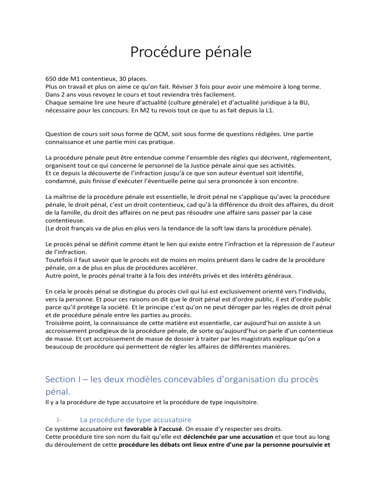 Procédure pénale 650 dde M1 contentieux, 30 places. Plus on travail et plus on aime ce qu’on fait. Réviser 3 fois pour avoir une mémoire à long terme. Dans 2 ans vous revoyez le cours et tout reviendra très facilement. Chaque semaine lire une heure d’actualité (culture générale) et d’actualité juridique à la BU, nécessaire pour les concours. En M2 tu revois tout ce que tu as fait depuis la L1. Question de cours soit sous forme de QCM, soit sous forme de questions rédigées. Une partie connaissance et une partie mini cas pratique. La procédure pénale peut être entendue comme l’ensemble des règles qui décrivent, réglementent, organisent tout ce qui concerne le personnel de la Justice pénale ainsi que ses activités. Et ce depuis la découverte de l’infraction jusqu’à ce que son auteur éventuel soit identifié, condamné, puis finisse d’exécuter l’éventuelle peine qui sera prononcée à son encontre. La maîtrise de la procédure pénale est essentielle, le droit pénal ne s’applique qu’avec la procédure pénale, le droit pénal, c’est un droit contentieux, cad qu’à la différence du droit des affaires, du droit de la famille, du droit des affaires on ne peut pas résoudre une affaire sans passer par la case contentieuse. (Le droit français va de plus en plus vers la tendance de la soft law dans la procédure pénale). Le procès pénal se définit comme étant le lien qui existe entre l’infraction et la répression de l’auteur de l’infraction. Toutefois il faut savoir que le procès est de moins en moins présent dans le cadre de la procédure pénale, on a de plus en plus de procédures accélérer. Autre point, le procès pénal traite à la fois des intérêts privés et des intérêts généraux. En cela le procès pénal se distingue du procès civil qui lui est exclusivement orienté vers l’individu, vers la personne. Et pour ces raisons on dit que le droit pénal est d’ordre public, il est d’ordre public parce qu’il protège la société. Et le principe c’est qu’on ne peut déroger par les règles de droit pénal et de procédure pénale entre les parties au procès. Troisième point, la connaissance de cette matière est essentielle, car aujourd’hui on assiste à un accroissement prodigieux de la procédure pénale, de sorte qu’aujourd’hui on parle d’un contentieux de masse. Et cet accroissement de masse de dossier à traiter par les magistrats explique qu’on a beaucoup de procédure qui permettent de régler les affaires de différentes manières. Section I – les deux modèles concevables d’organisation du procès pénal. Il y a la procédure de type accusatoire et la procédure de type inquisitoire. I- La procédure de type accusatoire Ce système accusatoire est favorable à l’accusé. On essaie d’y respecter ses droits. Cette procédure tire son nom du fait qu’elle est déclenchée par une accusation et que tout au long du déroulement de cette procédure les débats ont lieux entre d’une par la personne poursuivie et son « adversaire » qui l’accuse d’être coupable d’une infraction (le ministère public et la partie lésée). Comment se déroule un procès de type accusatoire ? Il y a trois caractéristiques. Tout d’abord le juge est un simple particulier qui a été accepté par les parties au procès et ce juge peut être récusé à tout moment Ensuite, dans le système accusatoire c’est la victime qui déclenche la procédure, ce qui signifie que le juge, celui qui va trancher ne peut pas se saisir d’office (pas d’auto-saisine). Le rôle du juge sera celui d’animer le procès. Il n’intervient même pas pour trouve la preuve, c’est aux parties d’apporter la preuve. Dans le système accusatoire il a donc un rôle passif, et se contente de dirigée les débats, de donner la parole aux parties qui vont poser des questions, apporter des réponses. Enfin elle est contradictoire, elle est publique et elle est orale la procédure contradictoire. Et in fine c’est le principe de l’intime conviction du juge qui l’emporte. Quelle valeur a cette procédure ? Dans cette procédure, on garantit les droits de la défense. C’est une sécurité de savoir qu’il y a un public, qu’il y a un contradictoire. La partie peut riposter librement et a les mêmes droits que l’accusateur. Dans les inconvenants : Si la victime ne se manifeste pas, par peur, par ignorance, ne se manifeste pas, l’auteur de l’infraction ne fait pas l’objet de poursuites. C’est la place du juge, même si le juge a l’impression d’avoir des indices ou preuves, il ne peut pas intervenir. (La justice pénale n’est pas juste, c’est un droit qui s’applique). B- la procédure inquisitoire. (Voir le roman de la rose, un film sur l’inquisition). Cette procédure est favorable à la répression et privilégie donc l’intérêt social sur l’intérêt de la personne poursuivie. La procédure inquisitoire tient son origine du droit de l’empire romain et surtout de la procédure ecclésiastique devant les tribunaux de l’inquisition. Le juge n’est plus une partie privée, c’est un fonctionnaire public, il est permanent, il est imposé aux parties. C’est le juge « accusateur » qui déclenche le procès pénale (en France c’est le ministère public). Tout au long du procès pénal, le ministère public et le juge de jugement ont un rôle actif dans la recherche des preuves, il peut demander un témoignage, une perquisition. Quant à la procédure elle est secrète (cad pas de publicité, pas d’information de l’accusé parfois), elle est écrite, on statue sur les pièces sans défense orale et elle est surtout non-contradictoire. Le principale avantage c’est que la répression est énergique et rapide. Inconvénient, les droits de la défense n’existe pas, il n’y a pas de preuve contraire qui existe, le contradictoire n’est pas autorisé. Ce qui engendre un risque d