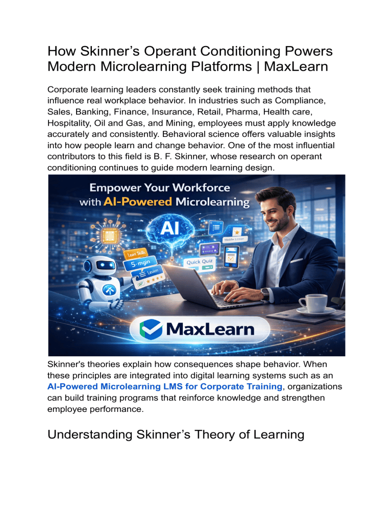 How Skinner’s Operant Conditioning Powers Modern Microlearning Platforms | MaxLearn Corporate learning leaders constantly seek training methods that influence real workplace behavior. In industries such as Compliance, Sales, Banking, Finance, Insurance, Retail, Pharma, Health care, Hospitality, Oil and Gas, and Mining, employees must apply knowledge accurately and consistently. Behavioral science offers valuable insights into how people learn and change behavior. One of the most influential contributors to this field is B. F. Skinner, whose research on operant conditioning continues to guide modern learning design. Skinner's theories explain how consequences shape behavior. When these principles are integrated into digital learning systems such as an AI-Powered Microlearning LMS for Corporate Training, organizations can build training programs that reinforce knowledge and strengthen employee performance. Understanding Skinner’s Theory of Learning Skinner's theory of learning focuses on the relationship between actions and outcomes. According to Skinner's operant conditioning, individuals tend to repeat behaviors that produce positive results and avoid behaviors that lead to negative consequences. The learning theory of Skinner outlines four mechanisms that influence learning: Positive reinforcement, encouraging correct behavior through rewards Negative reinforcement, removing an unfavorable condition when the correct behavior occurs Punishment, discouraging incorrect behavior Extinction, weakening behavior when reinforcement is removed This framework, commonly referred to as Skinnerian Conditioning, highlights how reinforcement and feedback influence long-term behavioral patterns. Many learning theories Skinner introduced emphasize that learning improves when individuals receive immediate responses to their actions. Lessons from Skinner’s Experiment Skinner's experiment demonstrated how reinforcement schedules influence behavior over time. By observing responses under different reinforcement conditions, he showed that behavior could be gradually shaped through structured feedback and consistent consequences. Although these experiments were originally conducted in controlled settings, the theory of Skinner in learning is highly relevant in modern workplaces. Employees benefit from training experiences that provide continuous feedback and opportunities to practice decision-making. Traditional learning models often rely on lengthy training sessions that offer limited reinforcement. Employees may complete training but struggle to apply knowledge consistently. As a result, many organizations are adopting Microlearning Platforms that support reinforcement-driven learning experiences. Microlearning Platforms and Behavioral Learning Microlearning platforms provide a practical method for applying Skinner's learning theories in corporate training. A Microlearning Platform divides complex topics into smaller learning experiences, allowing employees to engage with content frequently. Microlearning courses designed using operant conditioning principles typically include: Scenario-based activities that encourage decision-making Immediate feedback after learner responses Recognition that reinforces correct actions Repetition that strengthens knowledge retention These elements align with the principles described by learning theorists Skinner and support behavior-focused training programs. AI-Powered Microlearning LMS for Corporate Training Modern technology allows organizations to apply behavioral learning models at scale. An AI-powered Microlearning LMS for corporate training uses data insights to personalize learning experiences for each employee. Advanced microlearning software can analyze engagement patterns and recommend targeted microlearning courses based on performance data. A microlearning application supported by intelligent analytics ensures that employees receive relevant learning experiences that strengthen knowledge over time. Additionally, Microlearning Authoring Tools allow learning teams to quickly develop interactive modules aligned with reinforcement-based learning strategies. These microlearning tools help organizations deliver effective training programs across industries, including Banking, Finance, Healthcare, Retail, and energy sectors such as Oil and Gas and Mining. Advancing Enterprise Learning with MaxLearn The work of learning theorists, Skinner, remains highly relevant for modern enterprise learning. By applying the learning theory of Skinner within digital training systems, organizations can create environments that reinforce knowledge and encourage consistent behavior. Microlearning platforms that integrate operant conditioning principles enable continuous reinforcement and measurable learning outcomes. When supported by advanced microlearning software and intelligent learning systems, these platforms allow organizations to deliver scalable training strategies. MaxLearn demonstrates how behavioral science and digital innovation can strengthen corporate learning. Through an AI-powered microlearning LMS for corporate training, MaxLearn helps organizations design impactful Microlearning Courses that reinforce skills, support compliance standards, and improve workforce performance across multiple industries.