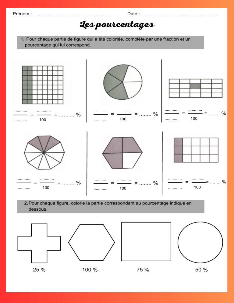 Prénom : ........................................................... Date : ........................................................... Les pourcentages 1. Pour chaque partie de figure qui a été coloriée, complète par une fraction et un pourcentage qui lui correspond. ............ = ............ ............ ............ ............ = = .......... % ............ = ............ 100 ............ 100 ............ ............ ............ 100 = ........ % ............ = = ........ % ............ = ............ ............ = ........ % 100 ............ = ....... % 100 = ............ ............ = ........ % 100 2. Pour chaque figure, colorie la partie correspondant au pourcentage indiqué en dessous. 25 % 100 % 75 % 50 % Prénom : ........................................................... Date : ........................................................... 3. Complète ce tableau. Pourcentage Fraction décimale ............ 18 % ............ 4 ............ 100 625 ............ 1000 ............ 80% ............ ............ 250 % ............ 4. Transforme ces fractions en pourcentages. X5 Exemple : 7 = 20 35 = 35 % 100 X5 14 25 14 8 2 5 17 20 7 8 63 90 = = .......... % 100 = = .......... % = = .......... % = = .......... % = = .......... % = = Parfois, il est nécessaire de passer par une étape intermédiaire avant de trouver la fraction décimale. = .......... % Prénom : ........................................................... Date : ........................................................... 5. Résous ce problème. Ce rectangle représente le plan d’un restaurant. Colorie : - en bleu, 10% réservés pour les toilettes ; - en vert, les 20% attribués à l’espace cuisine ; - en rouge, les 15% pour la réserve ; - en jaune, les 55% qui sont pour la salle. Échelle : 1 200 Calcule en m² (taille réelle) les différents espaces de ce restaurant. Toilettes : ........................................................................................................................................... Cuisine : ............................................................................................................................................. Réserve : ........................................................................................................................................... Salle : ................................................................................................................................................. 6. Calcule. 7% de 800 = ......................................................................................................................................... 48% de 200 = ....................................................................................................................................... 150% de 600 = ........................................................................................................................................ Prénom : ........................................................... Date : ........................................................... 90% de 7 000 = ................................................................................................................................... 20% de 250 = ....................................................................................................................................... 50% de 324 = ........................................................................................................................................ 30% de 140 = ....................................................................................................................................... 18% de 900 = ....................................................................................................................................... 75% de 36 = ........................................................................................................................................ 7. Résous ces problèmes. A. Dans une classe de 30 élèves, 20 % d’entre eux portent des lunettes. Combien d’élèves portent des lunettes ? Phrase réponse : .................................................................................................................................... B. M. Durant a enfin commandé sa nouvelle voiture pour la somme de 18 900 €. Il a déjà versé un acompte de 30% lors de la commande. Quelle somme lui reste-t-il payer ? Phrase réponse : .................................................................................................................................... Prénom : ........................................................... Date : ........................................................... C. Un livre coûte 15€. Pendant une vente, son prix est réduit de 30%. Quel est le nouveau prix du livre ? Phrase réponse : ........................................................................................................................... D. Une boutique a vendu 40% de ses 250 vêtements pendant une promotion. Combien de vêtements ont été vendus ? Phrase réponse : ........................................................................................................................... E. Dans un village, on interroge 800 habitants. 75 % des habitants disent aimer le football. Combien d’habitants aiment le football ? Phrase réponse : ........................................................................................................................... F. Sur une journée, une boulangerie fabrique 1200 baguettes. Si 25% des baguettes sont aux céréales, combien de baguettes aux céréales sont fabriquées ? Phrase réponse : ........................................................................................................................... Prénom : ........................................................... Date : ........................................................... Les pourcentages devoirs 