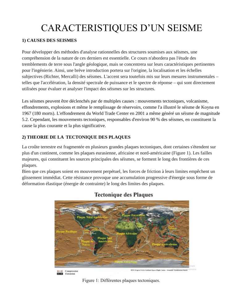 CARACTERISTIQUES D’UN SEISME 1) CAUSES DES SEISMES Pour développer des méthodes d'analyse rationnelles des structures soumises aux séismes, une compréhension de la nature de ces derniers est essentielle. Ce cours n'abordera pas l'étude des tremblements de terre sous l'angle géologique, mais se concentrera sur leurs caractéristiques pertinentes pour l'ingénierie. Ainsi, une brève introduction portera sur l'origine, la localisation et les échelles subjectives (Richter, Mercalli) des séismes. L'accent sera toutefois mis sur leurs mesures instrumentales – telles que l'accélération, la densité spectrale de puissance et le spectre de réponse – qui sont directement utilisées pour évaluer et analyser l'impact des séismes sur les structures. Les séismes peuvent être déclenchés par de multiples causes : mouvements tectoniques, volcanisme, effondrements, explosions et même le remplissage de réservoirs, comme l'a illustré le séisme de Koyna en 1967 (180 morts). L'effondrement du World Trade Center en 2001 a même généré un séisme de magnitude 5.2. Cependant, les mouvements tectoniques, responsables d'environ 90 % des séismes, en constituent la cause la plus courante et la plus significative. 2) THEORIE DE LA TECTONIQUE DES PLAQUES La croûte terrestre est fragmentée en plusieurs grandes plaques tectoniques, dont certaines s'étendent sur plus d'un continent, comme les plaques eurasienne, africaine et nord-américaine (Figure 1). Les failles majeures, qui constituent les sources principales des séismes, se forment le long des frontières de ces plaques. Bien que ces plaques soient en mouvement perpétuel, les forces de friction à leurs limites empêchent un glissement immédiat. Cette résistance provoque une accumulation progressive d'énergie sous forme de déformation élastique (énergie de contrainte) le long des limites des plaques. Figure 1: Différentes plaques tectoniques. Figure 2 : Identification d’une faille Faille Normale Faille inverse Décrochement Figure 3 : Différents types de failles Lorsque l'énergie accumulée dépasse la capacité de résistance des forces de friction, une rupture se produit soudainement le long des failles : c'est le phénomène de rebond élastique. Cette libération brutale d'énergie génère des ondes sismiques qui se propagent dans toutes les directions, marquant le début d'un séisme. La Figure 4 présente les différents types d'ondes sismiques ainsi produites. Les ondes de déformation se divisent en deux catégories principales : les ondes de volume et les ondes de surface. Les ondes de volume comprennent : Les ondes P(primaires), rapides ; Les ondes S(secondaires ou de cisaillement), plus lentes. Application pratique: Cette différence de vitesse permet de localiser la source sismique. En mesurant le délai entre l'arrivée des ondes P et des ondes S sur un sismographe, on peut calculer la distance entre le site de mesure et l'épicentre du séisme. Les ondes de surface se classent en ondes de Rayleigh (R) et ondes de Love (L), dont les modes d'oscillation sont illustrés dans la Figure 4. Il est important de noter que ces ondes se propagent dans des milieux géologiques complexes, qui les modifient de multiples façons : amplification, atténuation, filtration, réflexion ou réfraction. Ces transformations aléatoires font que chaque site enregistre un profil d'onde unique, rendant très difficile la prédiction des caractéristiques sismiques en un lieu donné. Cette forte incertitude quant aux sollicitations sismiques nécessite le recours à une approche probabiliste pour la conception parasismique. Ainsi, la sécurité et la survie des structures reposent sur une modélisation statistique des excitations sismiques possibles. Les sections suivantes présenteront les grandeurs couramment utilisées pour caractériser les séismes. 3) MESURES DES SEISMES Pour quantifier un séisme, on distingue deux grandeurs fondamentales : La magnitude, qui mesure l'énergie libérée à la source (la "taille" du séisme) ; L'intensité, qui évalue les effets ressentis en un lieu donné. La Figure 5 illustre les composantes d'un séisme et précise la localisation de ces deux mesures. 3.1) Magnitude La magnitude mesure l'énergie libérée à la source d'un séisme. Elle est quantifiée par l'échelle de Richter, qui utilise une échelle logarithmique définie par la relation : M = log A où A représente l'amplitude des ondes sismiques (en micromètres), mesurée par un sismomètre de type Wood-Anderson. Interprétation des valeurs de magnitude : M = 1-2 : : Micro séisme, généralement non perceptible M < 5 : Séisme mineur, ne causant généralement pas de dommages structuraux M ≥ 5 : Séisme modéré à fort, susceptible de provoquer des dommages structuraux M = 8-9 : Séisme majeur, causant les dommages structuraux les plus importants Important : La magnitude M ne mesure pas la destructivité locale d'un séisme. Elle quantifie uniquement l'énergie totale libérée à la source. L'intensité des mouvements du sol diminue avec la distance à l'épicentre, ce qui explique qu'un séisme de forte magnitude peut produire des effets variables selon l'éloignement de la faille. 3.2) Intensité L'intensité est une mesure subjective de la destructivité locale d'un séisme en un site donné. Contrairement à la magnitude, elle est évaluée à partir des témoignages humains et des observations des effets sur l'environnement. L'échelle la plus utilisée est l'échelle de Mercalli Modifiée (MM), qui comporte douze degrés. Une illustration est présentée ci-dessous: I : Non perceptible. III : Perçu à l'intérieur des bâtiments ; vibrations légères. V : Perçu à l'extérieur ; réveil des dormeurs ; oscillation des objets. VII : Difficulté à rester debout ; chutes de plâtre ; dommages mineurs. IX : Panique générale ; maçonnerie faible détruite, maçonnerie ordinaire fortement endommagée. X : Destruction
