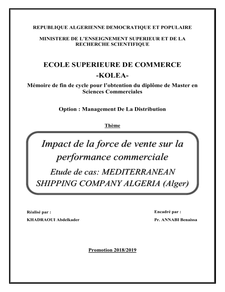 REPUBLIQUE ALGERIENNE DEMOCRATIQUE ET POPULAIRE MINISTERE DE L’ENSEIGNEMENT SUPERIEUR ET DE LA RECHERCHE SCIENTIFIQUE ECOLE SUPERIEURE DE COMMERCE -KOLEAMémoire de fin de cycle pour l’obtention du diplôme de Master en Sciences Commerciales Option : Management De La Distribution Thème Impact de la force de vente sur la performance commerciale Etude de cas: MEDITERRANEAN SHIPPING COMPANY ALGERIA (Alger) (ALGER) Réalisé par : Encadré par : KHADRAOUI Abdelkader Pr. ANNABI Benaissa Promotion 2018/2019 Remerciement Remerciement Au terme de ce modeste travail nous tenons à remercier vivement tous ceux qui ont contribué de près ou de loin à sa réalisation. Nous tenons à remercier en premier, le bon Dieu de nous avoir donné la foi, la force et le courage pour réaliser ce travail dans de bonnes conditions. Nos remerciements s’adressent également à l’ensemble du personnel de la direction commerciale de l’entreprise MSCA qui nous a été d’une aide très précieuse durant toute la durée de notre stage au sein de l’entreprise Nous exprimons également notre gratitude à notre encadreur, Mr. ANNABI Benaissa, pour son aide précieuse, ses conseils et sa grande contribution à ce travail. Nous remercions vivement l’ensemble des enseignants du département marketing de l’école supérieur de commerce- Kolea- Tipaza et surtout ceux qui ont été nos enseignants durant notre cursus universitaire. Aussi, nous remercions tous ce qui a ont contribué à ce travail de près ou de loin, notamment nos familles et nos amis. Espérons que ce modeste travail sera un guide pour les étudiants à venir i|Page Dédicace Dédicace J’ai le grand plaisir, et le louable honneur de partager l’hilarité Qu’a suscité la réalisation de ce travail Avec tous les miens, et tous ceux qui m’ont aidé, Et participer de près ou de loin à la finalisation de ce travail. En premier lieu je dédier cette réalisation À mes chers parents Qui m’ont toujours soutenu Et aidé tout au long de mon parcours, Qui ne cesse de se sacrifier pour le bien de leurs enfants. Et tous ceux que j’aime Et qui sont chers à mon cœur ii | P a g e Liste des figures N° de Figure Titre Page Figure N°01 La mise en place de la force de vente 16 Figure N°02 Structure de la force de vente par secteur 24 Figure N°03 Structure de la force de vente par produit. 26 Figure N°04 Structure de la force de vente par marché 27 Figure N°05 Source de la performance 61 Figure N°06 Liens entre performance et autres concepts 62 Figure N°07 Le principe de composition du tableau de bord 83 Figure N°08 L’évolution de la part de marché de MSCA 111 Figure N°09 L’évolution du nombre de clients de MSCA 112 iii | P a g e Liste des tableaux N° de tableau Titre Page Tableau N°01 Force et faiblesse de la force de vente 20 Tableau N°02 Avantages et inconvénients de la structure géographie 25 Tableau N°03 Avantages en inconvénient de la structure par produit 26 Tableau N°04 Avantages et inconvénients de la structure par client ou par 28 marché. Tableau N°05 Avantages et inconvénients des différents types de force de vente 30 Tableau N°06 Typologies de la force de vente 31 Tableau N°07 Comparaison entre les différents statuts de la force de vente 33 Tableau N°08 Exemple de l’analyse marginale 34 Tableau N°09 Les deux approches de formation 42 Tableau N°10 Formation inter ou intra-entreprise. 43 Tableau N°11 L’auto-formation (autodidaxie : apprentissage par soi-même) 44 Tableau N°12 Les avantages et les inconvénients du système fixe 47 Tableau N°13 Les avantages et les inconvénients de la commission. 48 Tableau N°14 Classement des compagnies maritime en Algérie en 2018 97 Tableau N°15 L’évolution de la part de marché de MSCA 110 Tableau N°16 L’évolution du nombre de clients de MSCA 112 iv | P a g e Glossaire et liste d’abréviations BAD : bon à délivrer CA : Chiffre d’affaire CRM : Customer Relationship Management CS : Customer Service DA : Dinars Algériens DG : Direction Générale DRH : Direction des Ressources Humaines EVP : équivalent 20 pieds FDV : Force de Vente GIF : Gate in Full GOF : Gate Out Full GVA : Genève PDM : Part De Marché POL : (Port Of Loading) port de chargement POD : (Port Of Discharge) port de déchargement RDV : rendez-vous SVR : Sales Visit Report VRP : Voyageur Représentant Placier Frais de magasinage : sont les charges liées à la location de l’espace au port sec. Empotage (GIF : Gate In Full) : action e mettre la marchandise dans un conteneur, c’est-à-dire chargement de la marchandise dans le conteneur Dépotage : (GOF : Gate Out Full) retirer la marchandise du conteneur, c’est-à-dire déchargement de la marchandise du conteneur v|Page Cotation : tarification et fixation des prix de l’offre du transport maritime BL (BILL OF LADING) : connaissement ; une liste détaillée d’une expédition de marchandise sous la forme d’un accusé de réception remise par le transporteur à l’expéditeur des marchandises. Draft BL: brouillon bill of lading (instruction BL) Accostage : arrivée du navire au port CFR : prepaid ; le fret de transport maritime est payé au port de chargement par le fournisseur ELESWHERE : le fret de transport maritime est payé ni au port de chargement ni au port de déchargement, le fret est payé dans une autre agence MSC. FOB : collecte le fret de transport maritime est payé au port de déchargement par le client Franchise : C’est la durée de temps dont dispose le client afin d’enlever sa marchandise et restituer le conteneur (15 jours pour les conteneurs non frigorifiés et 3 jours pour les frigorifiques). Free out : les frais de débarquement de la marchandise du navire Free in : embarquement de la marchandise au navire Manifeste : c’est un document qui reprend toutes les informations concernant la marchandise expédie. Sellait : Cadenas de conteneur Surestarie : dépassement du temps convenu par contrat 