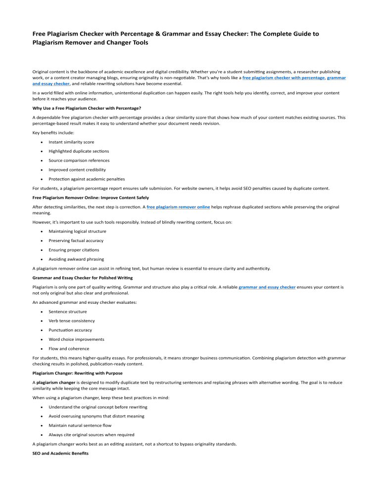 Free Plagiarism Checker with Percentage & Grammar and Essay Checker: The Complete Guide to Plagiarism Remover and Changer Tools Original content is the backbone of academic excellence and digital credibility. Whether you're a student submitting assignments, a researcher publishing work, or a content creator managing blogs, ensuring originality is non-negotiable. That’s why tools like a free plagiarism checker with percentage, grammar and essay checker, and reliable rewriting solutions have become essential. In a world filled with online information, unintentional duplication can happen easily. The right tools help you identify, correct, and improve your content before it reaches your audience. Why Use a Free Plagiarism Checker with Percentage? A dependable free plagiarism checker with percentage provides a clear similarity score that shows how much of your content matches existing sources. This percentage-based result makes it easy to understand whether your document needs revision. Key benefits include: • Instant similarity score • Highlighted duplicate sections • Source comparison references • Improved content credibility • Protection against academic penalties For students, a plagiarism percentage report ensures safe submission. For website owners, it helps avoid SEO penalties caused by duplicate content. Free Plagiarism Remover Online: Improve Content Safely After detecting similarities, the next step is correction. A free plagiarism remover online helps rephrase duplicated sections while preserving the original meaning. However, it’s important to use such tools responsibly. Instead of blindly rewriting content, focus on: • Maintaining logical structure • Preserving factual accuracy • Ensuring proper citations • Avoiding awkward phrasing A plagiarism remover online can assist in refining text, but human review is essential to ensure clarity and authenticity. Grammar and Essay Checker for Polished Writing Plagiarism is only one part of quality writing. Grammar and structure also play a critical role. A reliable grammar and essay checker ensures your content is not only original but also clear and professional. An advanced grammar and essay checker evaluates: • Sentence structure • Verb tense consistency • Punctuation accuracy • Word choice improvements • Flow and coherence For students, this means higher-quality essays. For professionals, it means stronger business communication. Combining plagiarism detection with grammar checking results in polished, publication-ready content. Plagiarism Changer: Rewriting with Purpose A plagiarism changer is designed to modify duplicate text by restructuring sentences and replacing phrases with alternative wording. The goal is to reduce similarity while keeping the core message intact. When using a plagiarism changer, keep these best practices in mind: • Understand the original concept before rewriting • Avoid overusing synonyms that distort meaning • Maintain natural sentence flow • Always cite original sources when required A plagiarism changer works best as an editing assistant, not a shortcut to bypass originality standards. SEO and Academic Benefits Duplicate content can harm search engine rankings and academic credibility. By combining a free plagiarism checker with percentage, grammar and essay checker, and responsible rewriting tools, you can: • Improve SEO performance • Enhance readability • Increase trust and authority • Protect academic integrity • Strengthen brand reputation Original, well-written content performs better both in search engines and in academic evaluations. Final Thoughts Maintaining originality and clarity is essential in today’s competitive content environment. Whether you rely on a free plagiarism checker with percentage, use a free plagiarism remover online, refine your writing with a grammar and essay checker, or carefully apply a plagiarism changer, the ultimate goal remains the same — authentic, high-quality communication. True credibility comes not just from passing a plagiarism test, but from producing meaningful, well-structured, and original content every time.