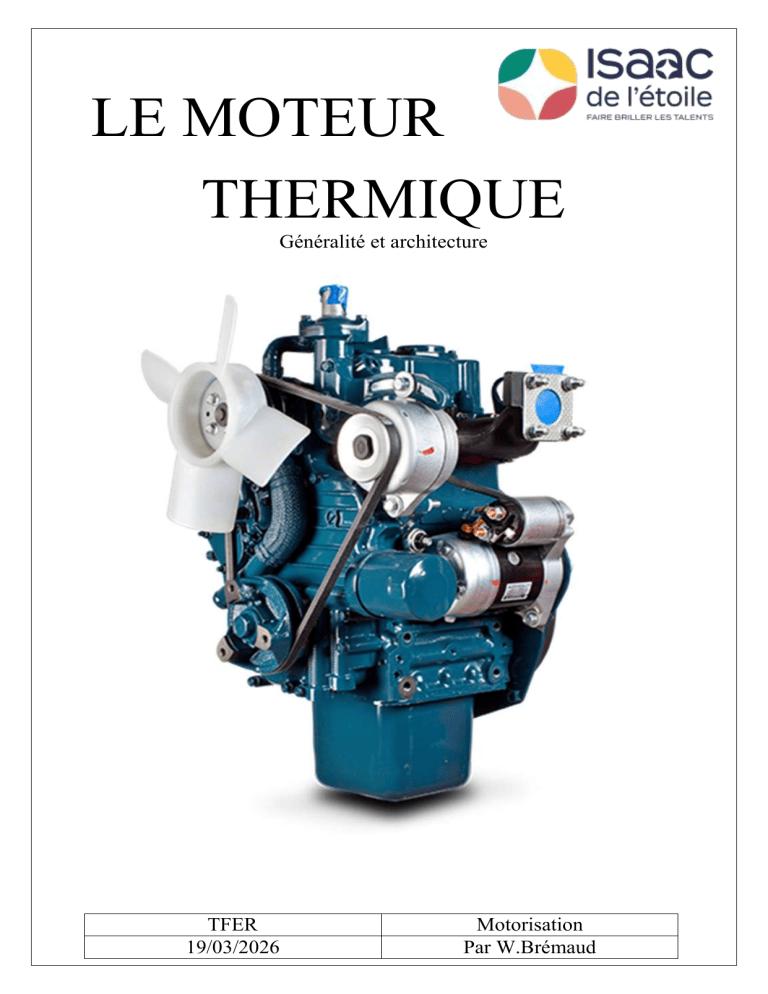 LE MOTEUR THERMIQUE Généralité et architecture TFER 19/03/2026 Motorisation Par W.Brémaud Page 2 sur 57 INTRODUCTION Ces moteurs peuvent être nommés : - 2 temps ou 4 temps, - Monocylindre, 4, 6, 8 cylindres ou plus, - En ligne(1), en V(2), à plat(3), - Essence, diesel ou gaz Un mélange homogène air et carburant (Energie chimique) soumis à une forte chaleur créé une combustion qui, par les organes du moteur, sera transformée en mouvement circulaire (Energie mécanique). Détailler les caractéristiques du moteur D1105 ? Nombre de temps : Nombres de cylindre : Position des cylindres : Type d’énergie : Page 3 sur 57 FONCTION GLOBALE (ROLE) Page 4 sur 57 LE CYCLE A QUATRE TEMPS THEORIQUE On appelle cycle l’ensemble des opérations qui se succèdent dans le moteur, avant qu’il se retrouve dans les conditions initiales. C’est quelque chose qui recommence. On appelle temps le déplacement d’une course de piston soit une rotation de 180° du vilebrequin. Le cycle qui comporte quatre courses de piston est appelé cycle à quatre temps. (720°) Page 5 sur 57 LE CYCLE A 4 TEMPS DIESEL 1er temps Afin d’obtenir une combustion, le gasoil a besoin d’être soumis à une forte température. Pour cela, le moteur à combustion comprime un volume d’air. (« Si la pression augmente, la température augmente ») Il faut donc faire pénétrer de l’air frais dans le cylindre. C’est le rôle du premier temps, le temps admission. La soupape d’admission (bleue) va donc s’ouvrir pour permettre le passage de l’air et le piston va descendre afin de l’aspirer. Soupape admission Ouverte 1er temps ADMISSION Soupape Piston échappement Fermée Descend L’air frais est aspiré 2ème temps Page 6 sur 57 Une fois l’air dans le cylindre, et le piston au point le plus bas (Point Mort Bas PMB), la soupape d’admission se ferme. L’air est enfermé dans le cylindre. Lors de la remontée du piston vers le Point Mort Haut (PMH), l’air est comprimé, ce qui permet l’élévation de la température. C’est le temps compression. Soupape admission Fermé 2ème temps COMPRESSION Soupape Piston échappement Fermée Monte L’air frais est comprimé 3ème temps Page 7 sur 57 Une fois la température souhaitée attente, le gasoil est pulvérisé en fine gouttelette sur la tête du piston. En rentrant en contact avec cette température, le gasoil s’autoenflamme quasiment instantanément. (Combustion) Cela entraine une forte montée en pression qui pousse violement le piston vers le bas. (Détente) 3ème temps / 1ère phase COMBUSTION (0.02 secondes) Soupape admission Fermée Soupape échappement Fermée Piston PMH Le gasoil s’enflamme 3ème temps / 2ème phase DETENTE Soupape admission Fermée Soupape échappement Fermée Piston Descend Le piston est repoussé vers le bas 4ème temps Page 8 sur 57 Une fois le 3ème temps terminé, le cylindre est rempli de gaz d’échappement qu’il va falloir évacuer afin de commencer un nouveau cycle. Soupape admission Fermée 4ème temps ECHAPPEMENT Soupape Piston échappement Ouverte Monte Les gaz sont évacués IDENTIFICATION MOTEUR : Page 9 sur 57 Le moteur comme tous les composant d’un groupe frigorifique est équipé d’une plaque du constructeur permettant de connaitre le type et le numéro de série du moteur. Selon le constructeur, elle peut prendre différente forme. Guide d'identification des moteurs Kubota Numéros de moteur de production avant mai 2012 : À partir de juin 2012, numéros de moteur de production : Où trouver le numéro de série ? Le numéro de série est marqué à l'emplacement spécifié par série de moteurs, comme indiqué ci-dessous. Le suffixe (séparé par un ou plusieurs tirets) précise les fonctionnalités du moteur : Page 10 sur 57 Code Fonctionnalité T Turbocompressé (sans ce code signifie à aspiration naturelle) DI Injection directe (sans ce code signifie injection indirecte) CR Système d'injection directe à rampe commune I Refroidi Identification des moteurs Thermo King Norme respectée Famille de moteur Date de fabrication Type Modèle LES ORGANNES PRINCIPAUX Tous les moteurs sont constitués de 4 organes principaux. Page 11 sur 57 LES SOUS-SYSTEMES Page 12 sur 57 Pour que le moteur assure son rôle sur le long terme, plusieurs sous-systèmes sont indispensables. ELEMENTS CONSTITUTIFS Page 13 sur 57 L’ENCEINTE THERMIQUE (cylindrée) Elle est formée par la chambre de combustion v et le cylindre V du bloc moteur. Page 14 sur 57 Elle permet de comprimer un volume compris dans l’enceinte thermique (V+v) à la chambre de combustion (v). Cela entraine une montée en pression et température de l’air afin de permettre la combustion du carburant. Ce volume doit être étanche et est mesuré en cm3 et/ou en litres (1000cm3 1L) Quel est la cylindrée du moteur D1105 ? ____________________cm3 ____________________Litres L’EQUIPAGE MOBILE Page 15 sur 57 Il permet la transformation de la poussée des gaz lors de la combustion en un mouvement circulaire. LE PISTON Le piston est composé d’une calotte (tête) ; partie supérieure et d’une jupe en alliage léger ; partie inferieur. Page 16 sur 57 Il permet de transmettre à la bielle la pression des gaz. LES SEGMENTS Les segments sont au nombre de trois en général ou quatre : Page 17 sur 57 1-_______________________________ : permet l’étanchéité de la chambre de combustion. 2-_______________________________ : évite les remontées d’huile. 3-_______________________________ : récupère l’huile sur la chemise et le renvoi dans le piston. Les coupes de segments doivent être placées tous les 120° afin d’éviter la perte d’étanchéité, c’est le phénomène de la « cheminée ». Les segments ont un sens de montage repéré par une frappe. Dommages de la tête de piston Grippage par surchauffe (concentré sur la tête du Page 18 sur 57 piston) Surchauffe due à des dysfonctionnements de combustion Gicleur d'huile déformé/bouché 